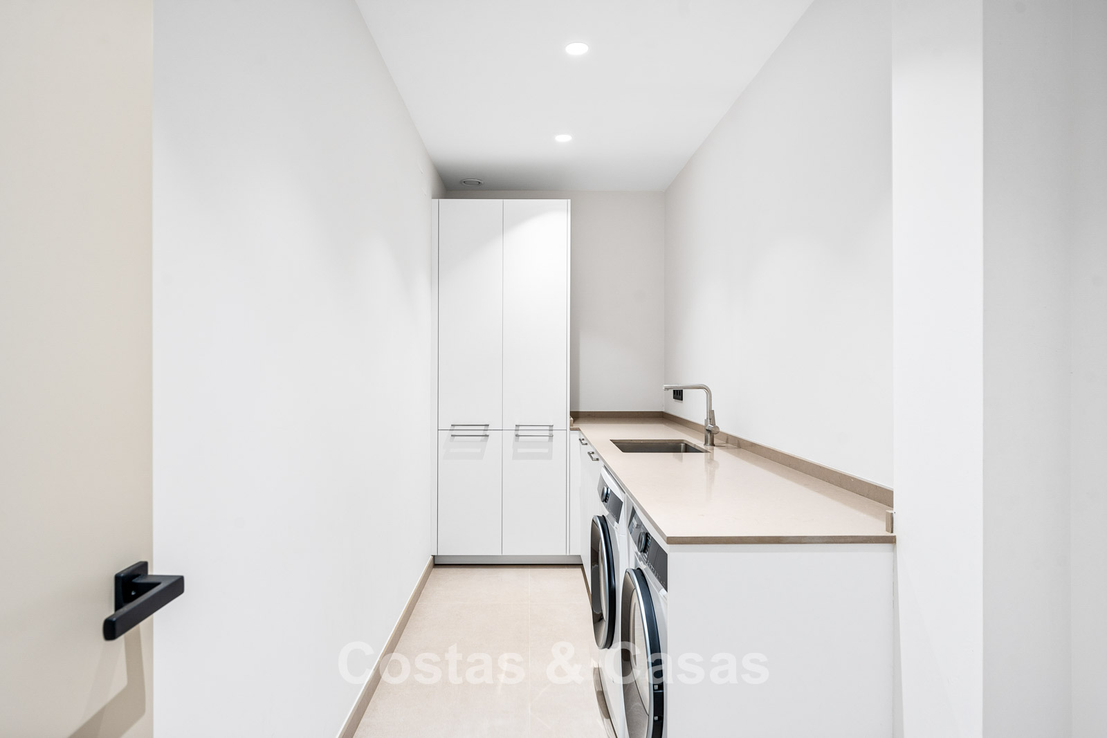 Balustrades en verre. Climatisation pour le refroidissement et le chauffage. Chauffage par le sol. Armoires encastrées. Système domotique avancé. Système de musique intégré. Eclairage extérieur.