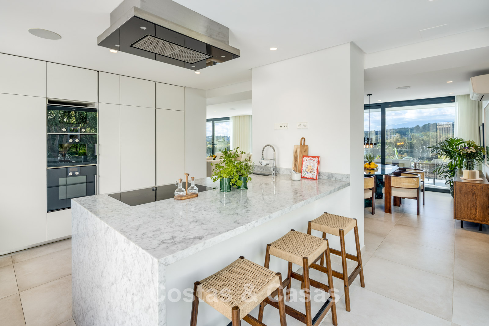 Cuisine spacieuse, entièrement équipée avec des appareils Gaggenau et un îlot central.
