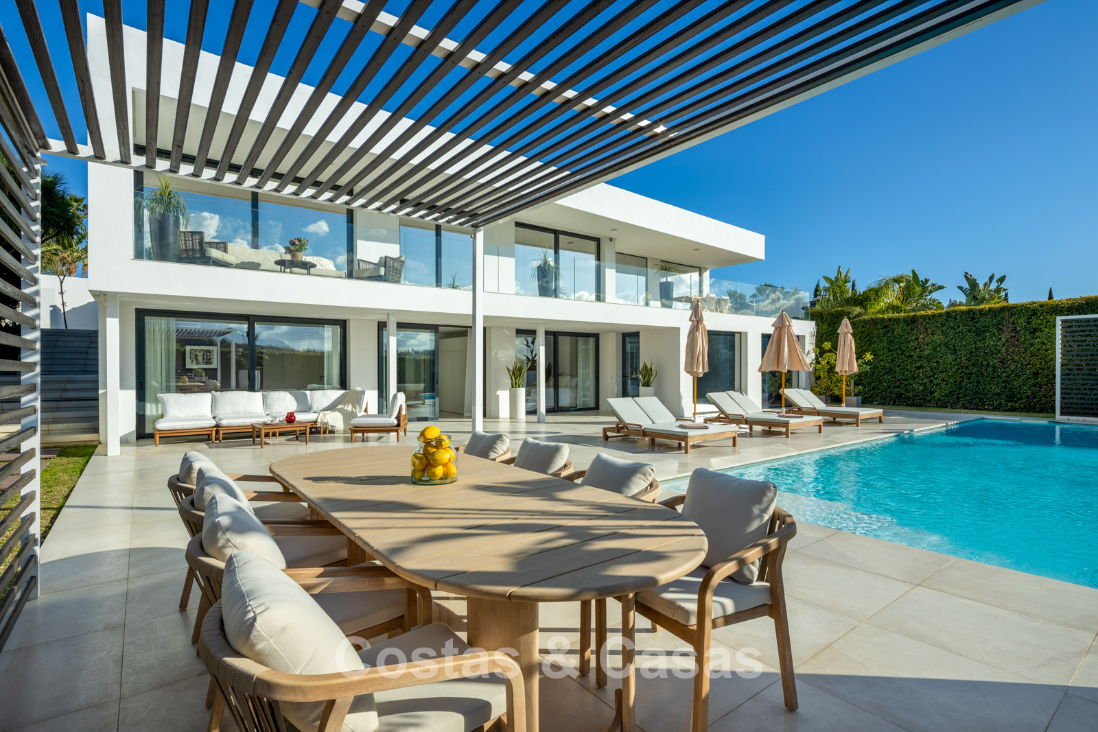 Piscine privée entourée d'une terrasse ensoleillée.