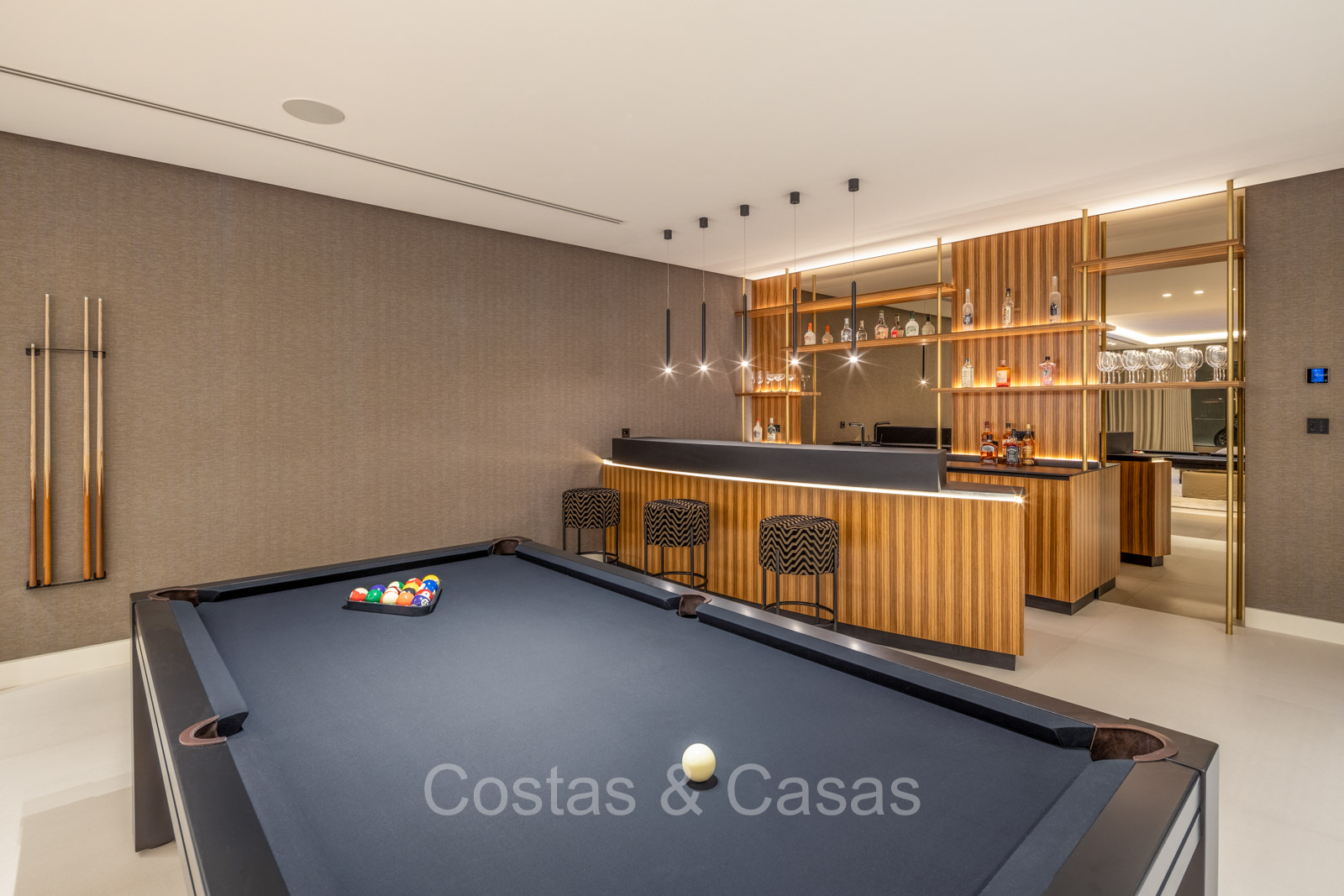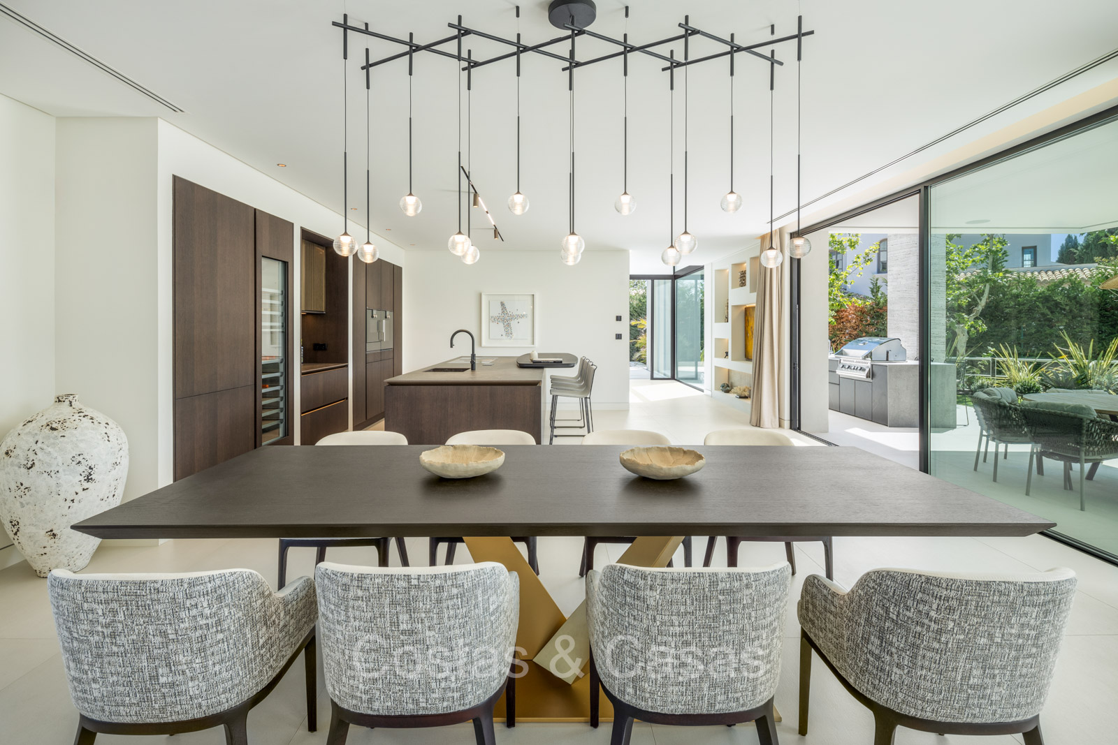 Une superbe villa indépendante de qualité conçue avec une attention aux détails et un haut degré de finition. Des portes vitrées coulissantes du sol au plafond s'ouvrent sur les espaces extérieurs. Espace de vie élégamment meublé avec un salon et un coin repas. Cuisine design élégante, entièrement équipée d'appareils Gaggenau et d'un îlot avec bar. 6 chambres, 7 salles de bains et une toilette séparée. Carreaux de céramique italienne de 120x120cm qui s'étendent de l'intérieur jusqu'aux terrasses. Parquet dans les chambres. Logement d'hôtes intérieure avec une chambre avec salle de bains privative, un dressing et un salon. Espace de divertissement avec salon TV, espace de jeux et un bar personnalisé. Salle de fitness entièrement équipée avec sauna adjacent et salle de bain séparée. Bodega à vin climatisée. Buanderie. Débarras. Domaines techniques. Garage intérieur pour 4 voitures.