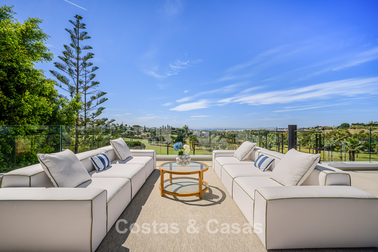 Terrain clôturé en position élevée, adjacent au terrain de golf. Jardin paysager avec pelouse. Une magnifique piscine à débordement avec terrasses attenantes. Une cuisine extérieure avec barbecue et coin repas en plein air. Un luxueux toit-terrasse avec cuisine extérieure, coin repas et espace détente. Orientation sud. La villa offre une vue imprenable sur le golf adjacent, avec une vue partielle sur la Méditerranée depuis les étages supérieurs.
