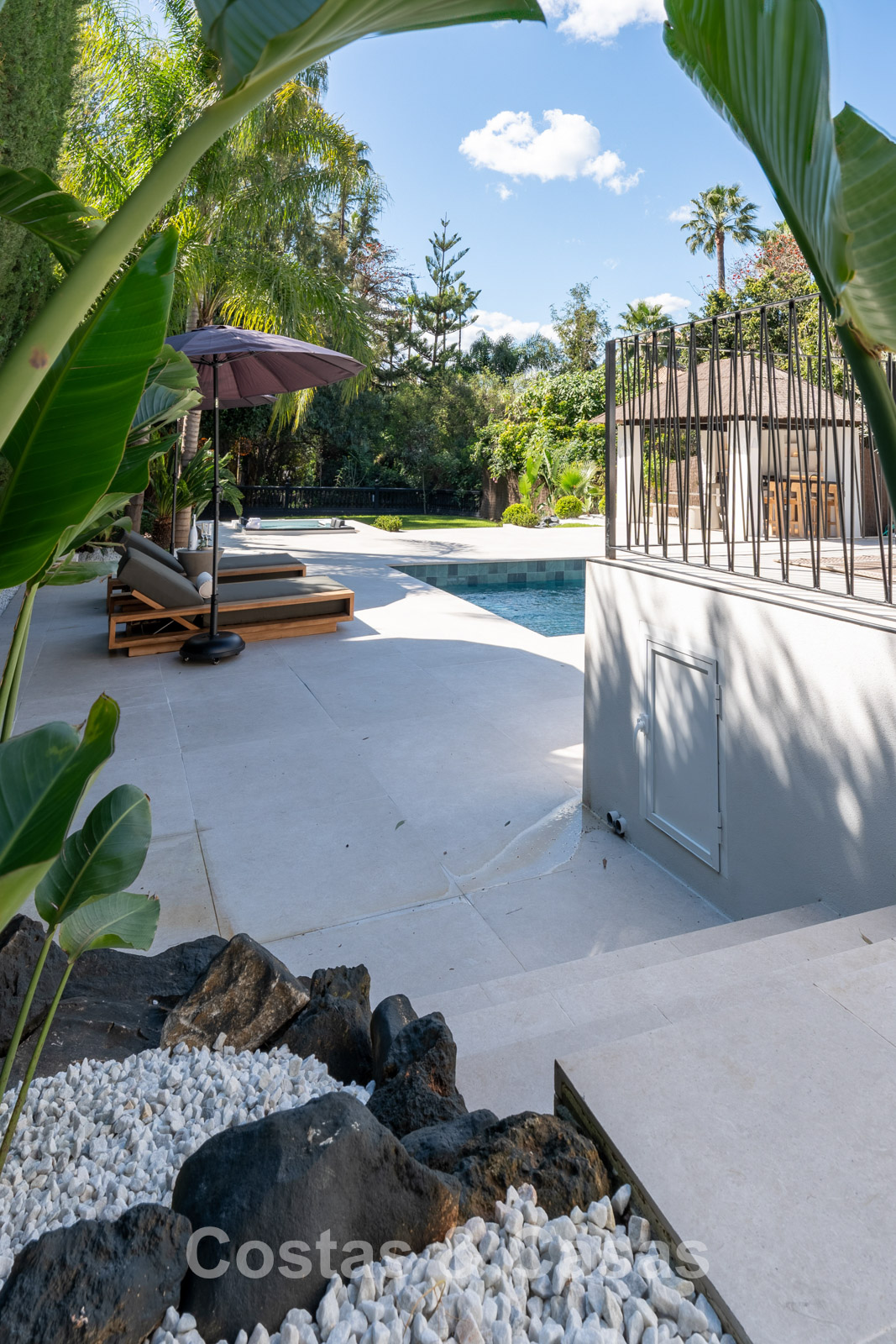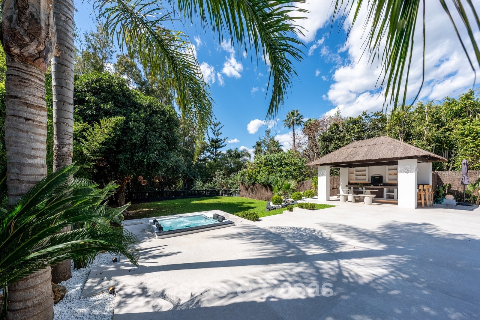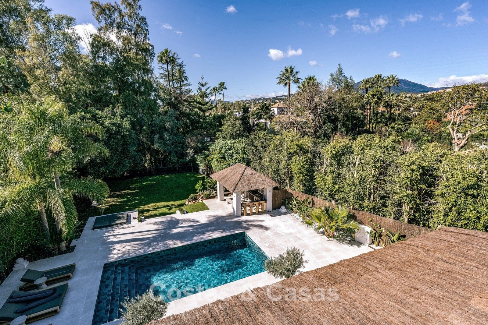 Un terrain spacieux qui offre une oasis de paix et d'intimité. Un jardin magnifiquement aménagé offre un mélange raffiné de palmiers tropicaux, d'arbres matures et d'une vaste pelouse. Les terrasses ensoleillées sont équipées de coins salons confortables et d'un jacuzzi intégré. La grande et élégante piscine avec ses chaises longues élégantes invite à la détente ultime, tandis que le charmant bar de la piscine couverte crée un cadre idéal pour les dîners d'été et les soirées chaleureuses entre amis. Située au sud-ouest. Vue sur le jardin luxuriant et le sommet emblématique de la montagne La Concha.