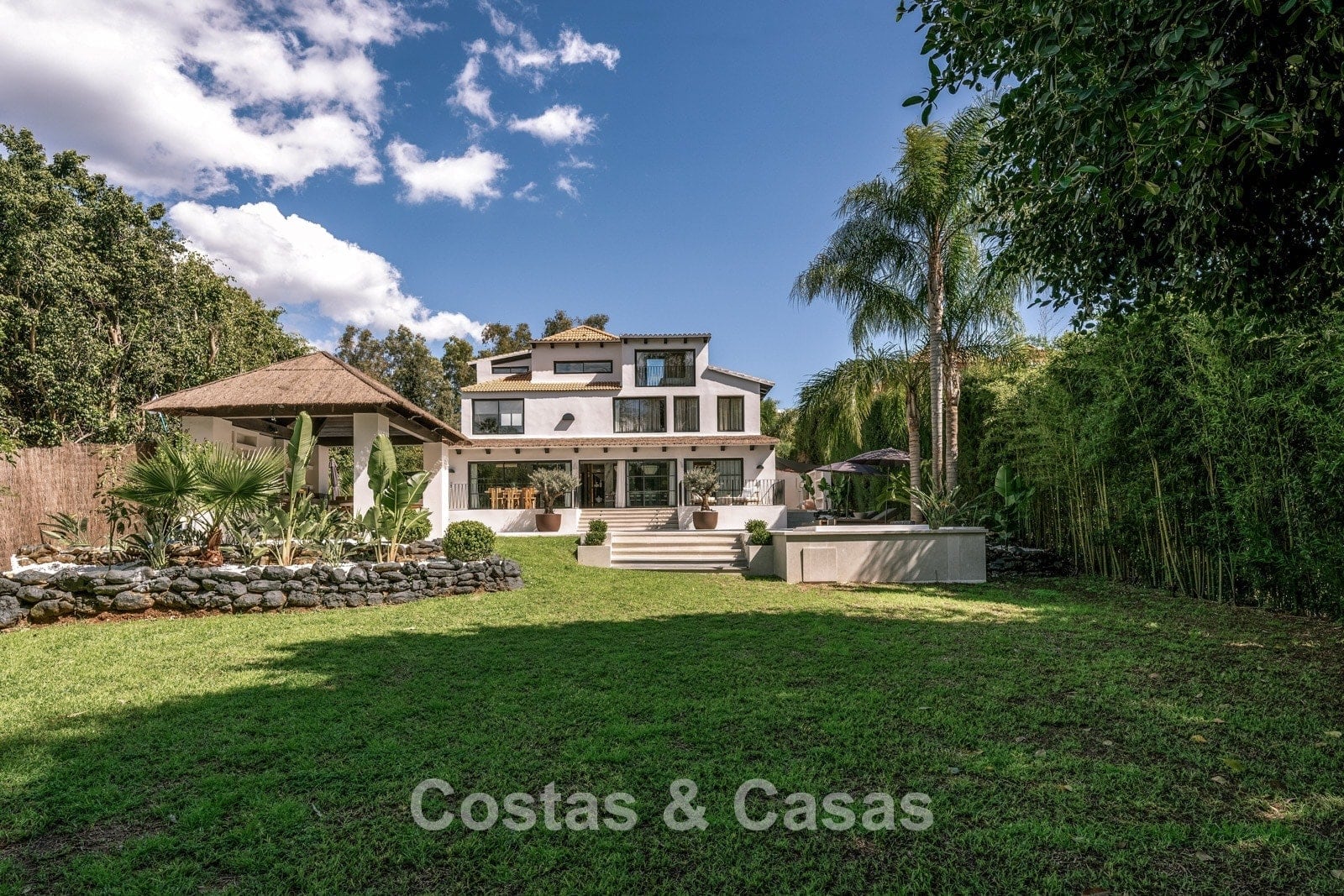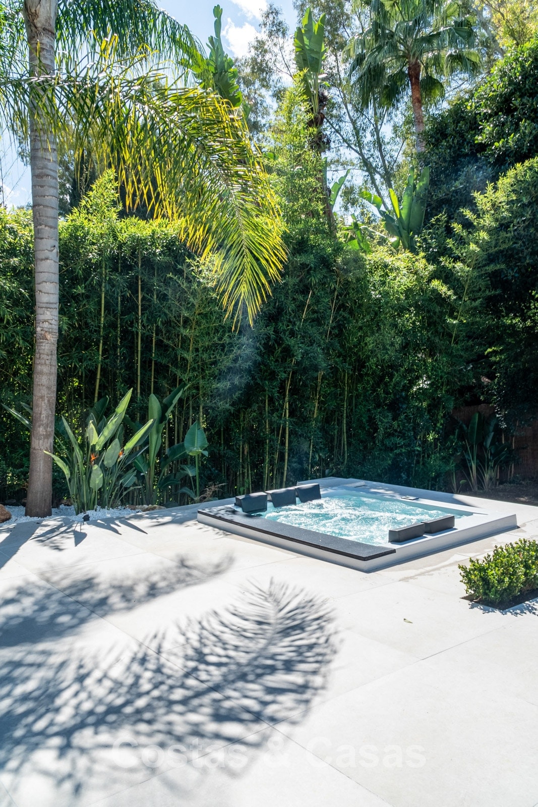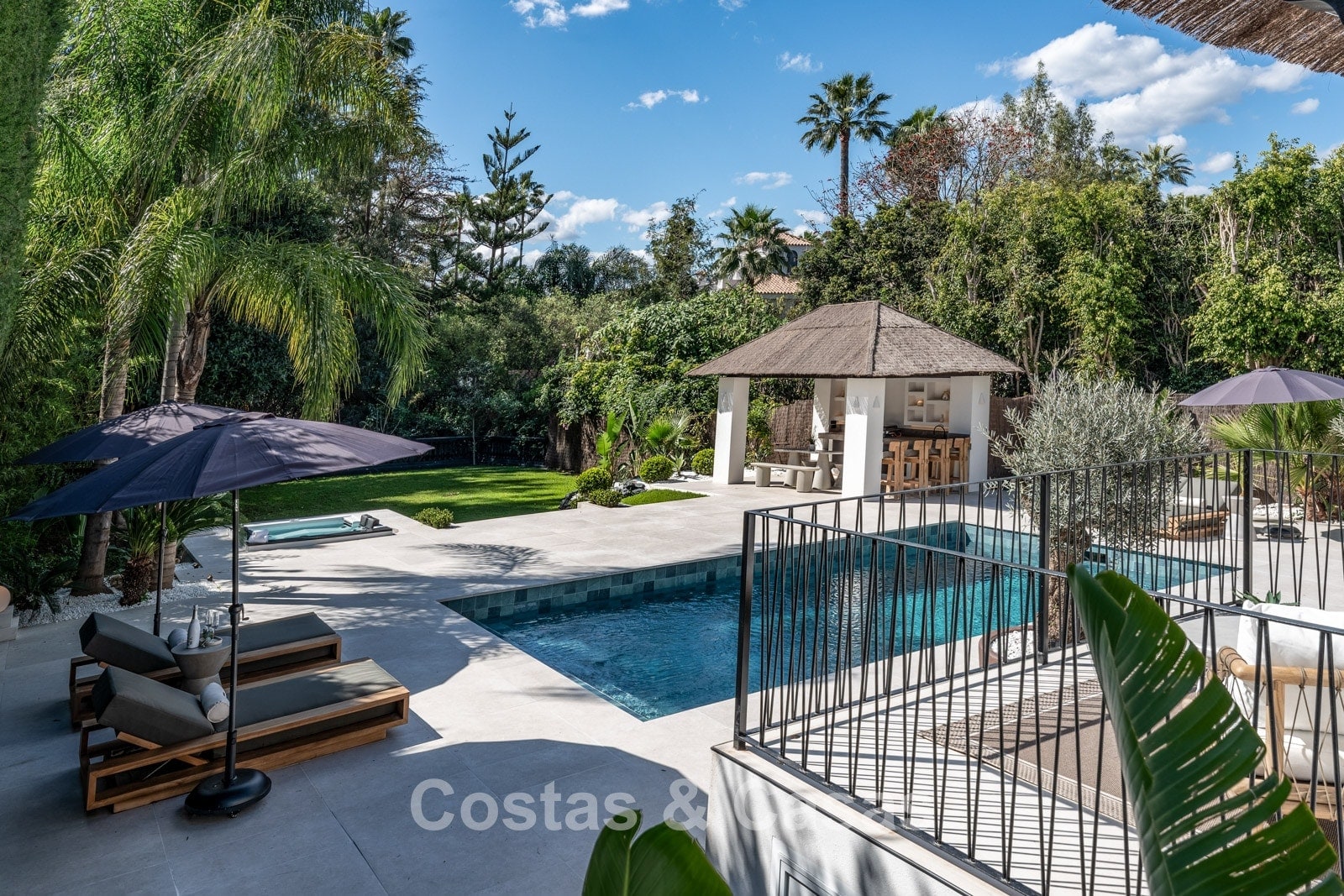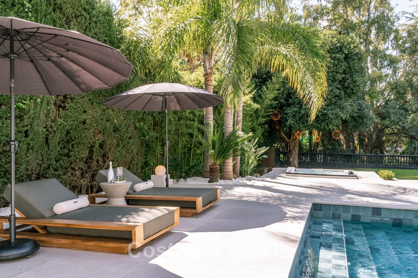 Un terrain spacieux qui offre une oasis de paix et d'intimité. Un jardin magnifiquement aménagé offre un mélange raffiné de palmiers tropicaux, d'arbres matures et d'une vaste pelouse. Les terrasses ensoleillées sont équipées de coins salons confortables et d'un jacuzzi intégré. La grande et élégante piscine avec ses chaises longues élégantes invite à la détente ultime, tandis que le charmant bar de la piscine couverte crée un cadre idéal pour les dîners d'été et les soirées chaleureuses entre amis. Située au sud-ouest. Vue sur le jardin luxuriant et le sommet emblématique de la montagne La Concha.