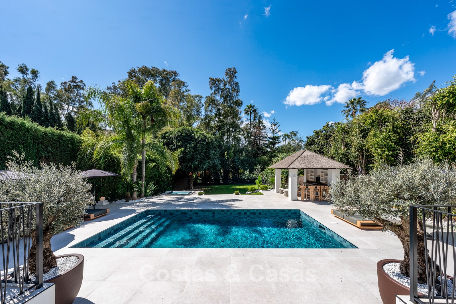 Grand jardin privé avec piscine et bar de piscine.