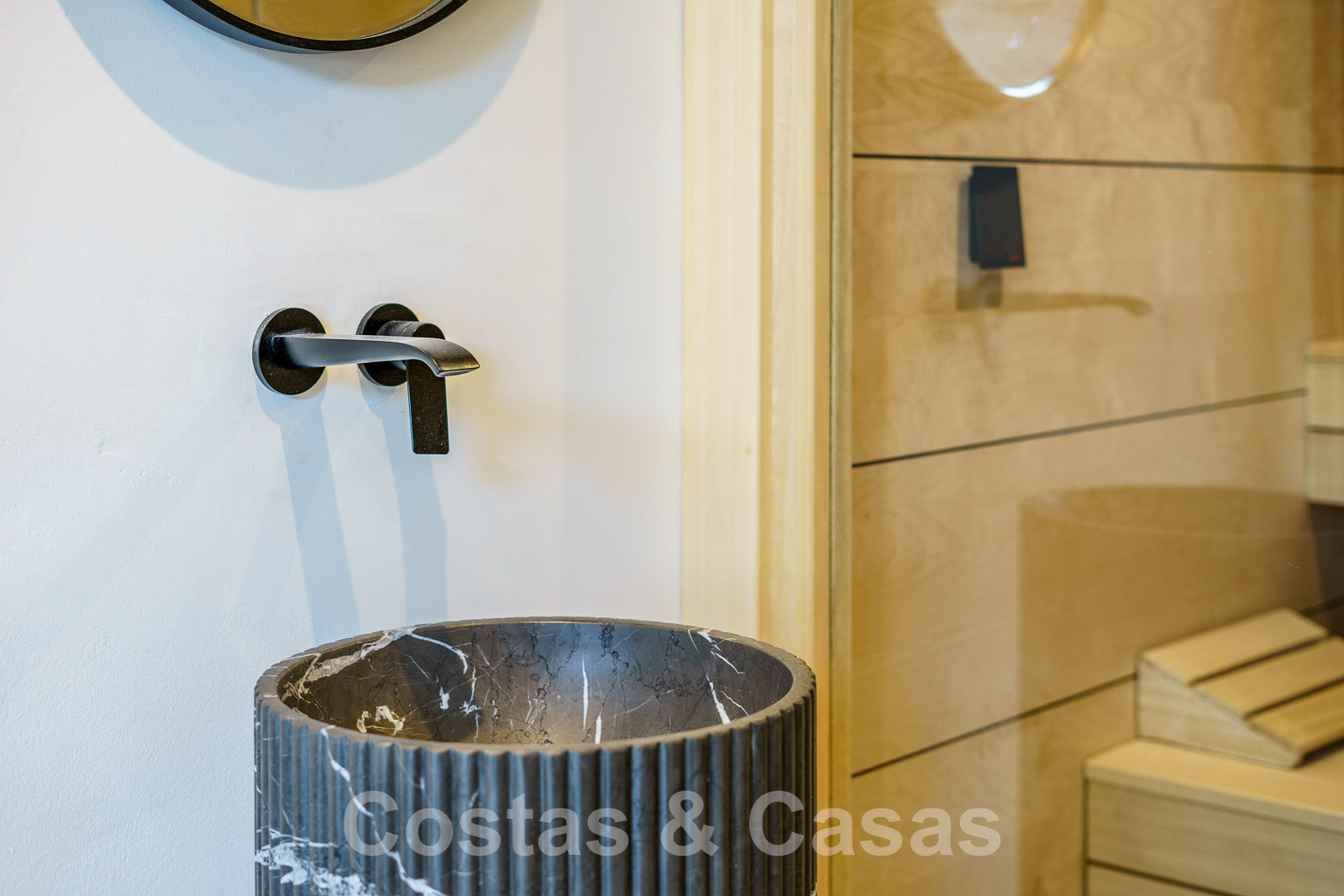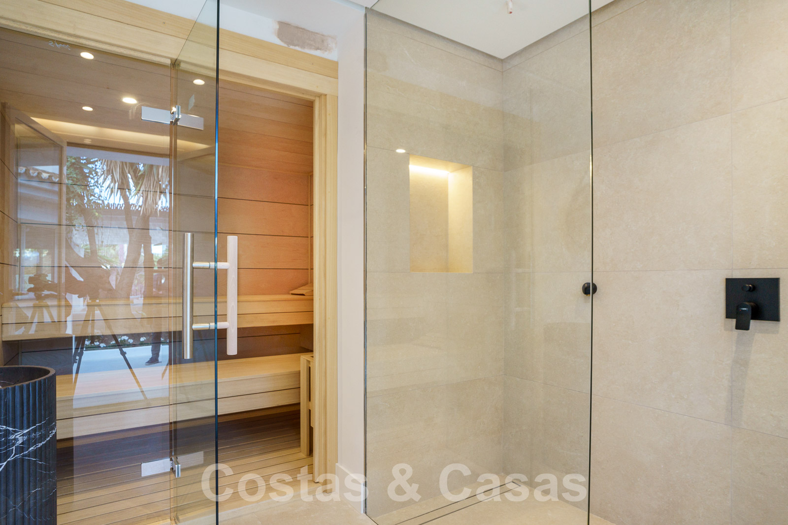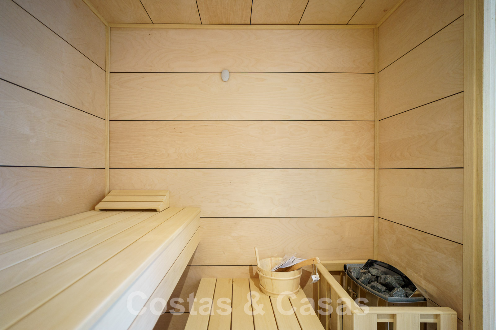 Sauna finlandais ultramoderne avec accès au jardin et à la piscine.