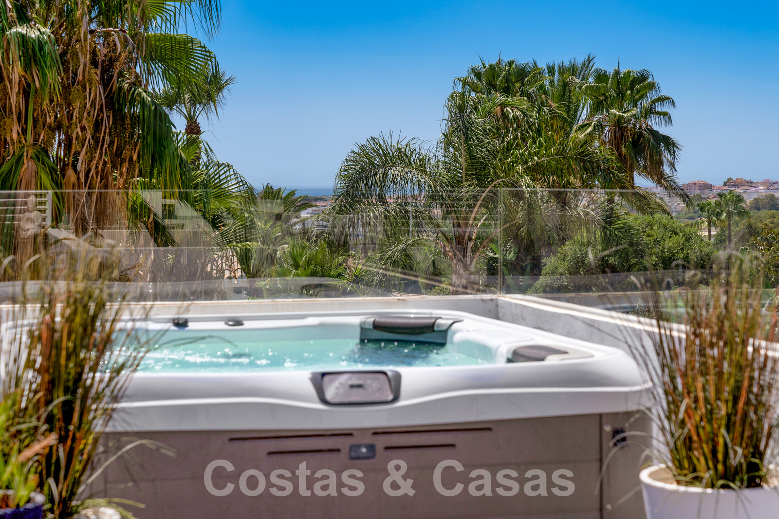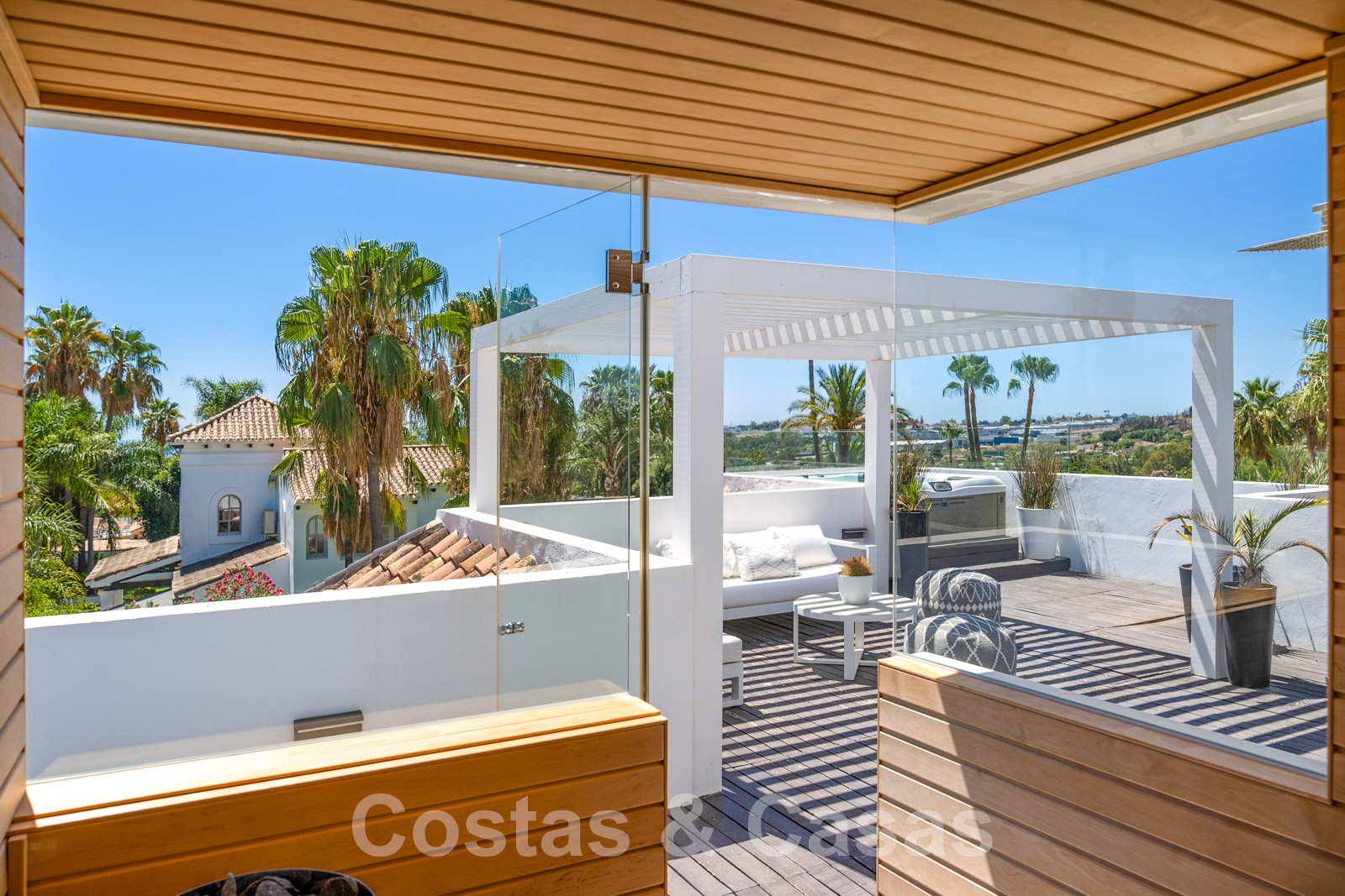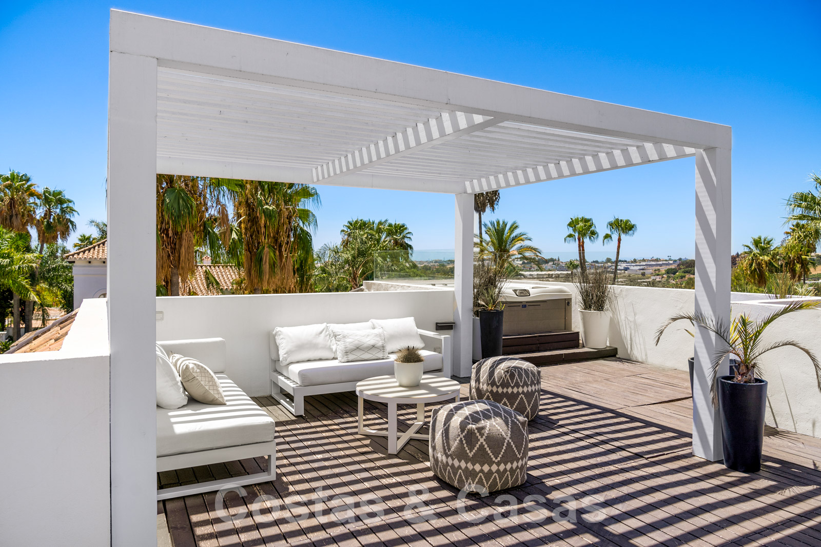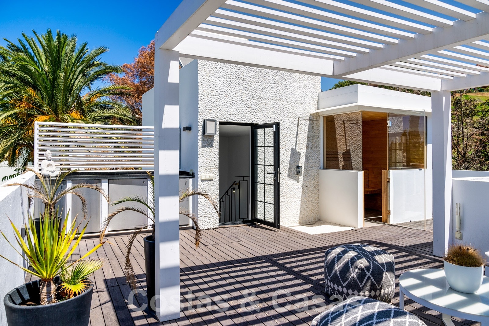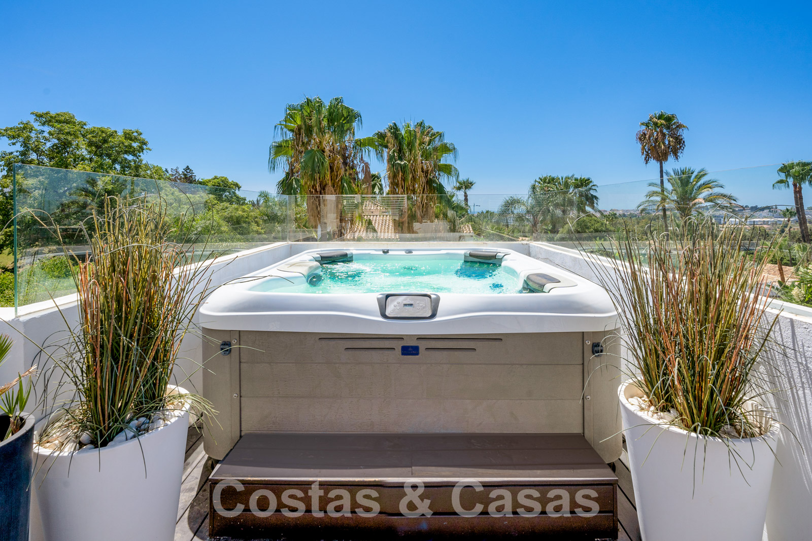 Balustrades en verre autour des terrasses. Climatisation. Armoires encastrées. Eclairage extérieur. Douche extérieure.