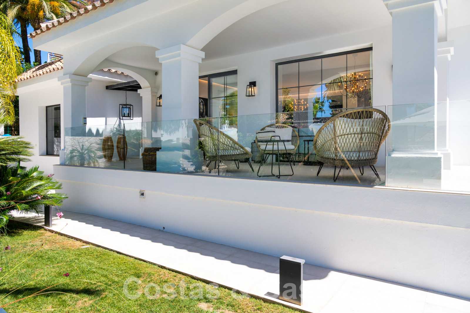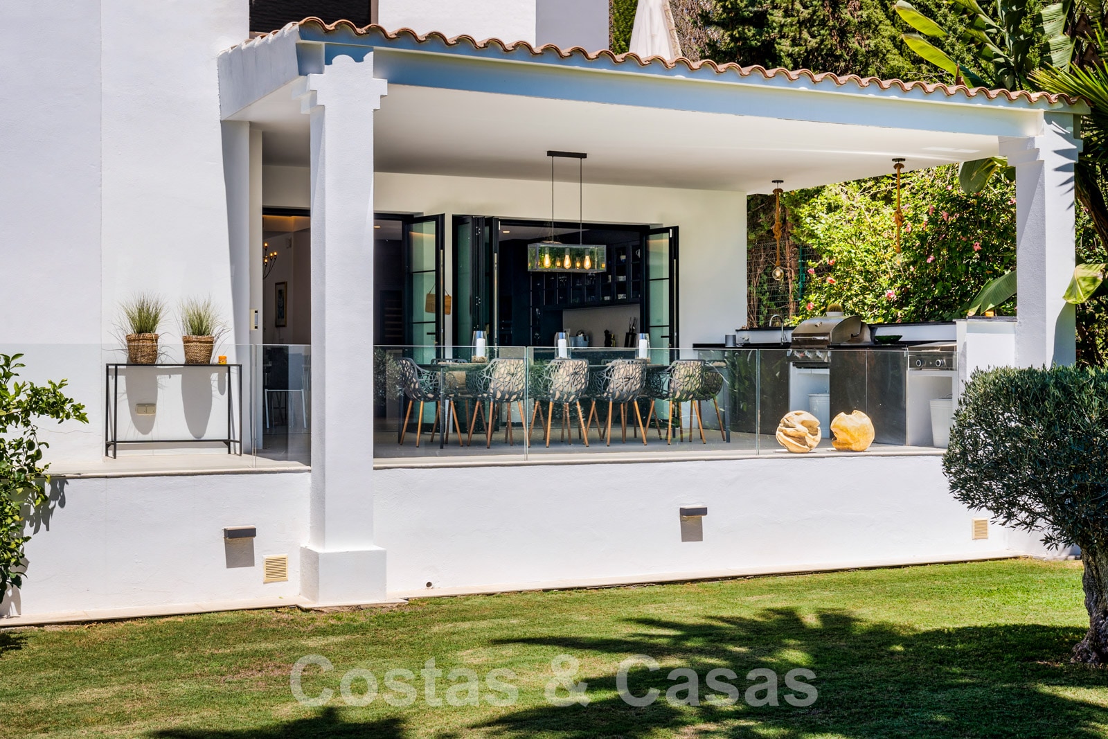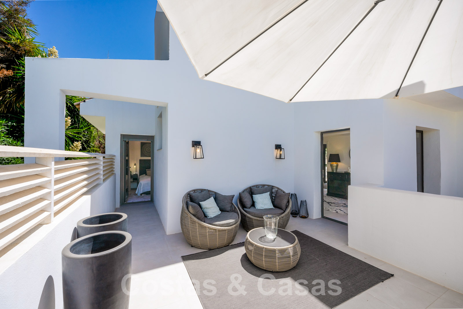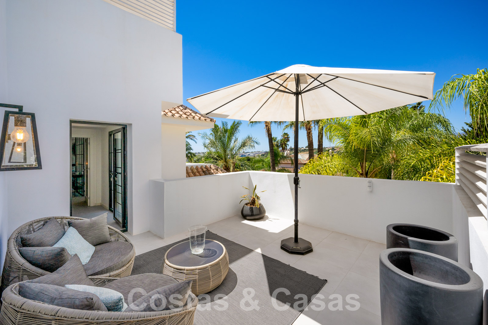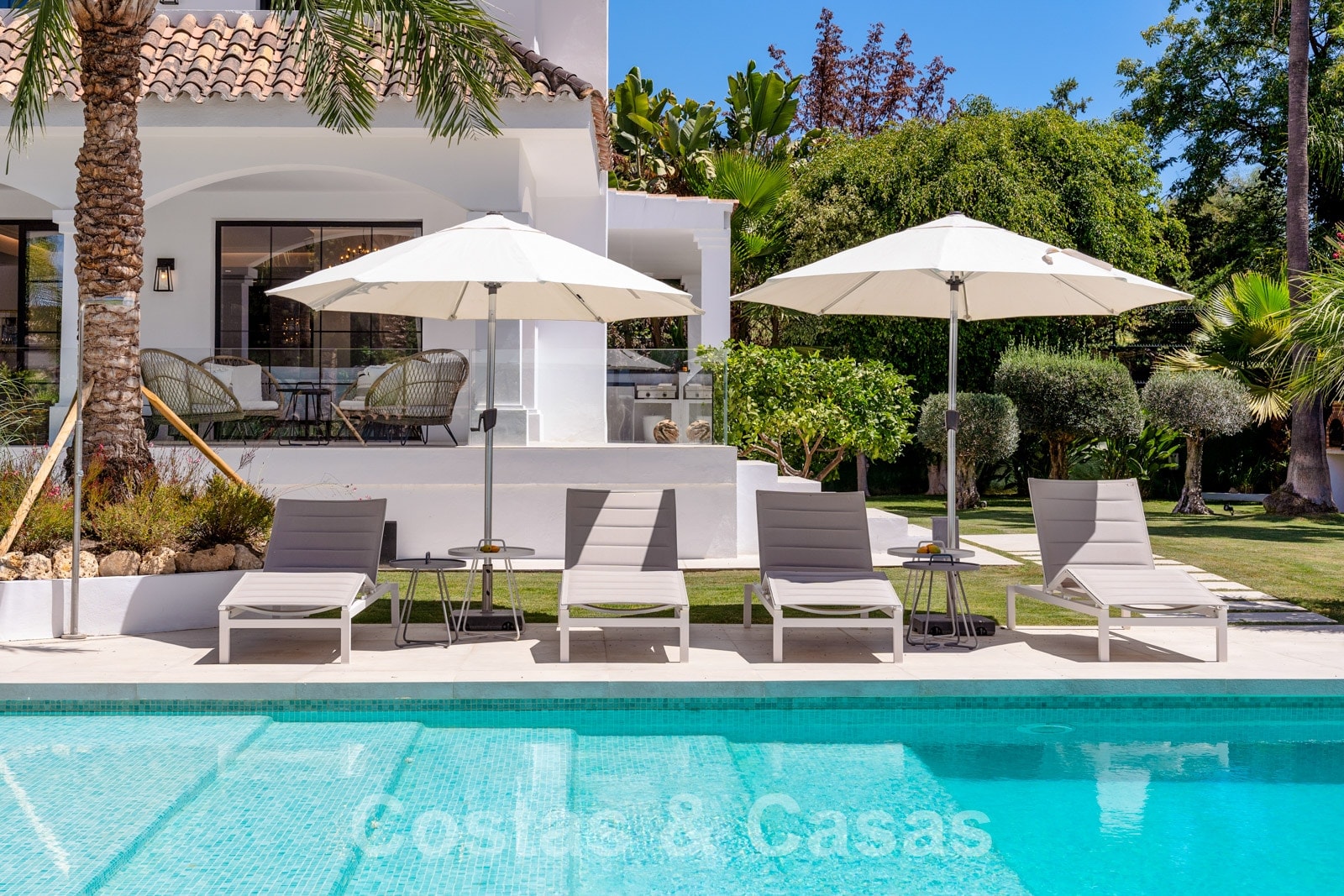Balustrades en verre autour des terrasses. Climatisation. Armoires encastrées. Eclairage extérieur. Douche extérieure.
