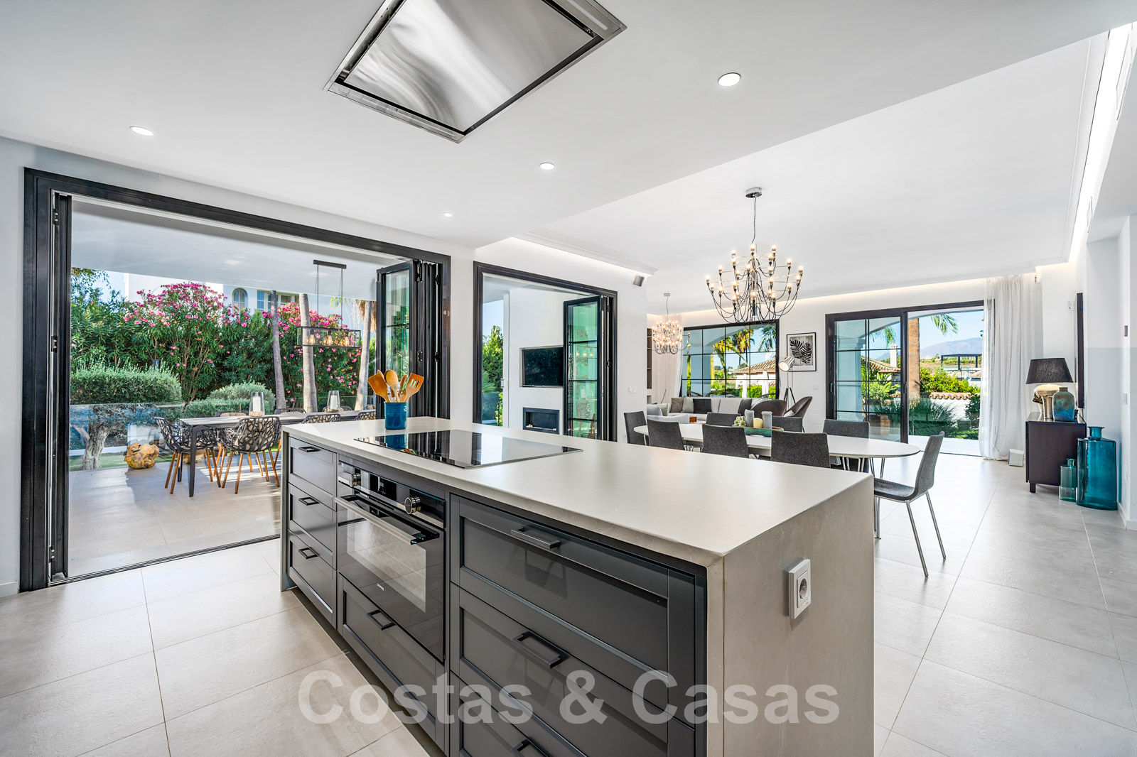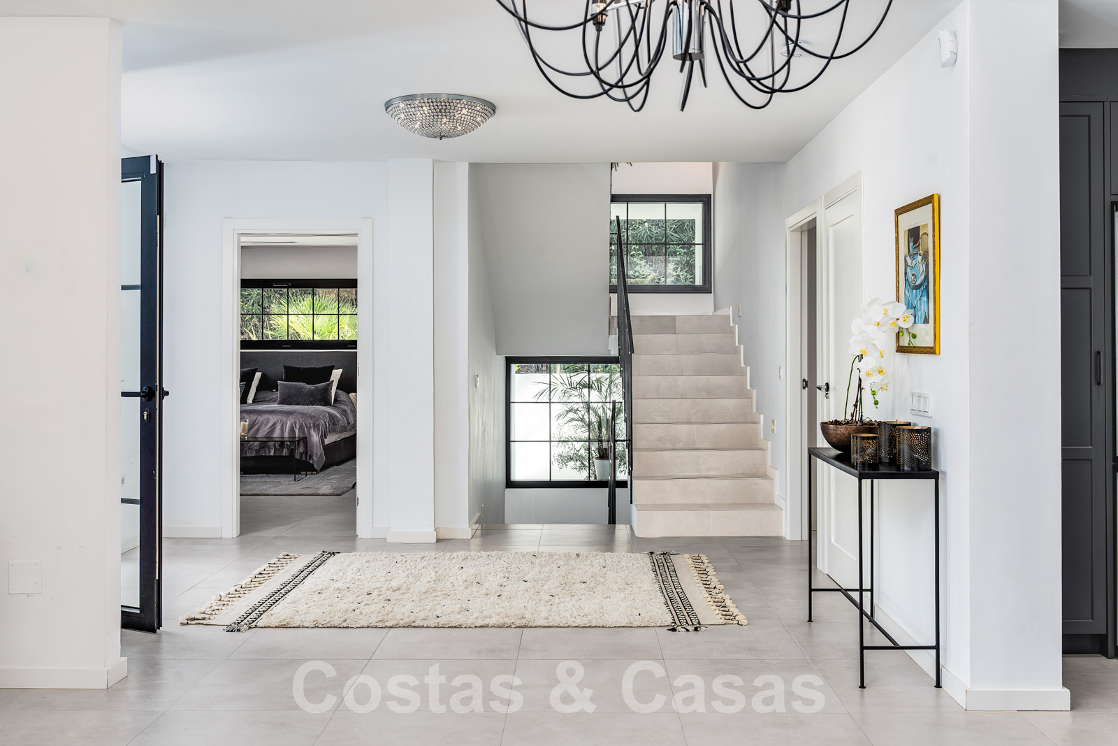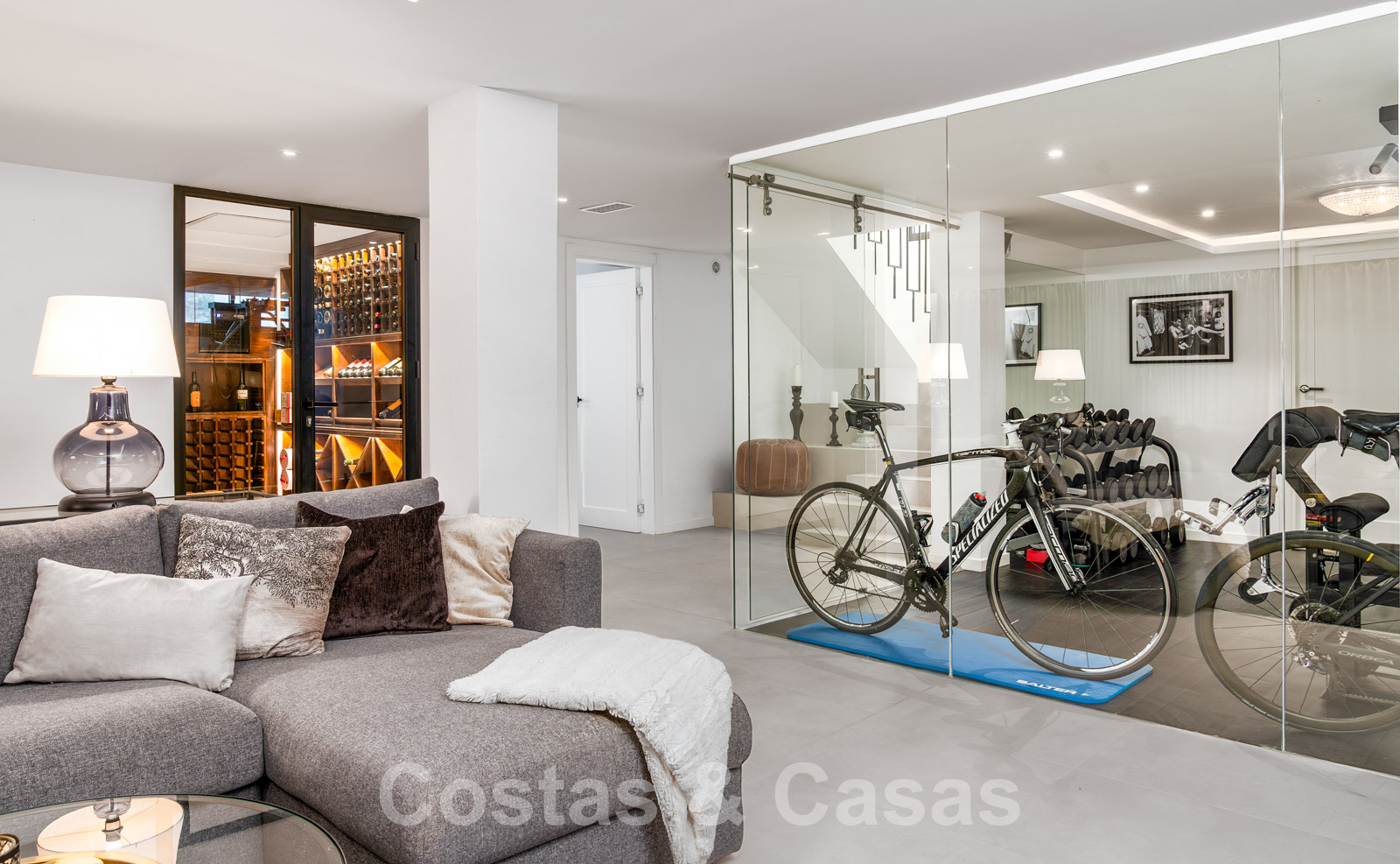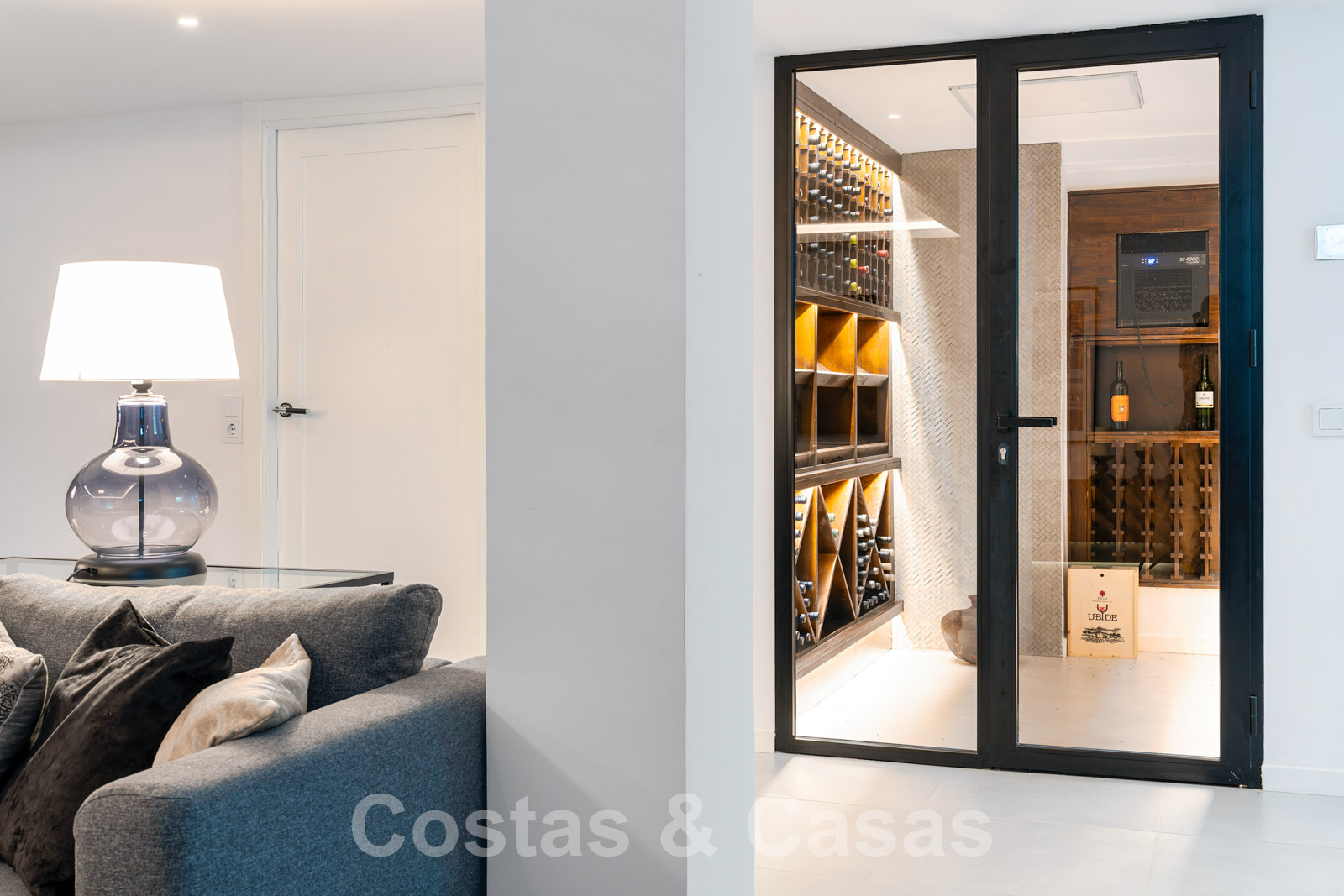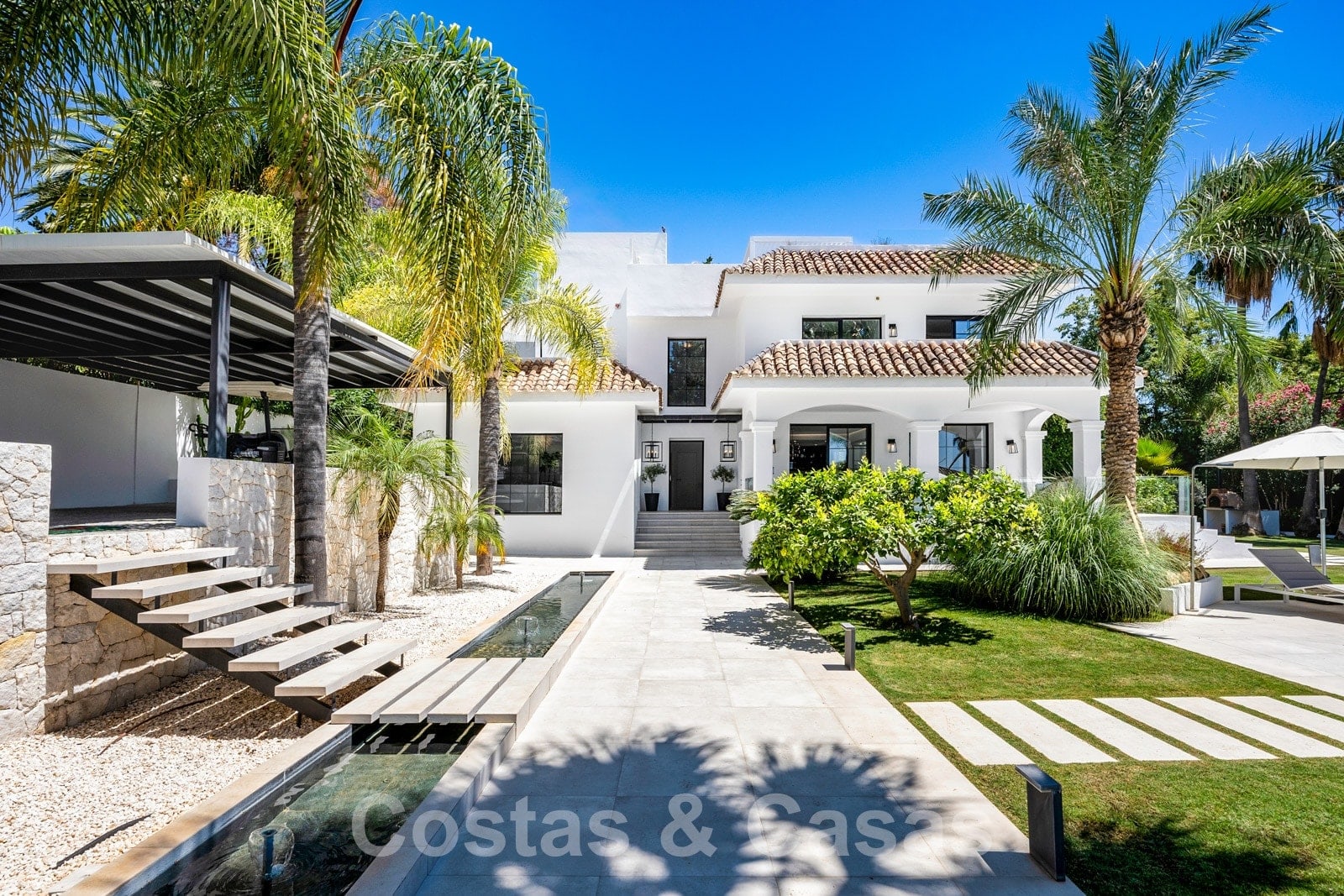 Villa entièrement rénovée avec un style architectural moderne et méditerranéen. L'entrée est agrémentée d'une belle pièce d'eau. Le hall d'entrée s'ouvre immédiatement sur l'espace de vie lumineux. Intérieur moderne avec un concept ouvert. Grâce à la combinaison de couleurs neutres et à l'utilisation de pièces de décoration élégantes, l'intérieur dégage une élégance absolue. Salon TV confortable avec cheminée. Salle à manger. Cuisine design ouverte équipée d'appareils Siemens et d'un îlot de cuisson central. De hautes fenêtres avec des cadres encastrés génèrent beaucoup de lumière naturelle et assurent une connexion transparente entre l'intérieur et l'extérieur. Au total, 6 chambres, 6 bains et une toilette pour les invités. Sols en porcelaine de qualité. Un étage inférieur résidentiel a été aménagé avec un salon de télévision, une salle de sport entièrement équipée et une bodega climatisée. Un carport permet de garer 2 voitures.