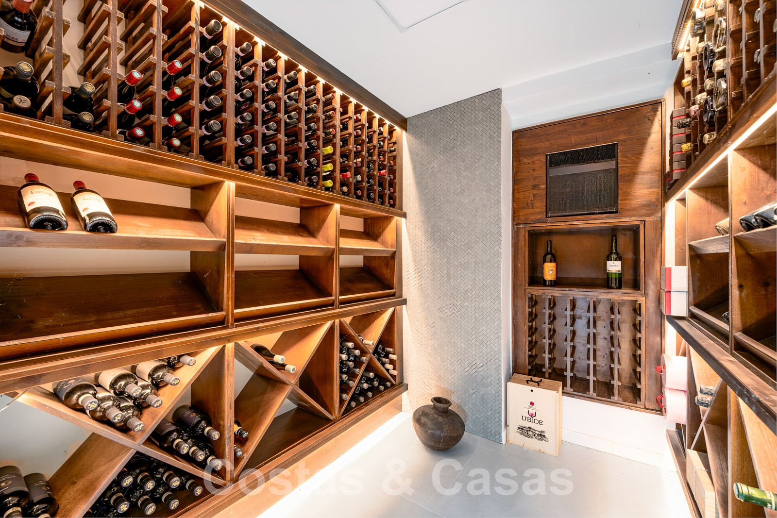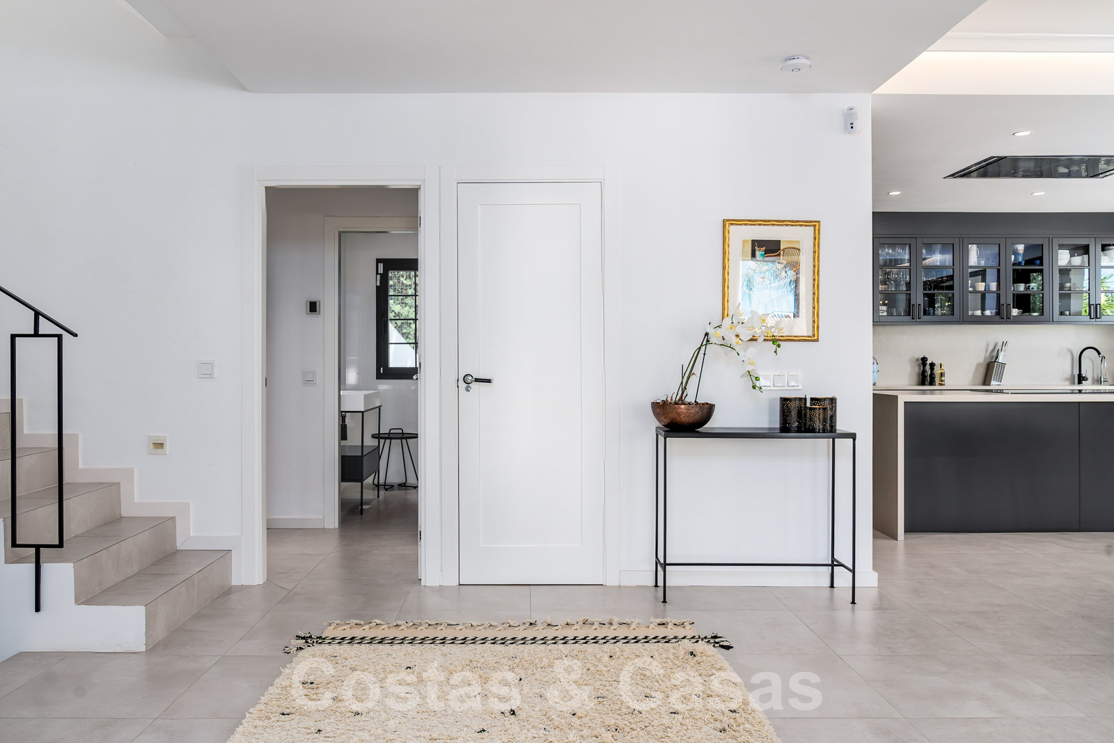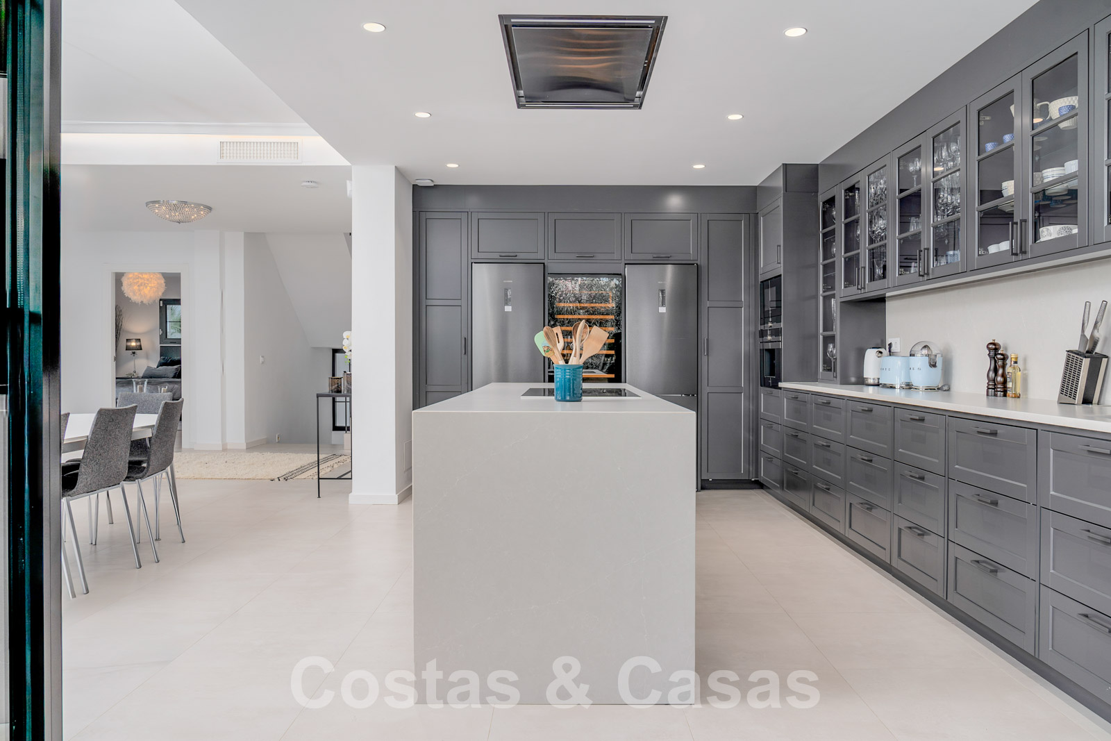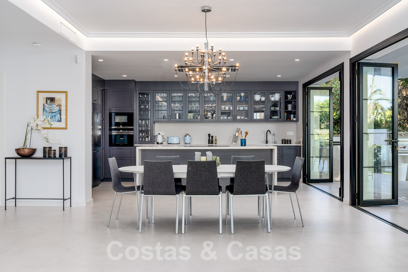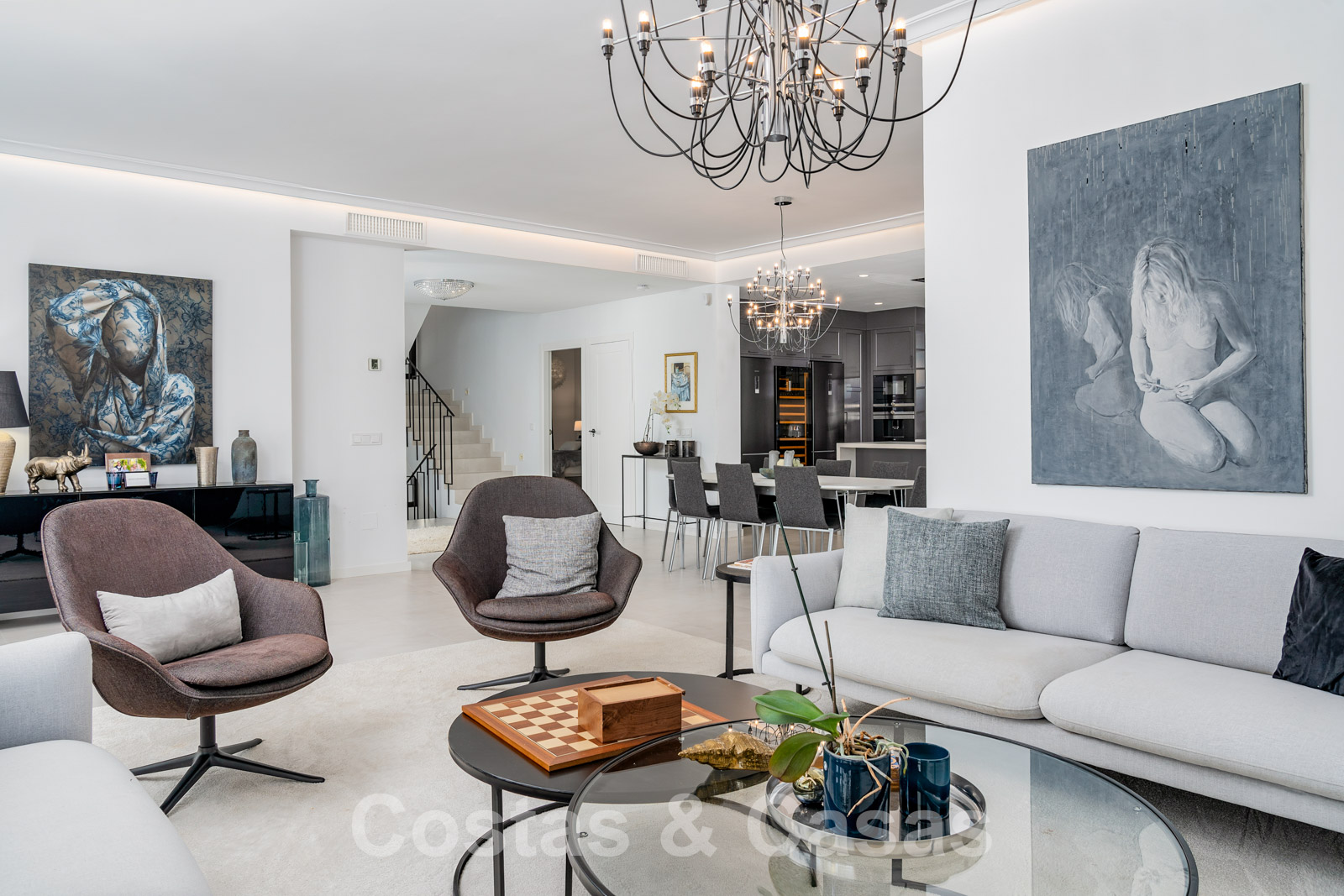 Villa entièrement rénovée avec un style architectural moderne et méditerranéen. L'entrée est agrémentée d'une belle pièce d'eau. Le hall d'entrée s'ouvre immédiatement sur l'espace de vie lumineux. Intérieur moderne avec un concept ouvert. Grâce à la combinaison de couleurs neutres et à l'utilisation de pièces de décoration élégantes, l'intérieur dégage une élégance absolue. Salon TV confortable avec cheminée. Salle à manger. Cuisine design ouverte équipée d'appareils Siemens et d'un îlot de cuisson central. De hautes fenêtres avec des cadres encastrés génèrent beaucoup de lumière naturelle et assurent une connexion transparente entre l'intérieur et l'extérieur. Au total, 6 chambres, 6 bains et une toilette pour les invités. Sols en porcelaine de qualité. Un étage inférieur résidentiel a été aménagé avec un salon de télévision, une salle de sport entièrement équipée et une bodega climatisée. Un carport permet de garer 2 voitures.