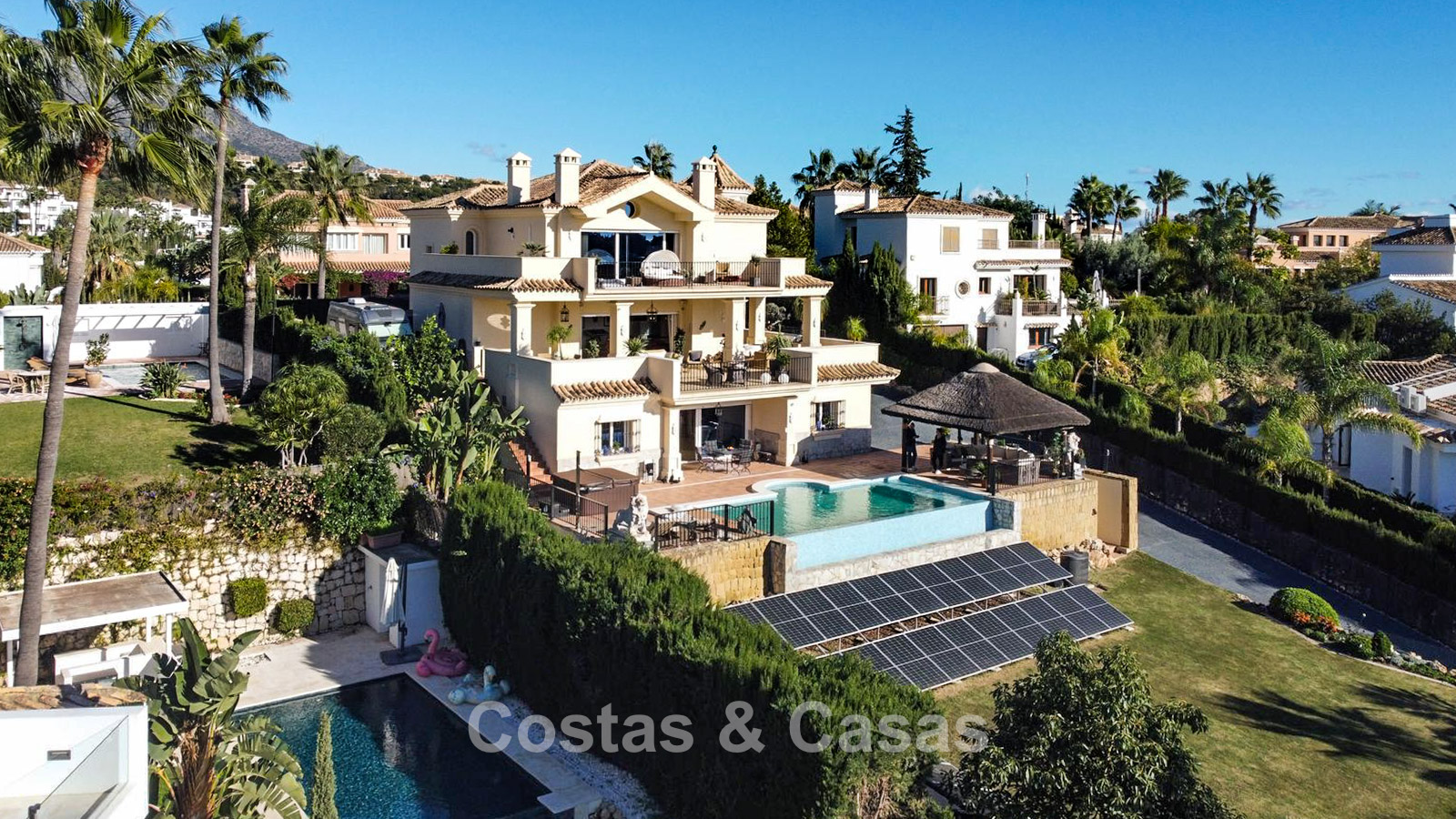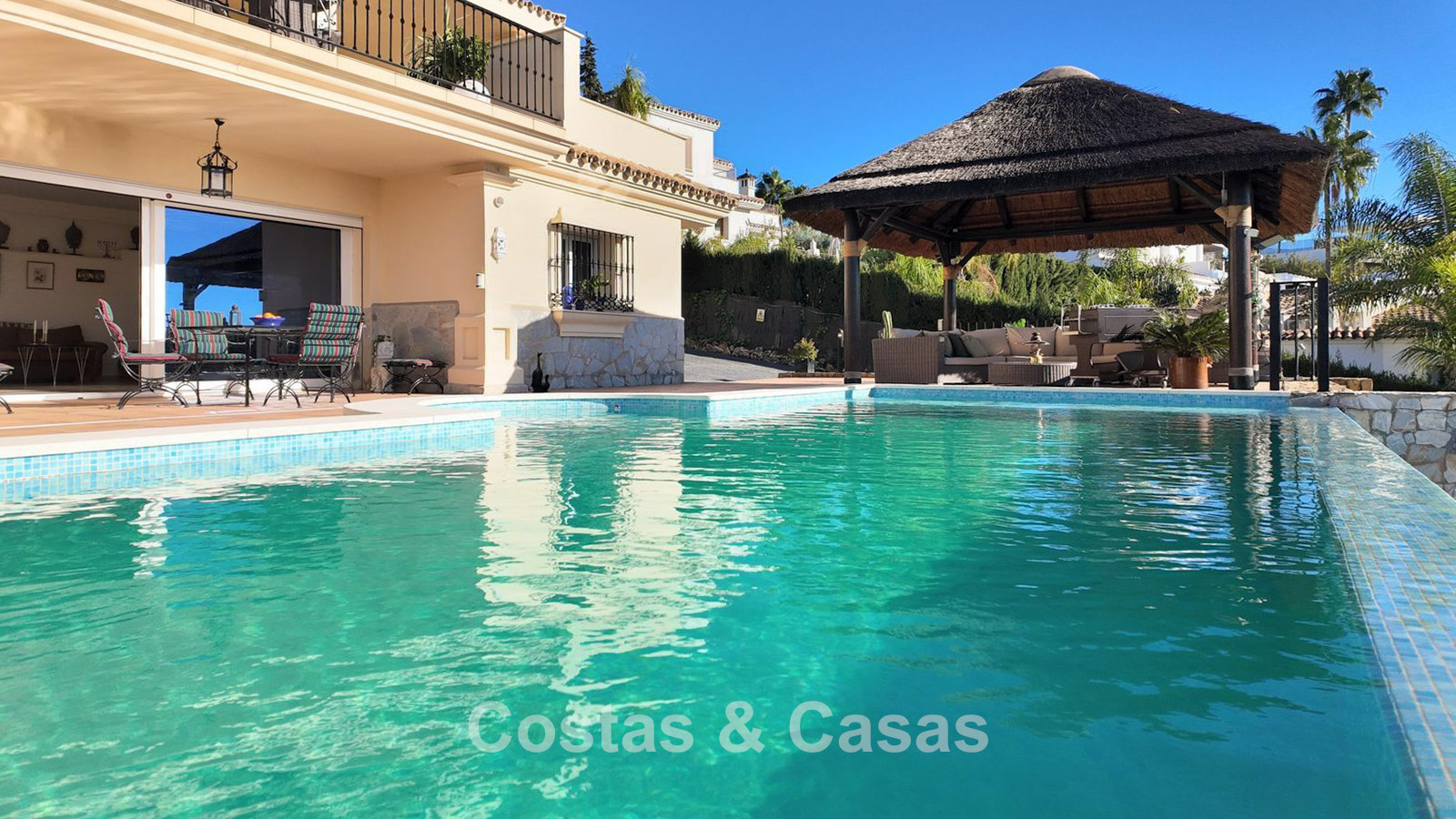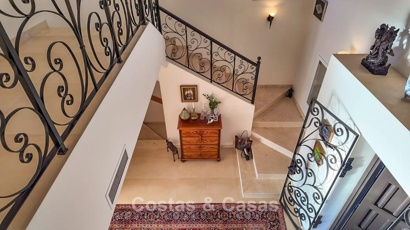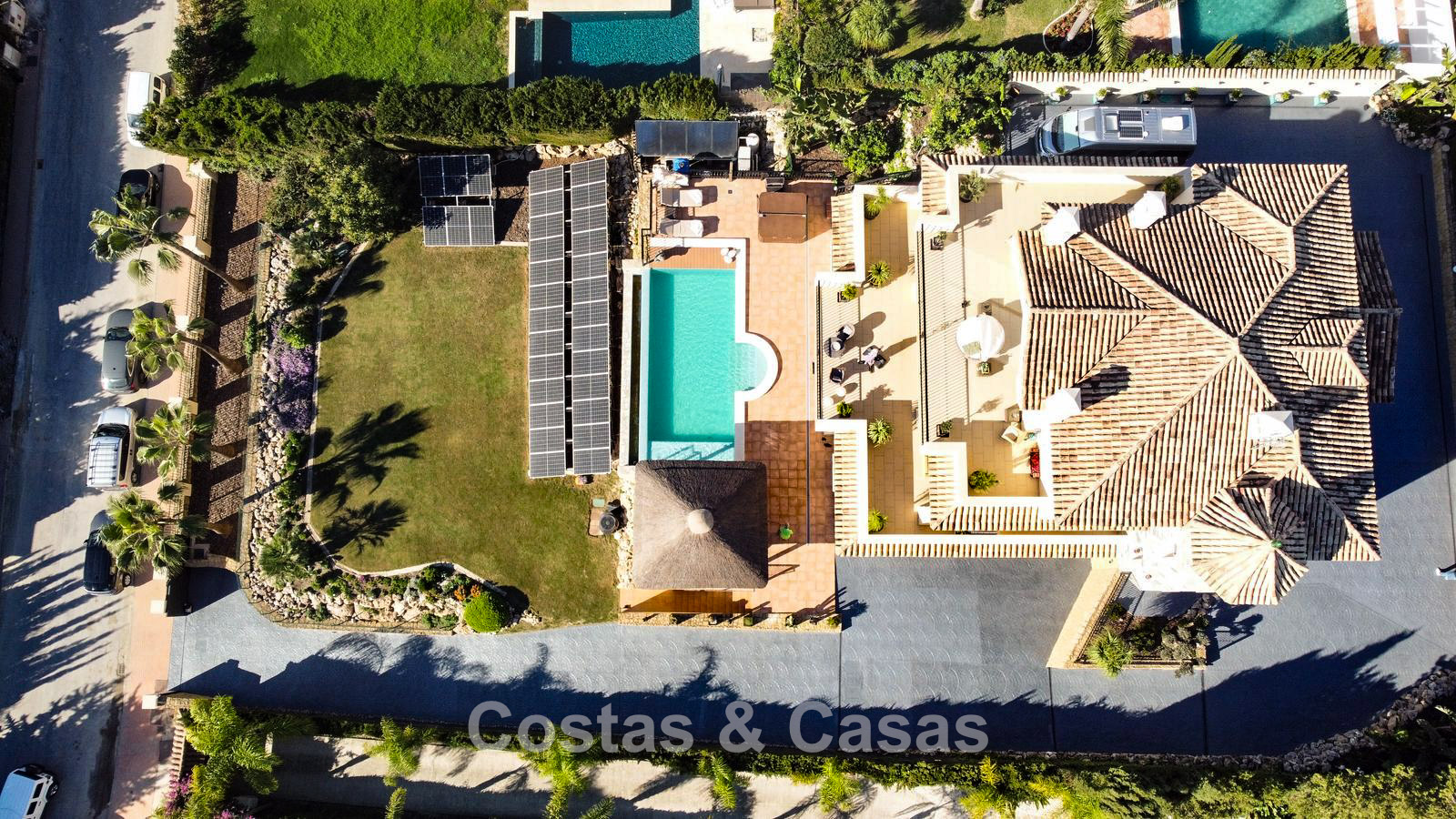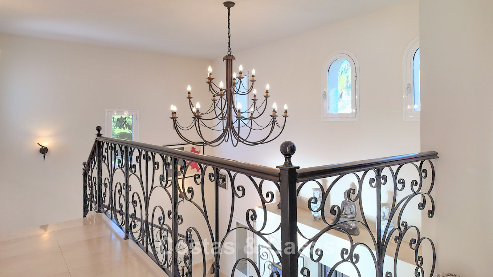 Cette luxueuse villa de style andalou classique respire le charme espagnol. Vous entrez dans le terrain par un double portail électrique et remontez l'allée jusqu'à l'entrée principale de la maison. Les hautes fenêtres coulissantes offrent beaucoup de lumière naturelle. Espace de vie spacieux et ouvert. La cuisine dispose d'appareils électroménagers de qualité, d'un réfrigérateur américain, d'un îlot de cuisson central et d'un coin repas. 4 chambres, 5 salles de bain. La suite parentale de 42 m² est située à l'étage supérieur avec un dressing, une salle de bain attenante et une autre grande terrasse. A l’étage inférieur se trouve un logement d'amis séparé avec 2 chambres, une salle de bain, une kitchenette, un poêle à bois et une entrée privée. Plus loin à cet étage se trouve un espace de loisirs avec un bar bien approvisionné, un home cinéma et une salle de fitness. Buanderie avec lave-linge et sèche-linge. Sols en marbre. Garage intérieur pour 4 voitures. Parking supplémentaire pour au moins 6 voitures.