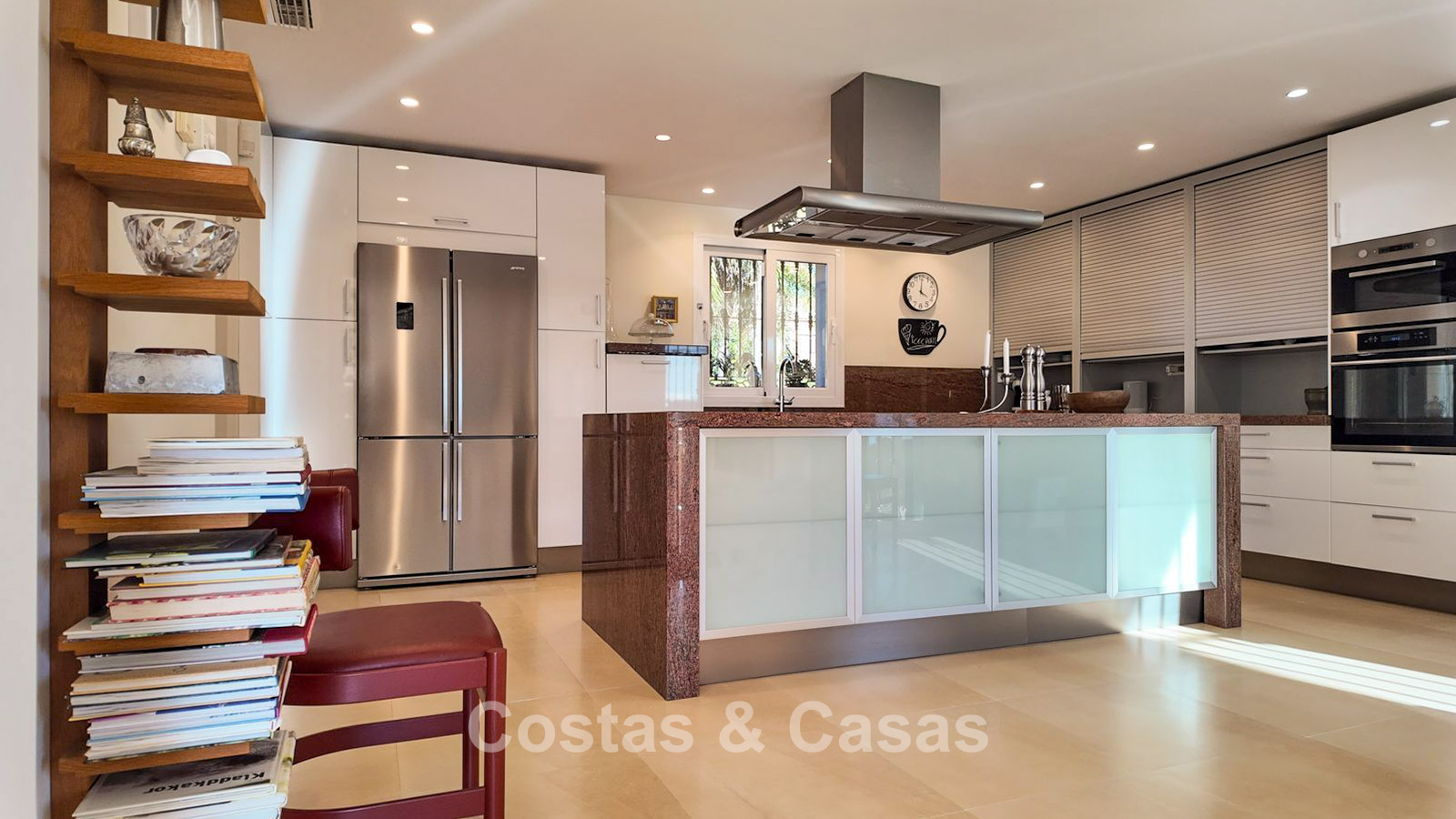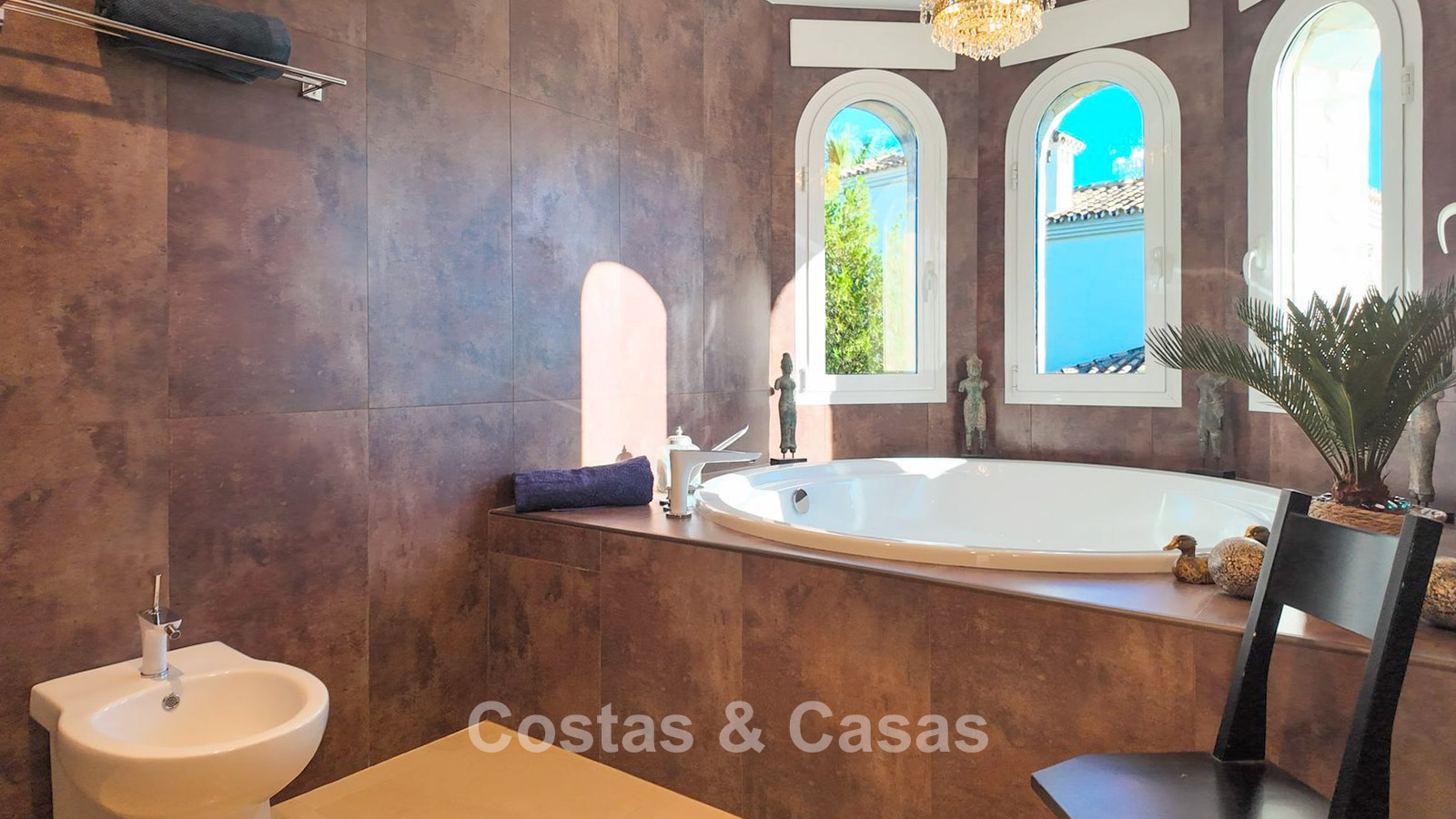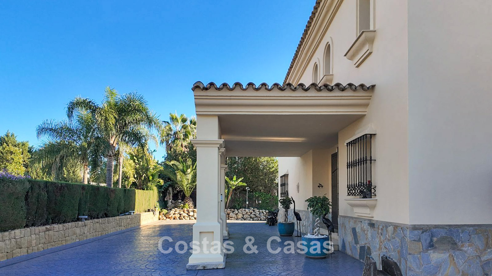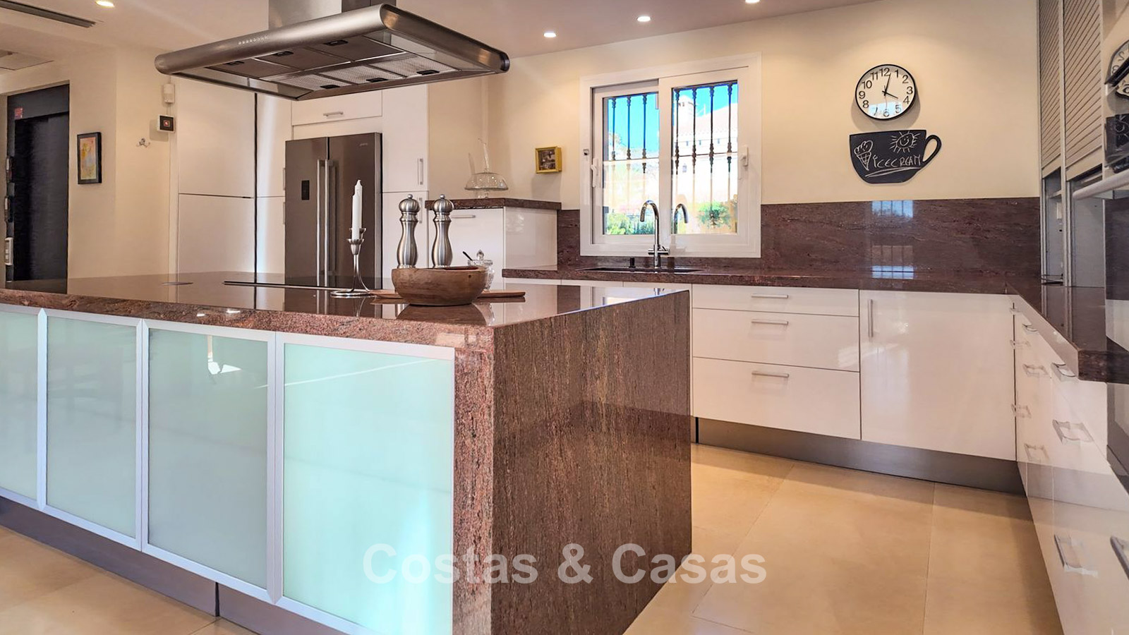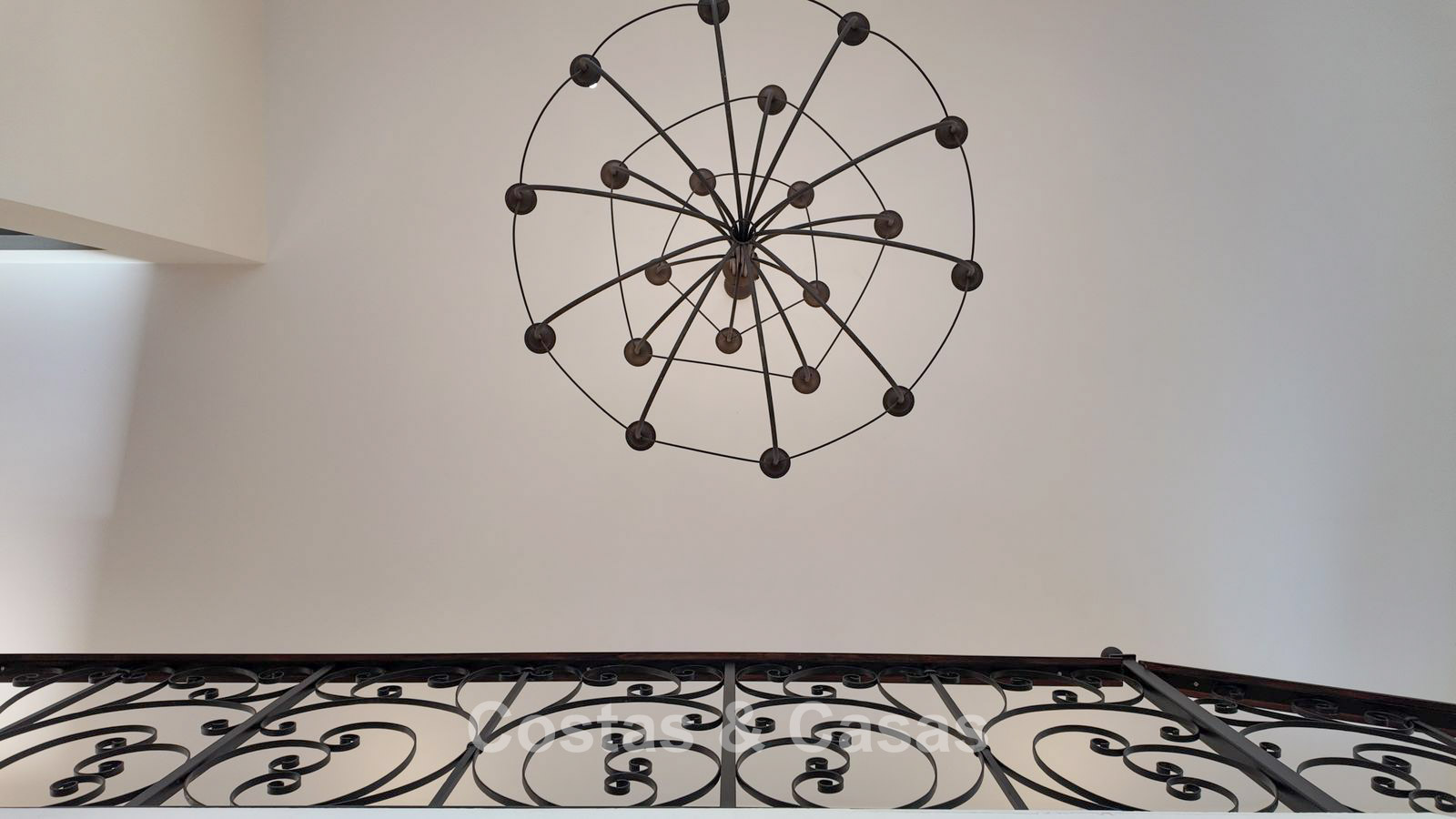 Cette luxueuse villa de style andalou classique respire le charme espagnol. Vous entrez dans le terrain par un double portail électrique et remontez l'allée jusqu'à l'entrée principale de la maison. Les hautes fenêtres coulissantes offrent beaucoup de lumière naturelle. Espace de vie spacieux et ouvert. La cuisine dispose d'appareils électroménagers de qualité, d'un réfrigérateur américain, d'un îlot de cuisson central et d'un coin repas. 4 chambres, 5 salles de bain. La suite parentale de 42 m² est située à l'étage supérieur avec un dressing, une salle de bain attenante et une autre grande terrasse. A l’étage inférieur se trouve un logement d'amis séparé avec 2 chambres, une salle de bain, une kitchenette, un poêle à bois et une entrée privée. Plus loin à cet étage se trouve un espace de loisirs avec un bar bien approvisionné, un home cinéma et une salle de fitness. Buanderie avec lave-linge et sèche-linge. Sols en marbre. Garage intérieur pour 4 voitures. Parking supplémentaire pour au moins 6 voitures.