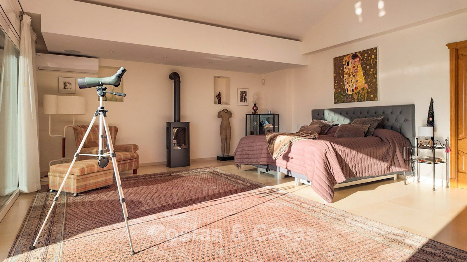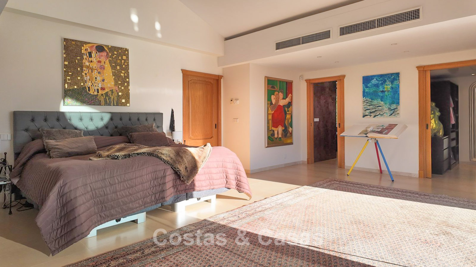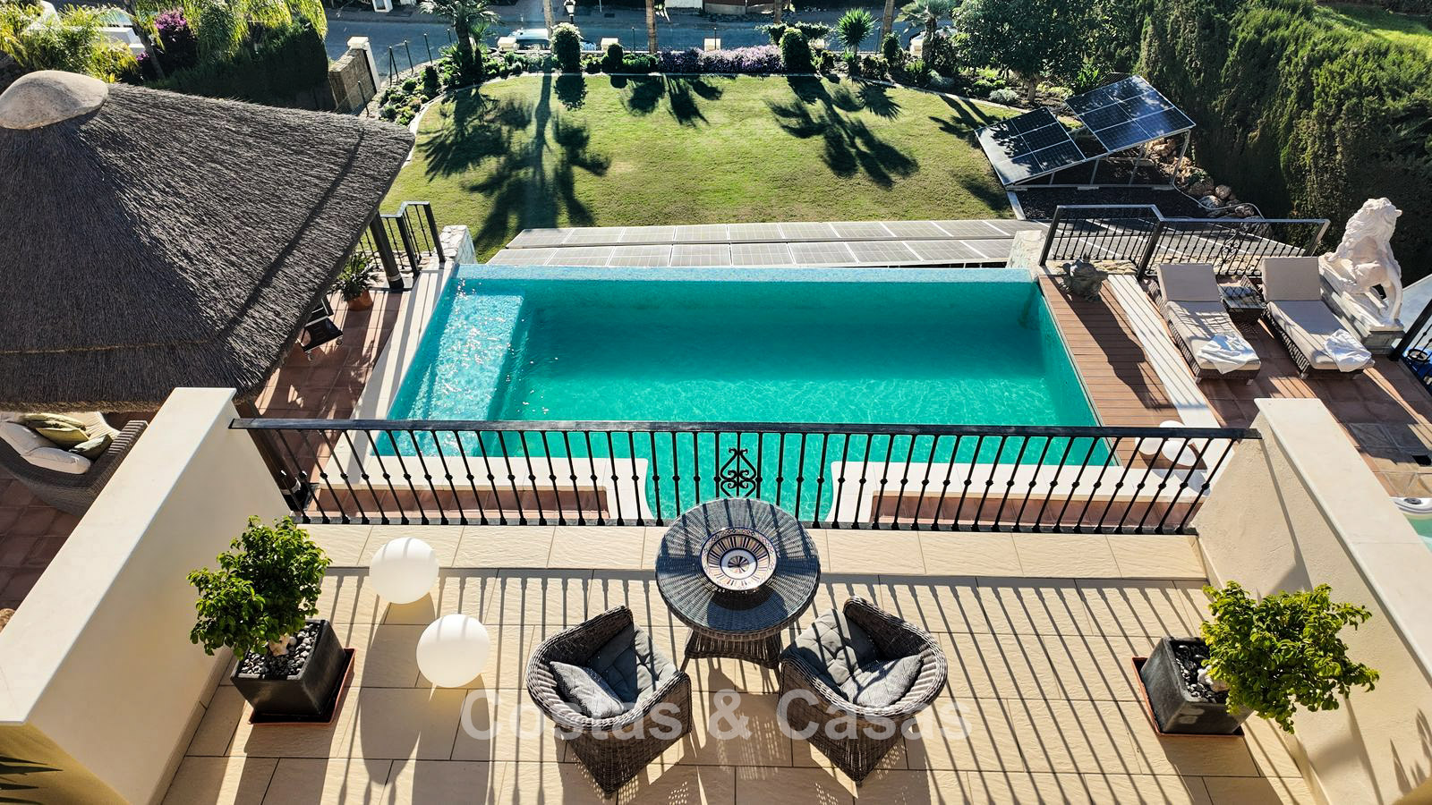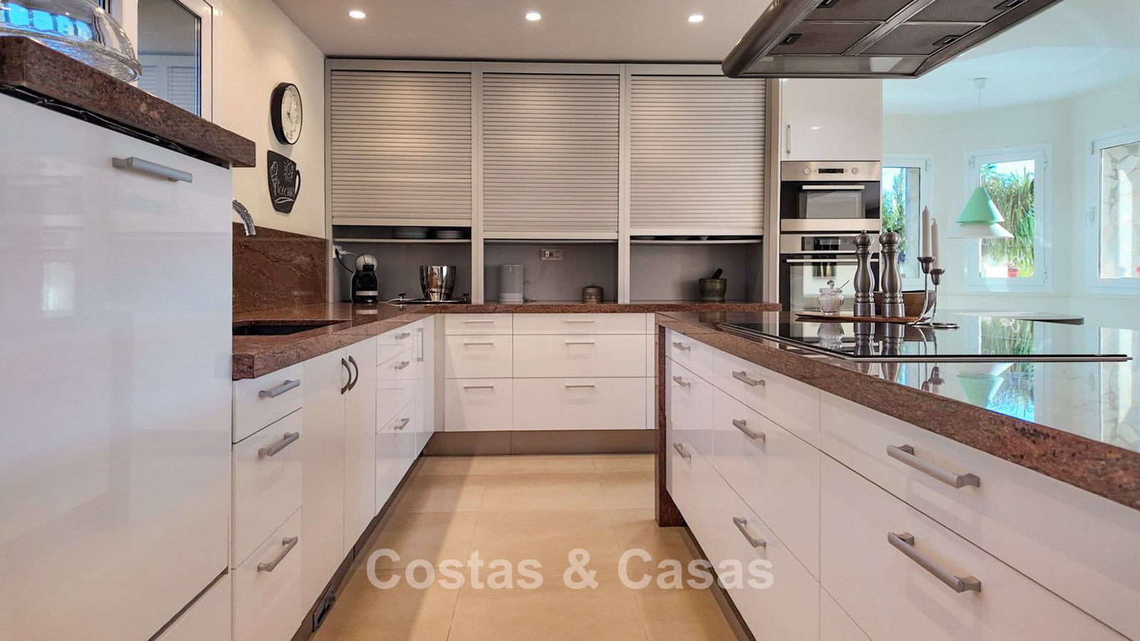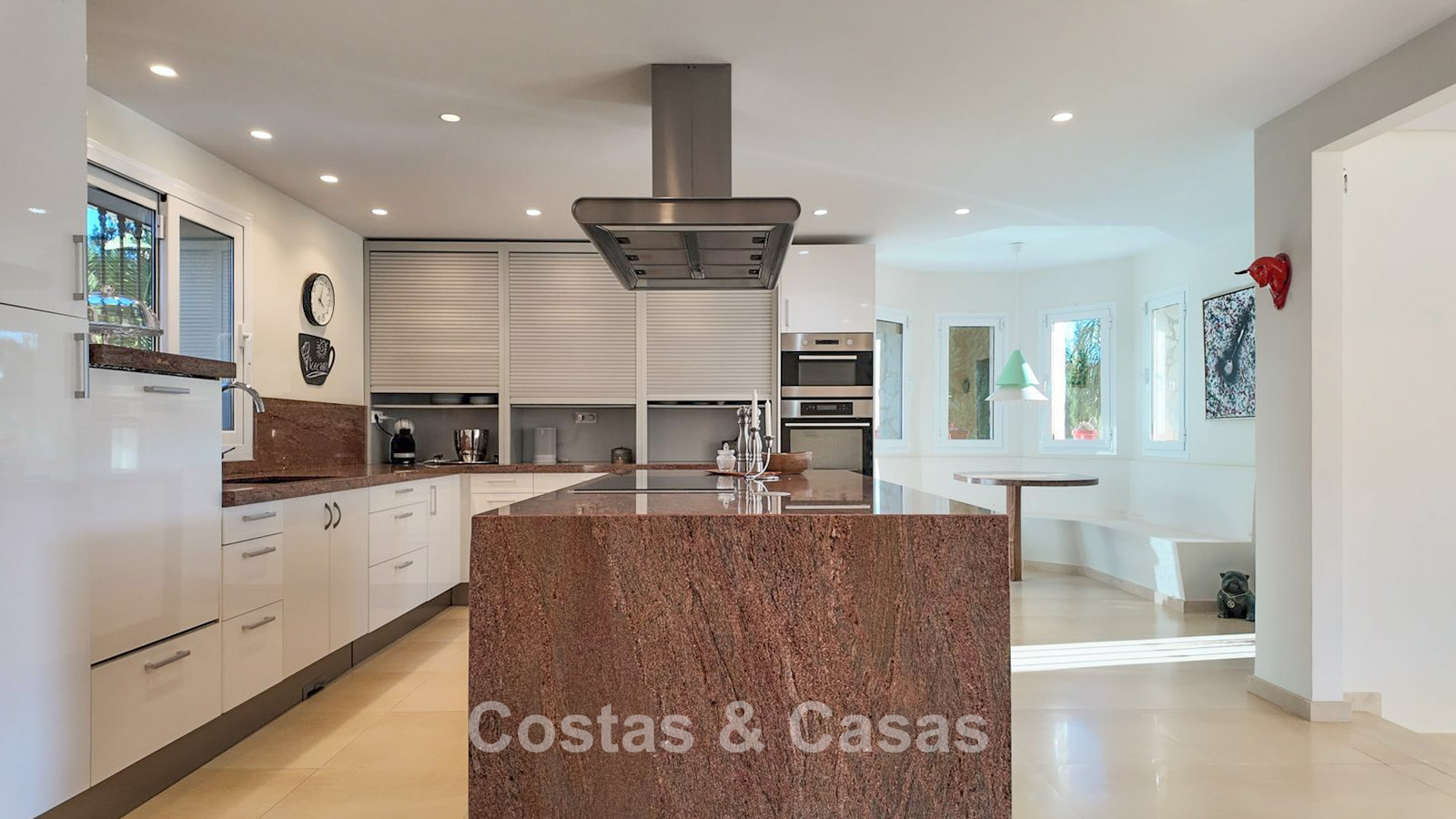 Cette luxueuse villa de style andalou classique respire le charme espagnol. Vous entrez dans le terrain par un double portail électrique et remontez l'allée jusqu'à l'entrée principale de la maison. Les hautes fenêtres coulissantes offrent beaucoup de lumière naturelle. Espace de vie spacieux et ouvert. La cuisine dispose d'appareils électroménagers de qualité, d'un réfrigérateur américain, d'un îlot de cuisson central et d'un coin repas. 4 chambres, 5 salles de bain. La suite parentale de 42 m² est située à l'étage supérieur avec un dressing, une salle de bain attenante et une autre grande terrasse. A l’étage inférieur se trouve un logement d'amis séparé avec 2 chambres, une salle de bain, une kitchenette, un poêle à bois et une entrée privée. Plus loin à cet étage se trouve un espace de loisirs avec un bar bien approvisionné, un home cinéma et une salle de fitness. Buanderie avec lave-linge et sèche-linge. Sols en marbre. Garage intérieur pour 4 voitures. Parking supplémentaire pour au moins 6 voitures.