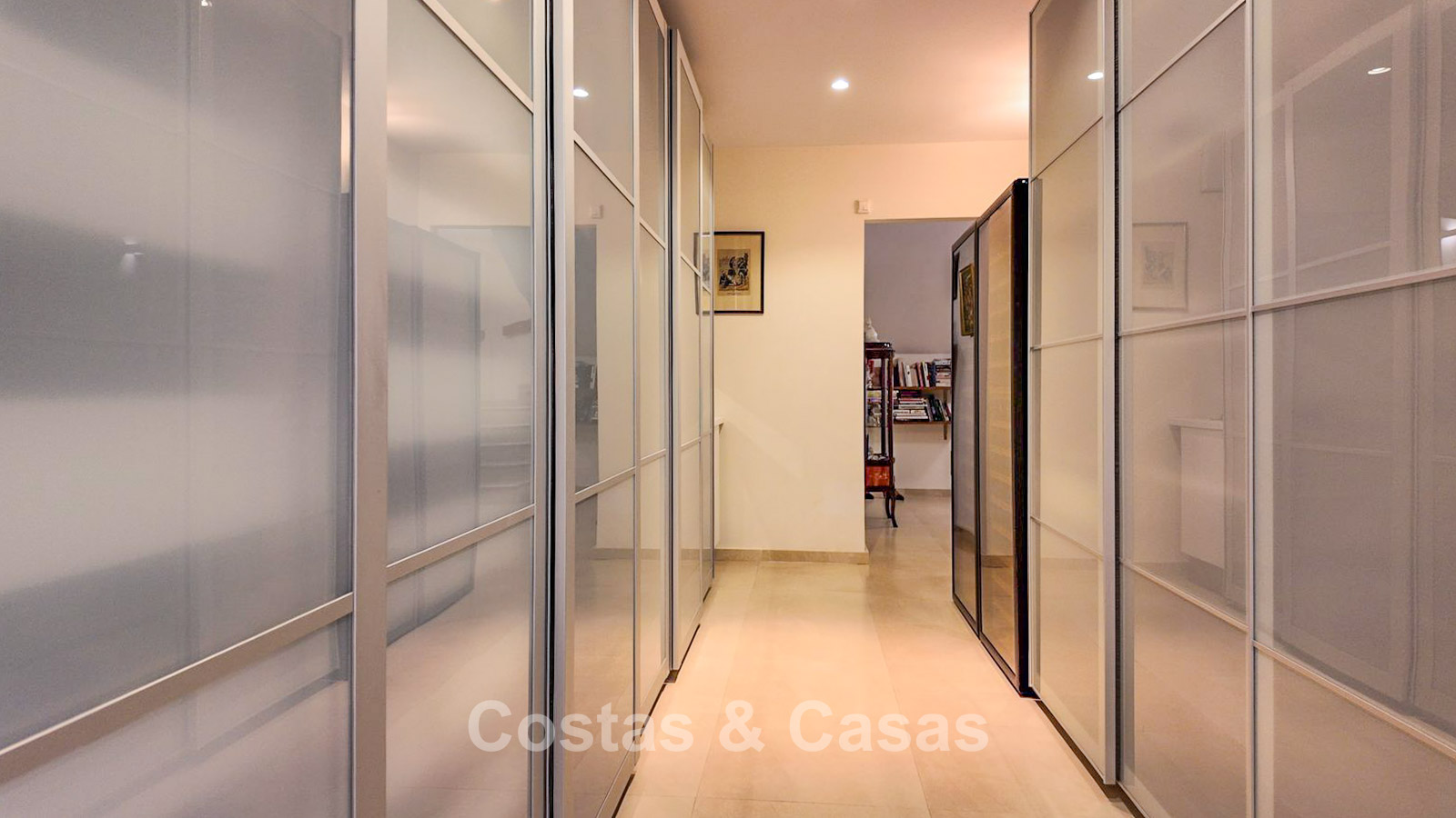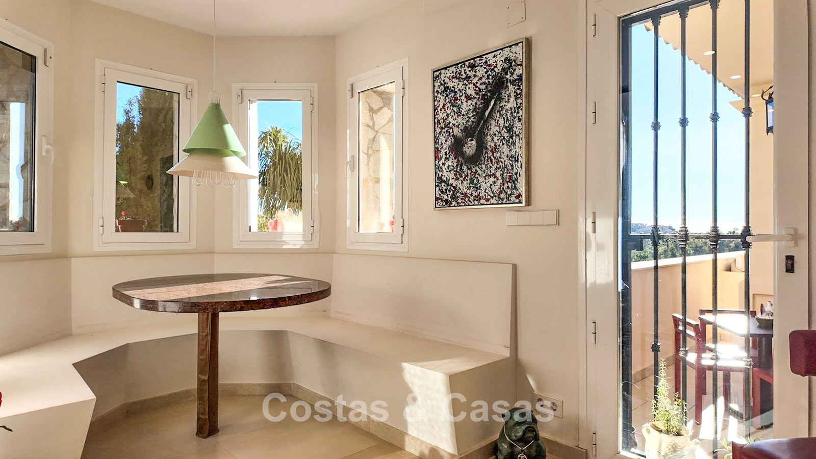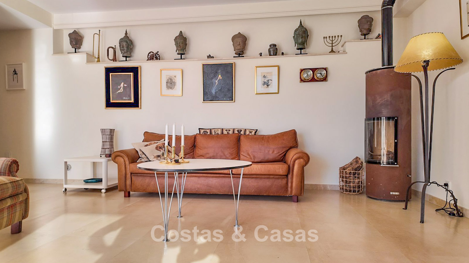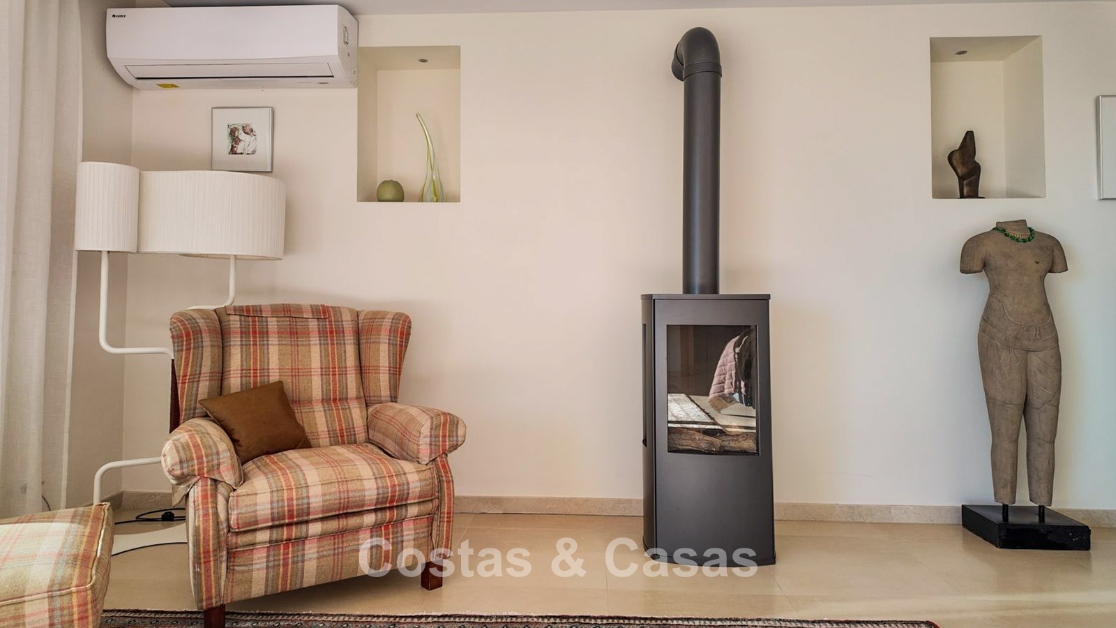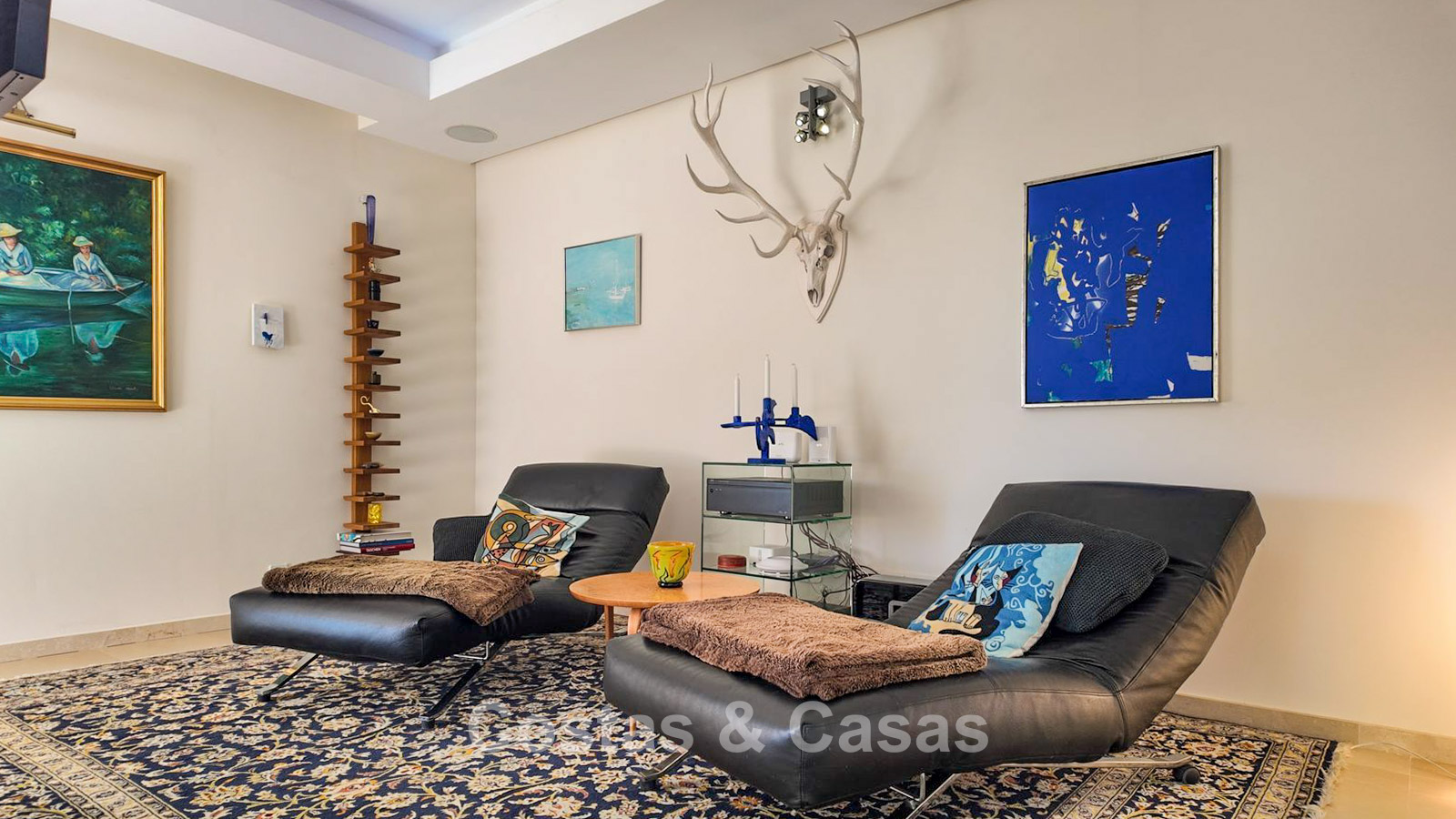 Cette luxueuse villa de style andalou classique respire le charme espagnol. Vous entrez dans le terrain par un double portail électrique et remontez l'allée jusqu'à l'entrée principale de la maison. Les hautes fenêtres coulissantes offrent beaucoup de lumière naturelle. Espace de vie spacieux et ouvert. La cuisine dispose d'appareils électroménagers de qualité, d'un réfrigérateur américain, d'un îlot de cuisson central et d'un coin repas. 4 chambres, 5 salles de bain. La suite parentale de 42 m² est située à l'étage supérieur avec un dressing, une salle de bain attenante et une autre grande terrasse. A l’étage inférieur se trouve un logement d'amis séparé avec 2 chambres, une salle de bain, une kitchenette, un poêle à bois et une entrée privée. Plus loin à cet étage se trouve un espace de loisirs avec un bar bien approvisionné, un home cinéma et une salle de fitness. Buanderie avec lave-linge et sèche-linge. Sols en marbre. Garage intérieur pour 4 voitures. Parking supplémentaire pour au moins 6 voitures.