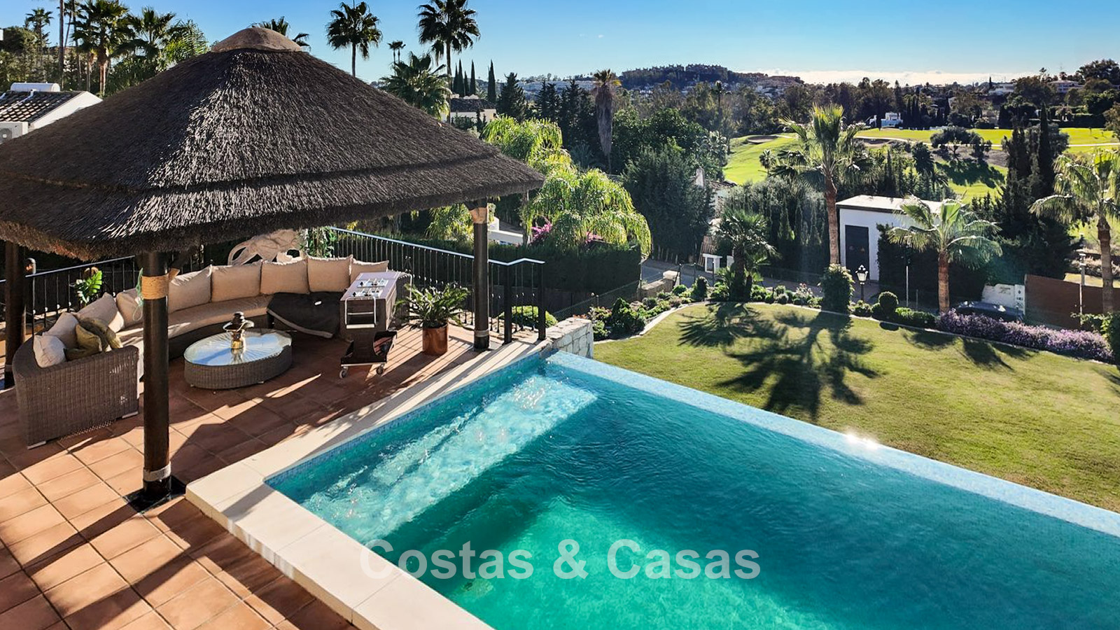 Grand terrain situé en position surélevée. Jardin paysager soigné avec de grands cyprès, des plantations tropicales et une pelouse. Grande piscine à débordement chauffée avec gazebo adjacent et barbecue. De vastes terrasses ouvertes et couvertes entourent en partie la villa et offrent divers coins salon, parfaits pour se détendre et profiter des vues panoramiques. Orientée sud-ouest. Vue imprenable sur le parcours de golf et le paysage montagneux pittoresque à l'arrière de la maison.