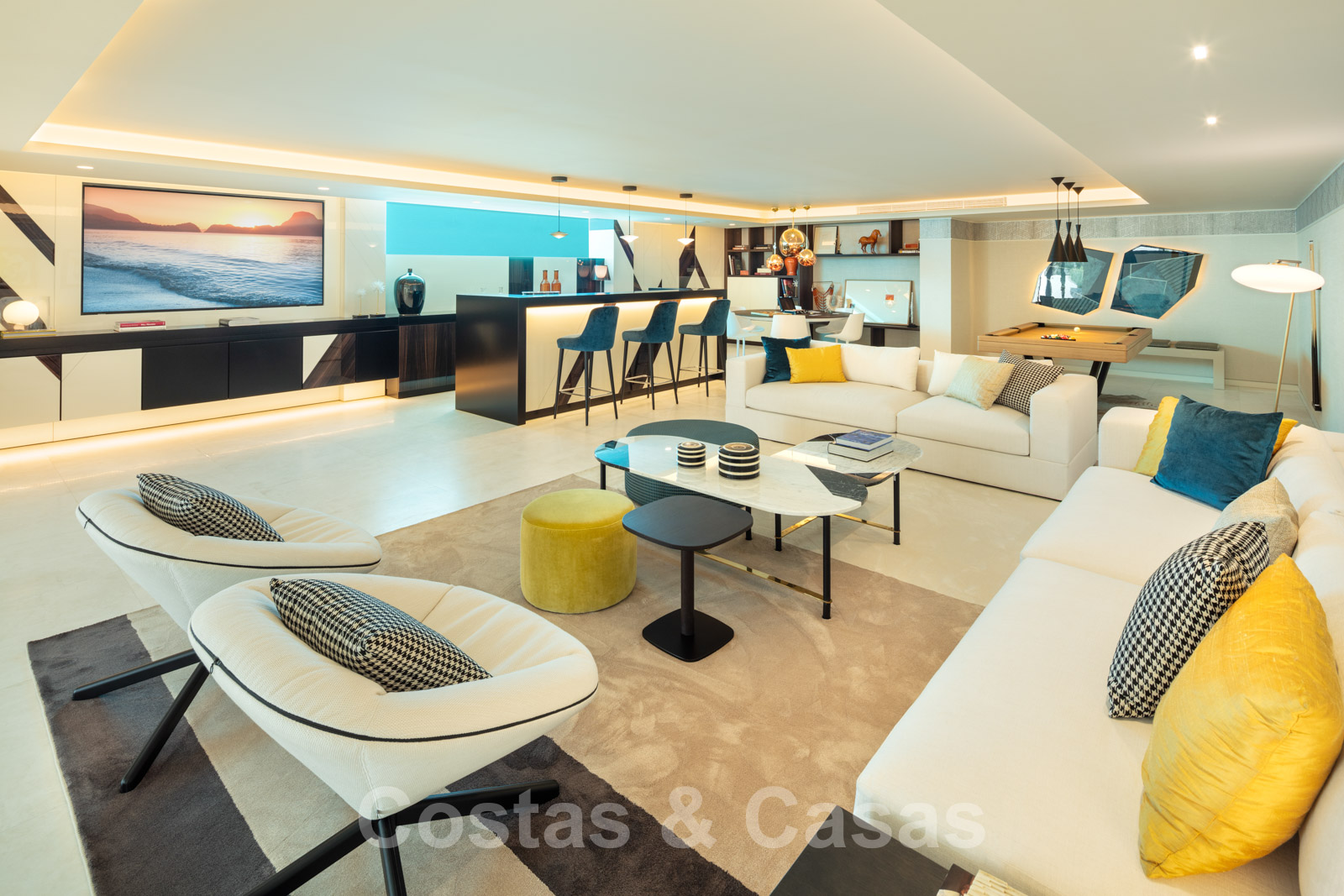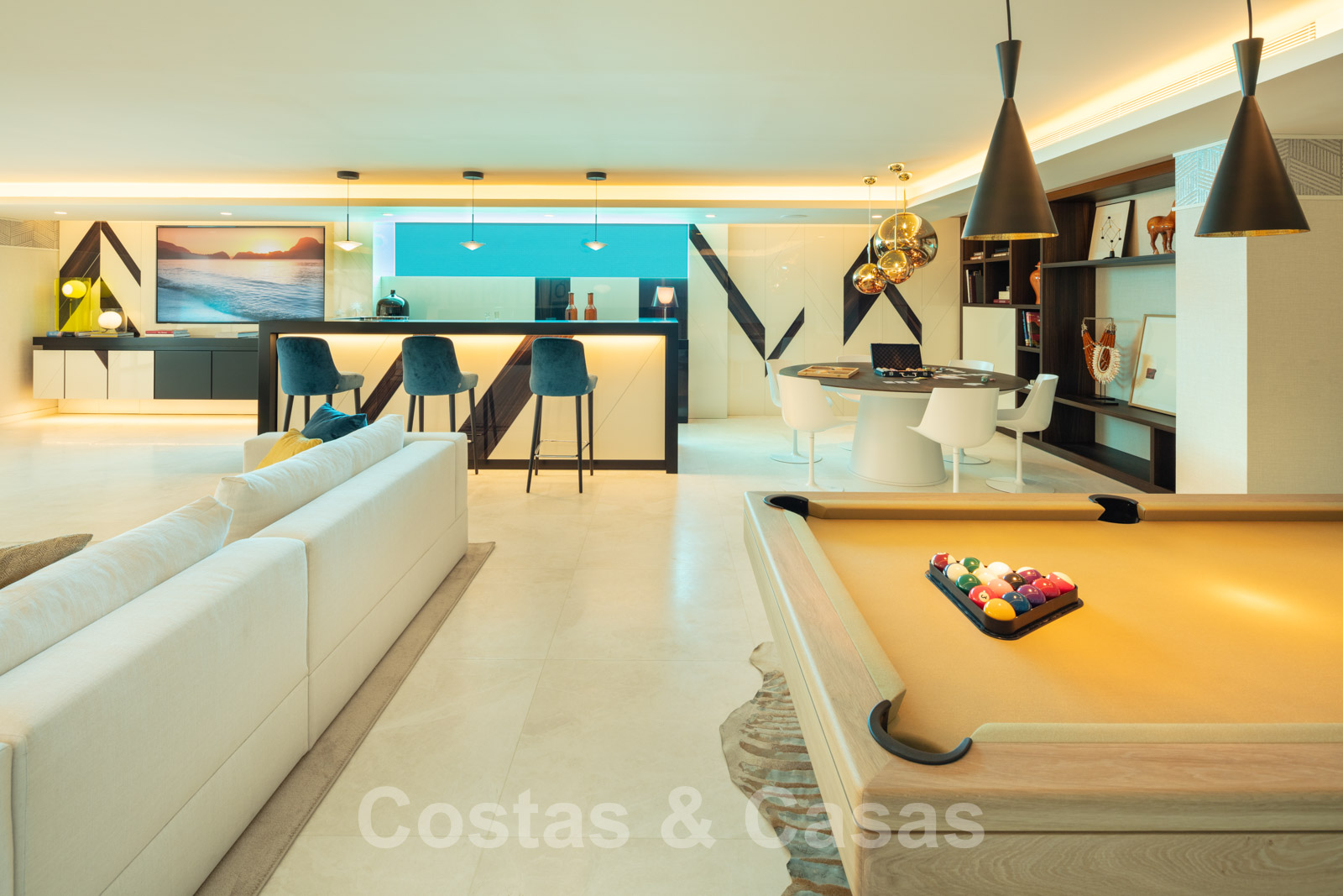 Le rez-de-chaussée spacieux est meublé d'un bar à cocktails, d'un billard, d'une table de jeux, d'un coin salon spacieux et d'une télévision.