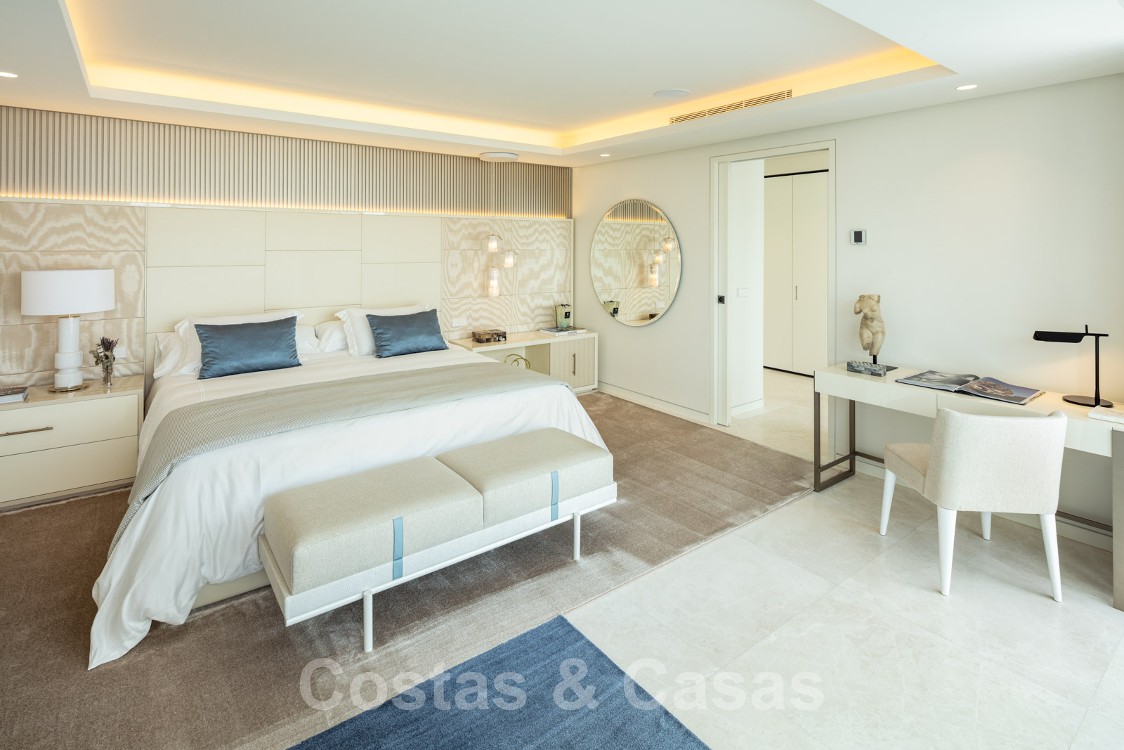 La suite principale dispose d'un dressing et la salle de bains est équipée de deux lavabos, d'une baignoire et d'une douche à l'italienne. Une grande terrasse en L est adjacente.