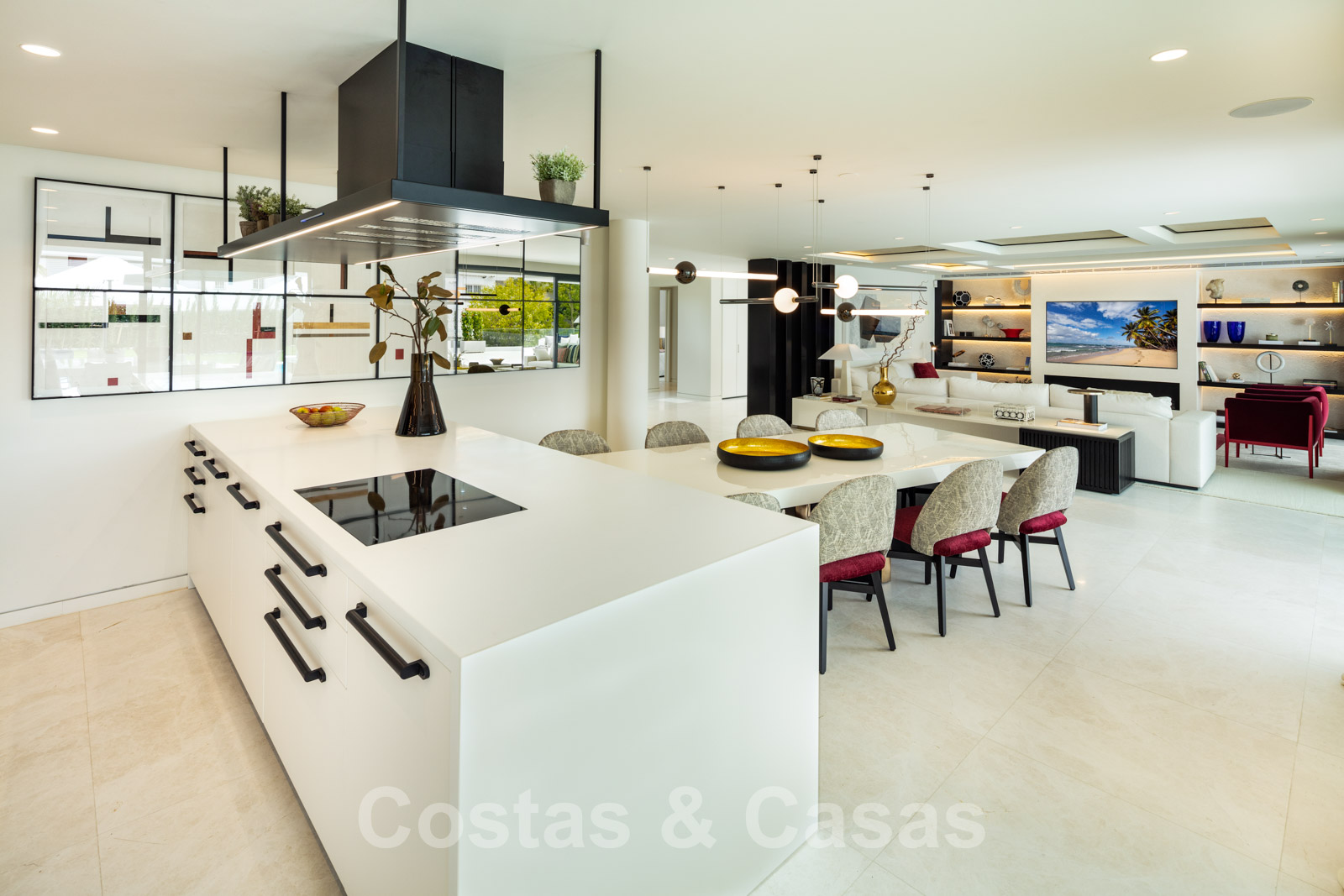 Spacieux salon ouvert avec cheminée et cuisine Boffi avec îlot de cuisson et table à manger intégrée.