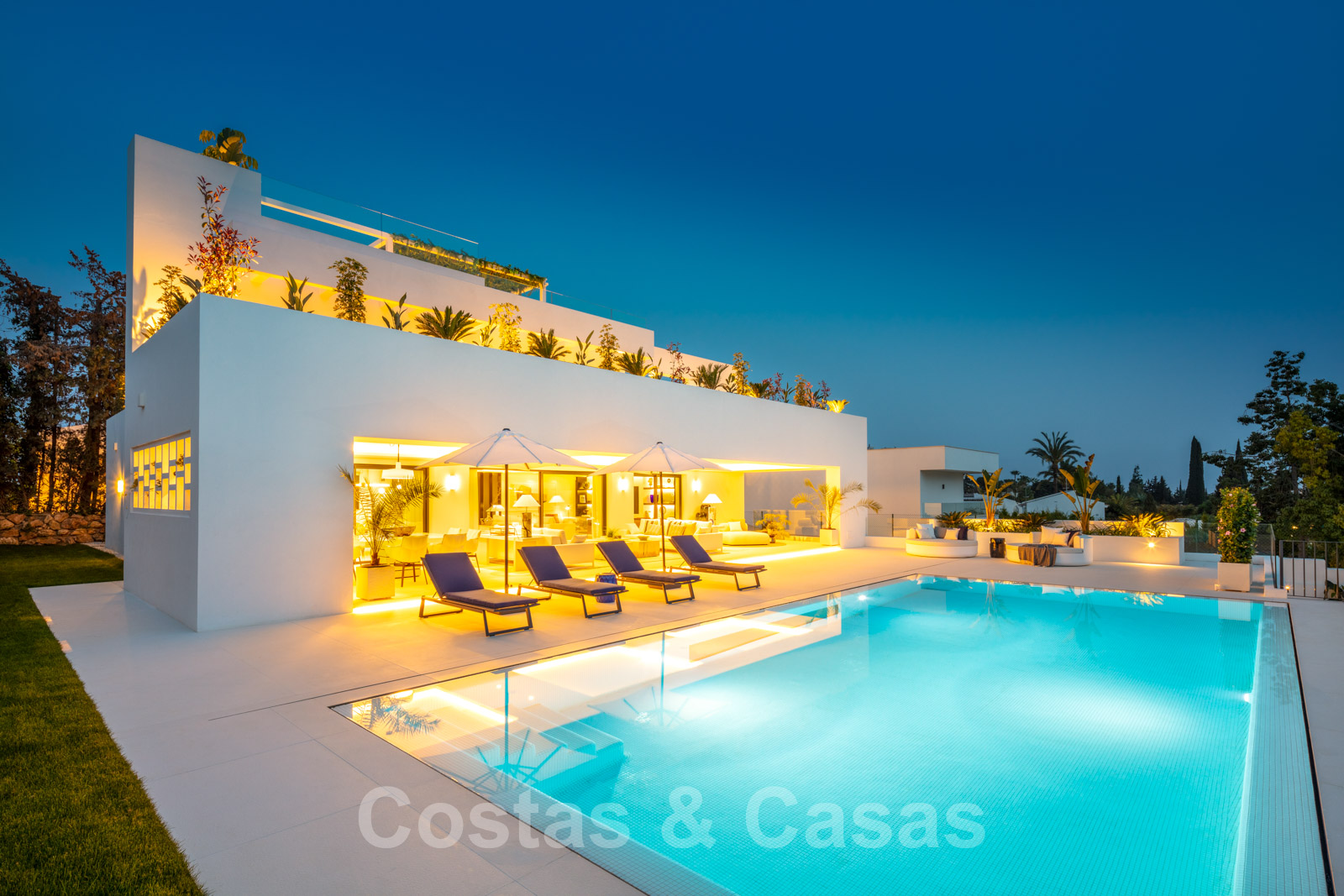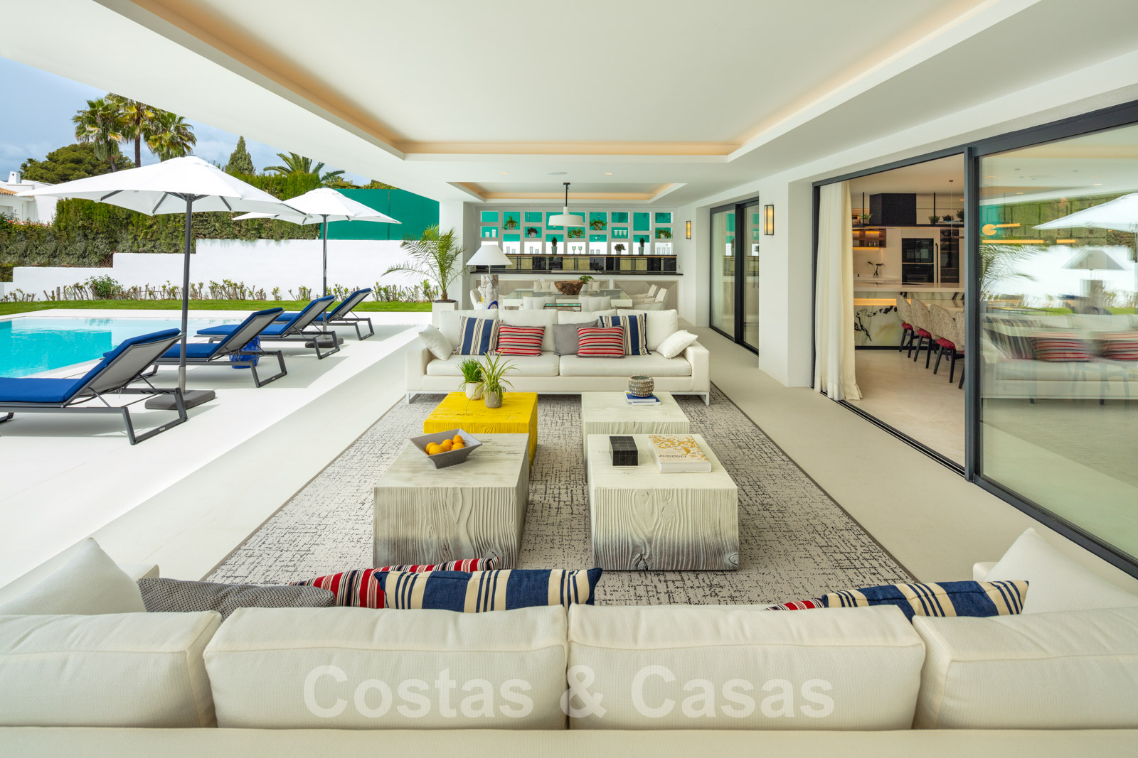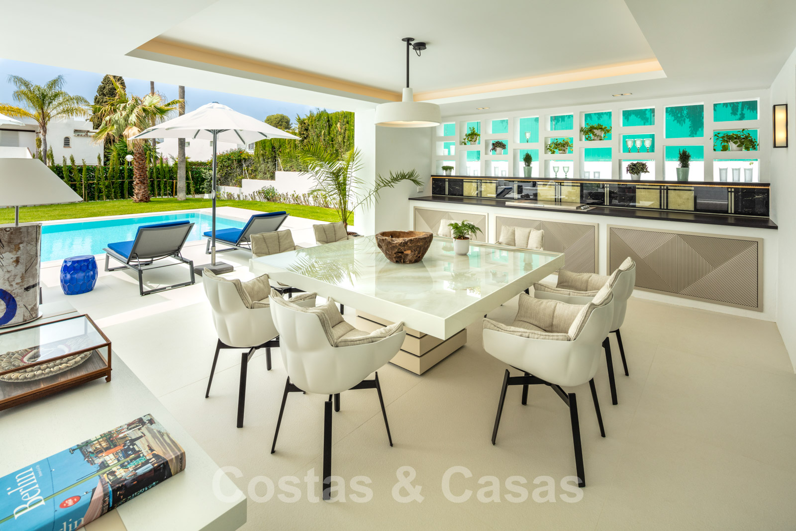 Villa design et chaleureuse, axée sur le divertissement Matériaux et finitions de qualité supérieure Orientation sud-ouest Piscine d'eau salée avec terrasse spacieuse et pelouse attenante