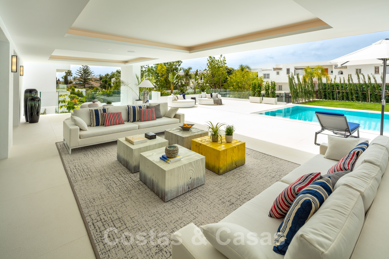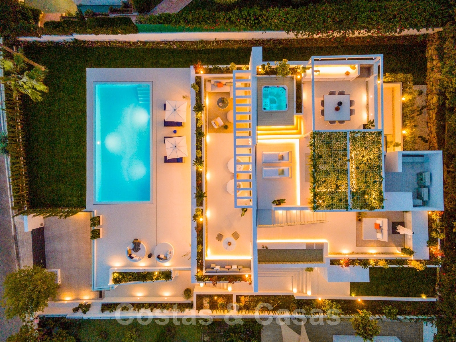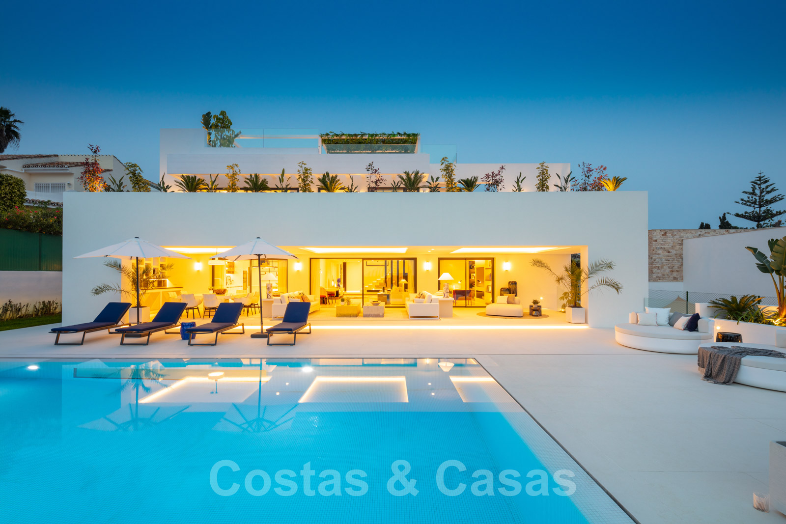 Villa design et chaleureuse, axée sur le divertissement Matériaux et finitions de qualité supérieure Orientation sud-ouest Piscine d'eau salée avec terrasse spacieuse et pelouse attenante