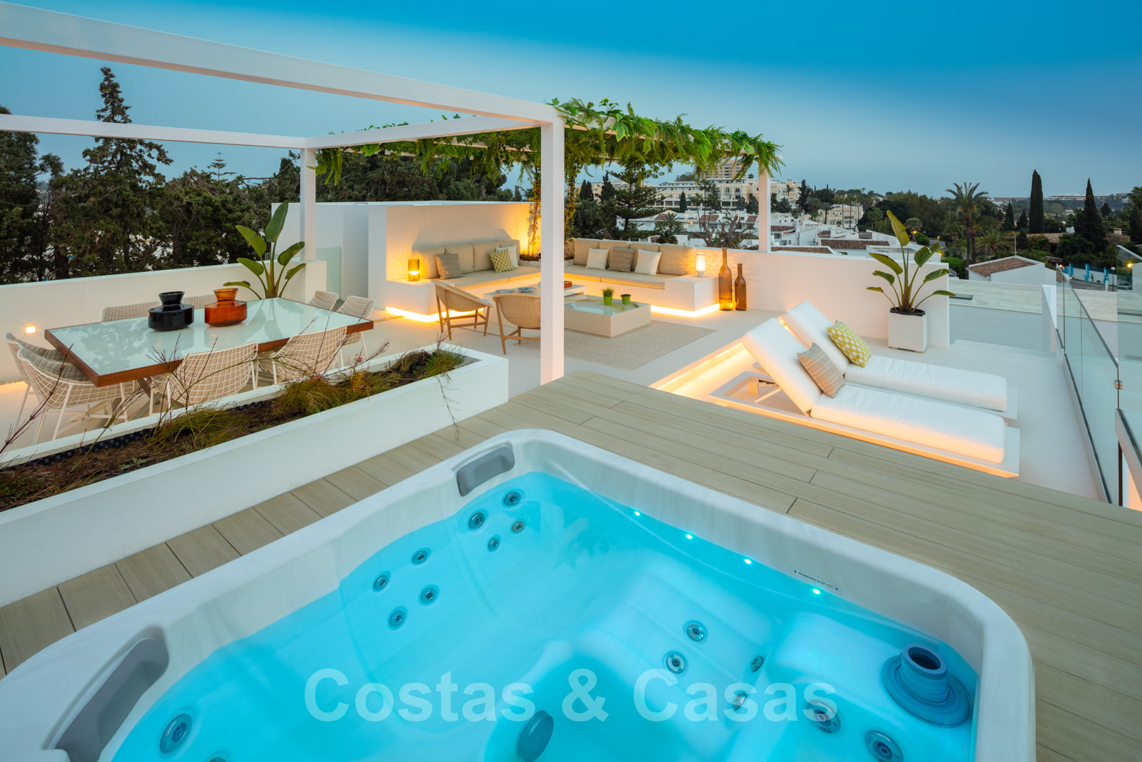 Sur le toit-terrasse, vous trouverez un coin salon partiellement couvert, une table à manger pour 8 personnes, un barbecue, un comptoir avec évier et un jacuzzi intégré.