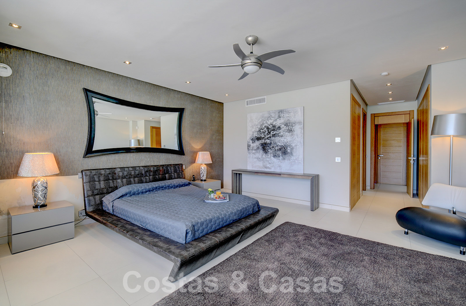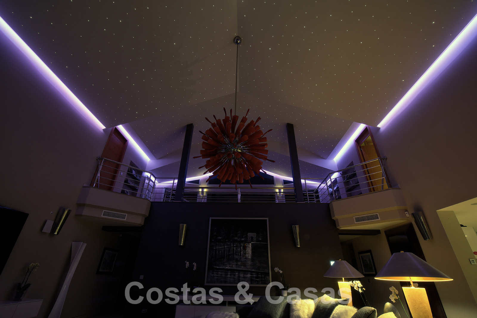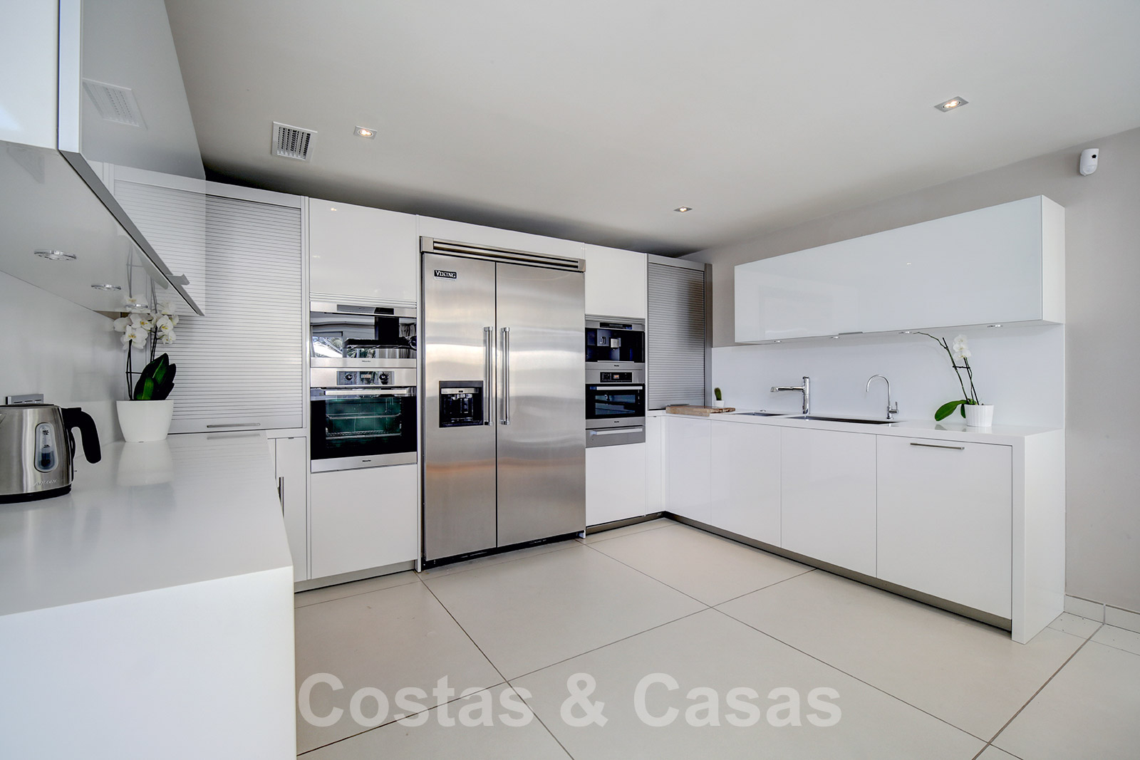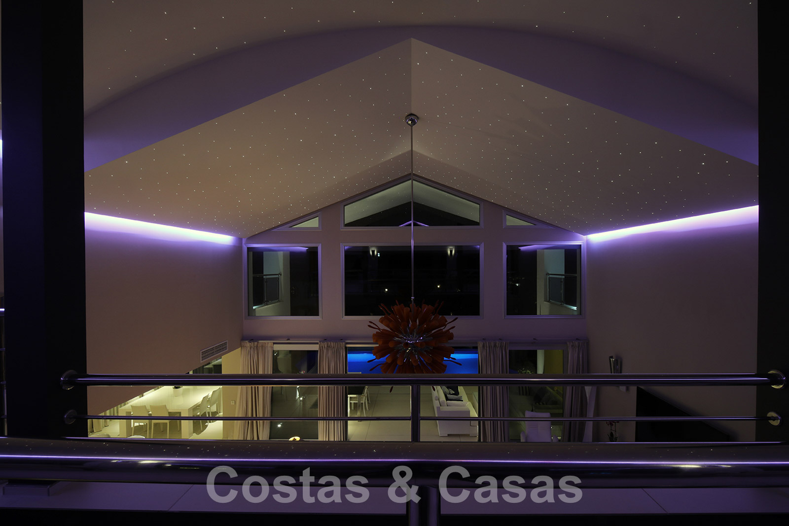 Balustrades en verre autour de la terrasse. Climatisation pour le refroidissement et le chauffage. Carrelage de qualité grand format. Armoires encastrées. Auvents motorisés sur la terrasse. Lumière d'extérieure. Système d'alarme.