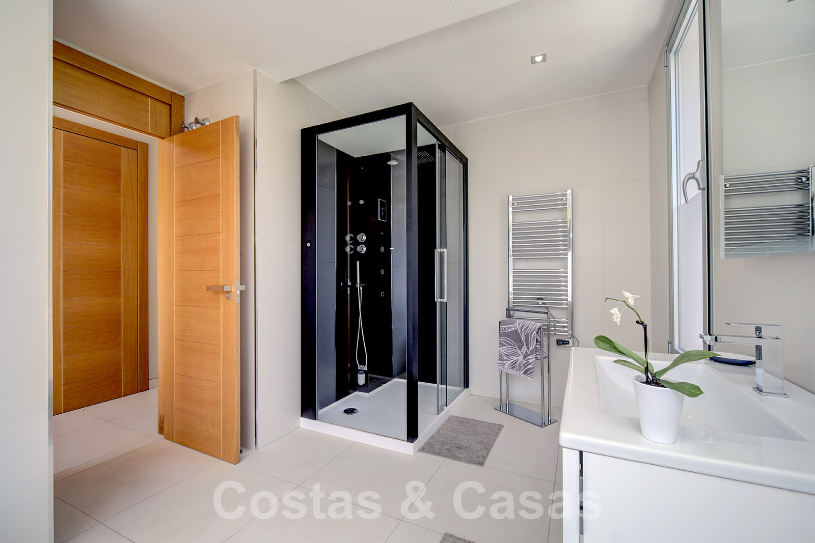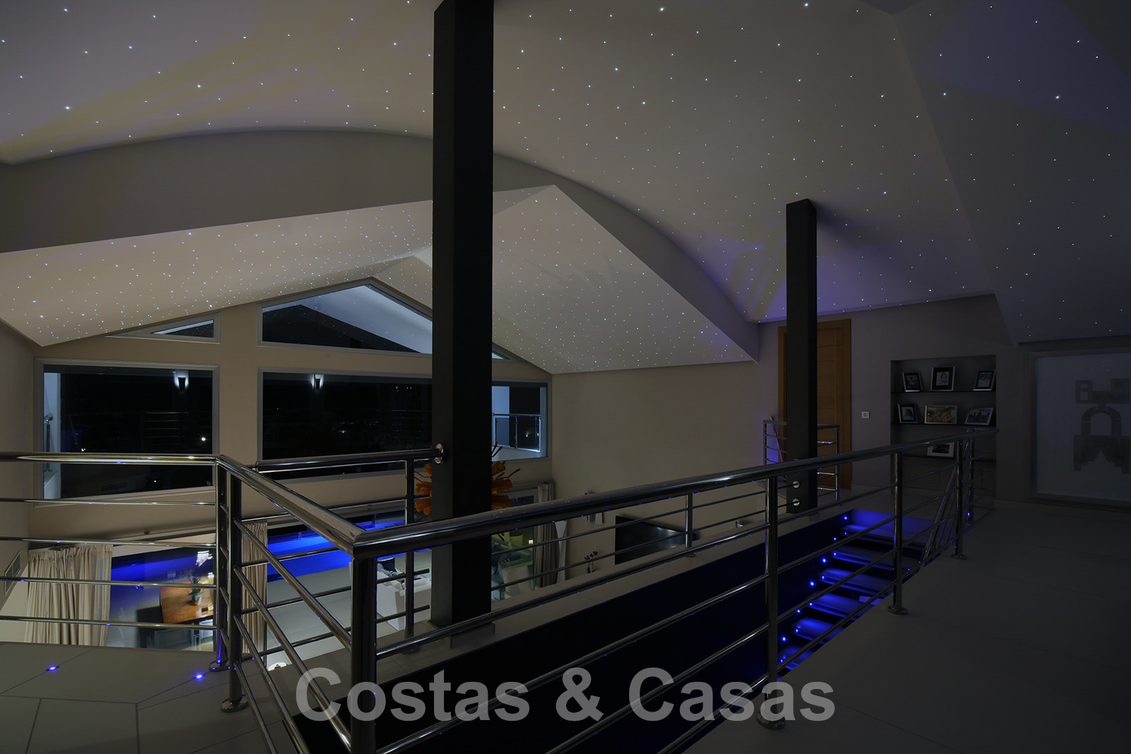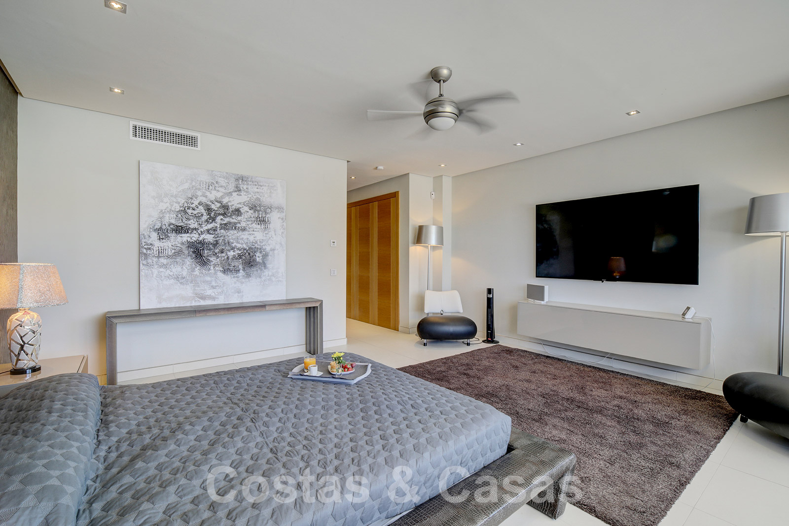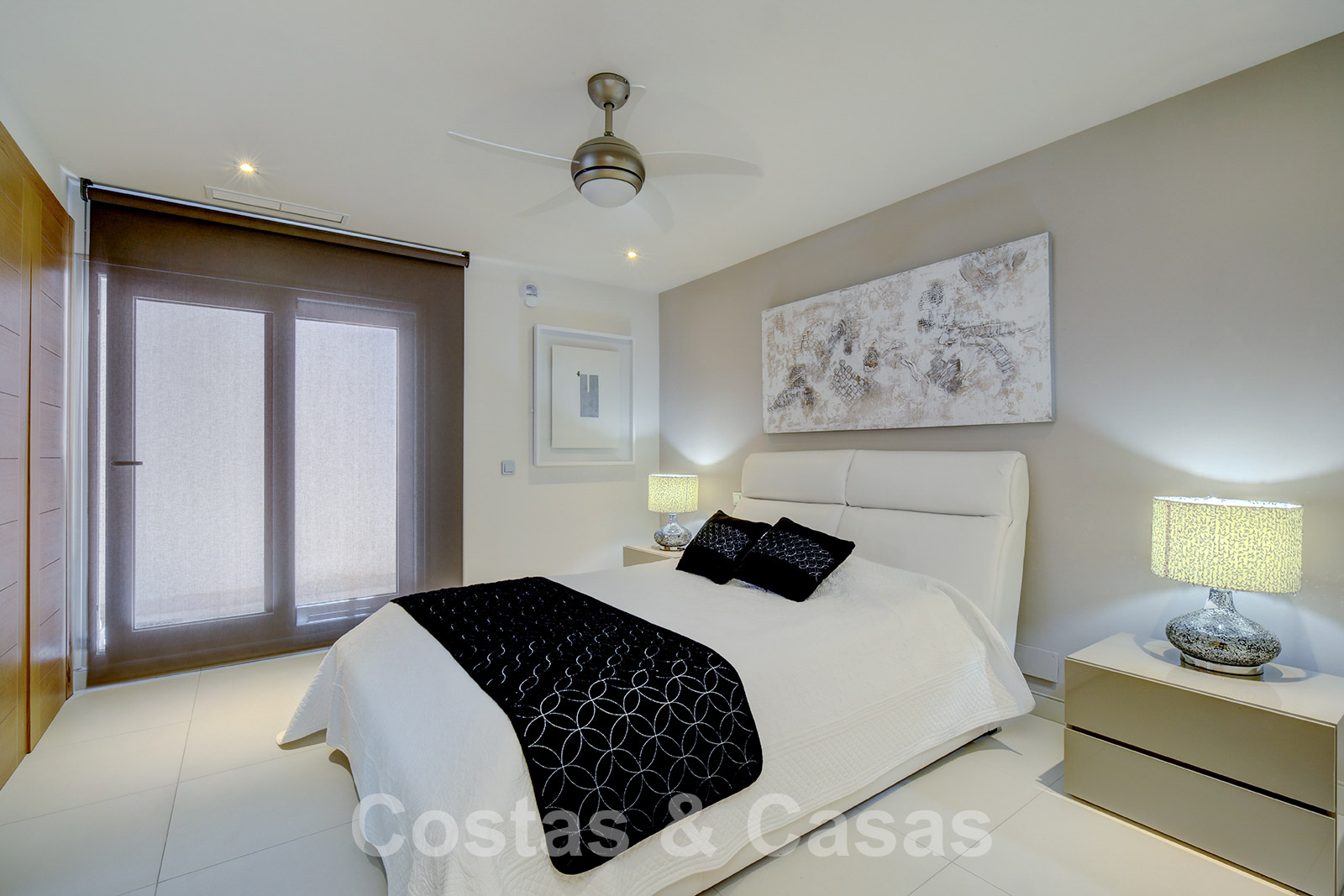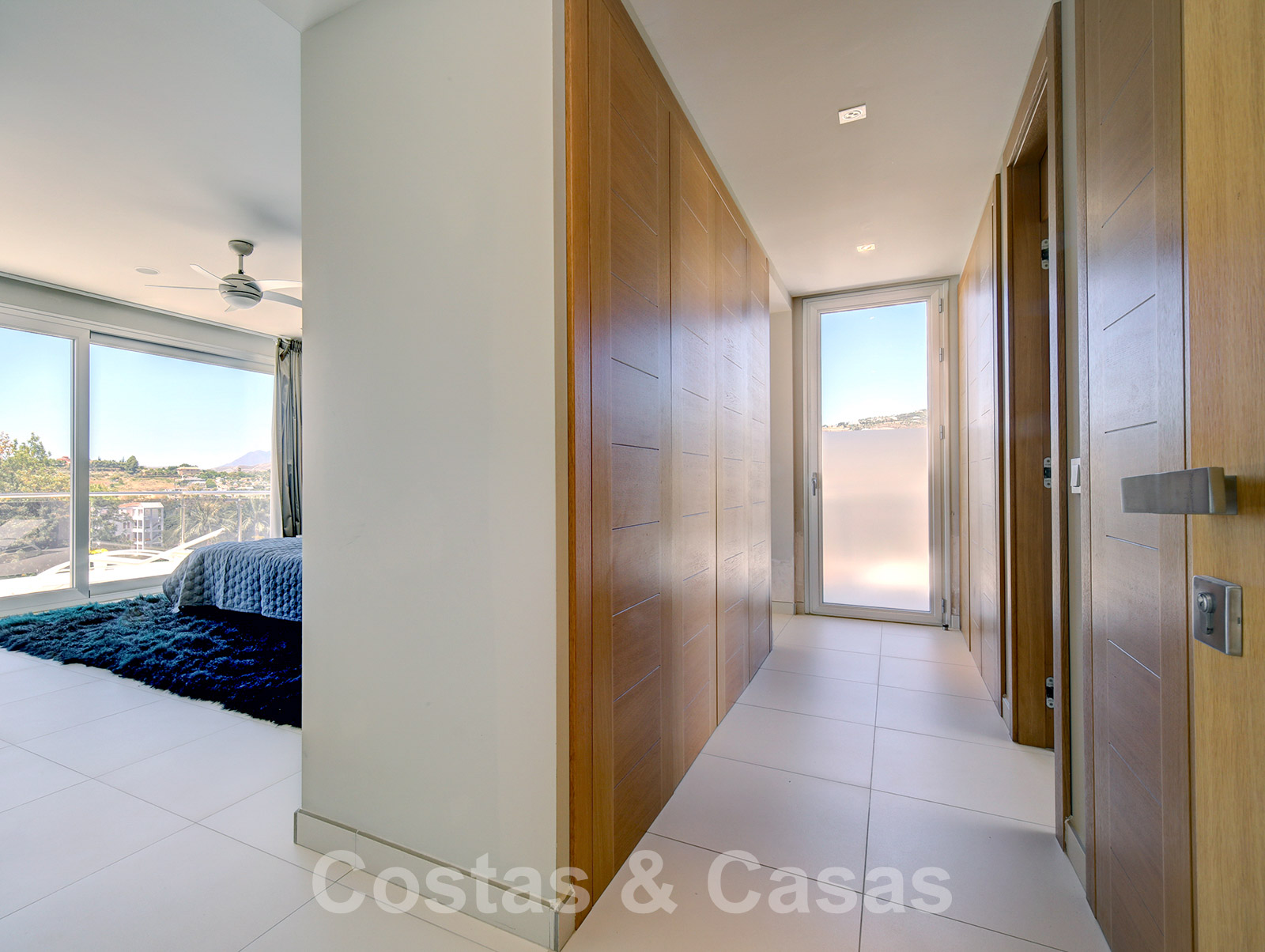 Balustrades en verre autour de la terrasse. Climatisation pour le refroidissement et le chauffage. Carrelage de qualité grand format. Armoires encastrées. Auvents motorisés sur la terrasse. Lumière d'extérieure. Système d'alarme.