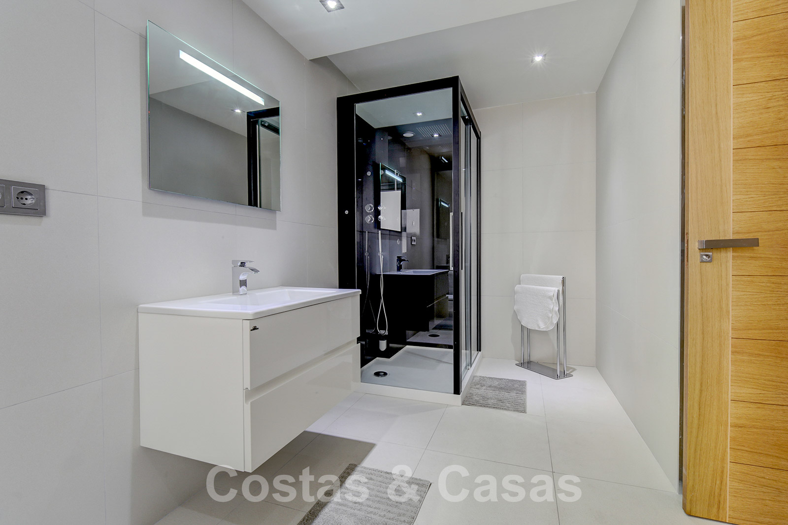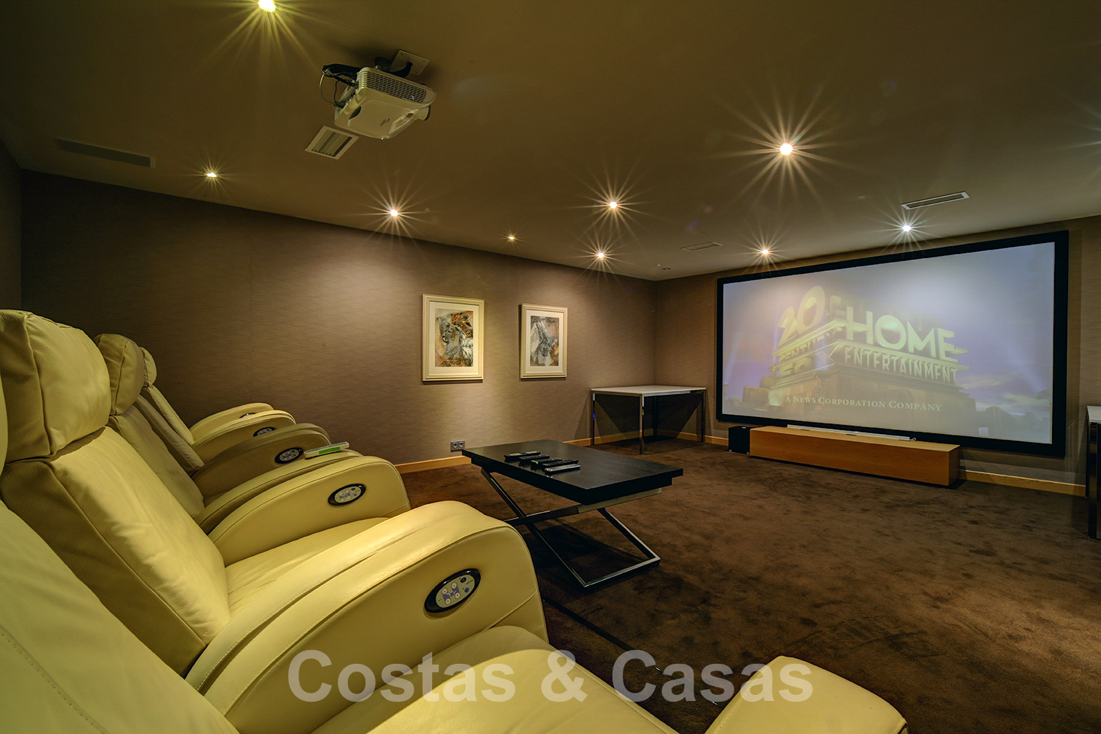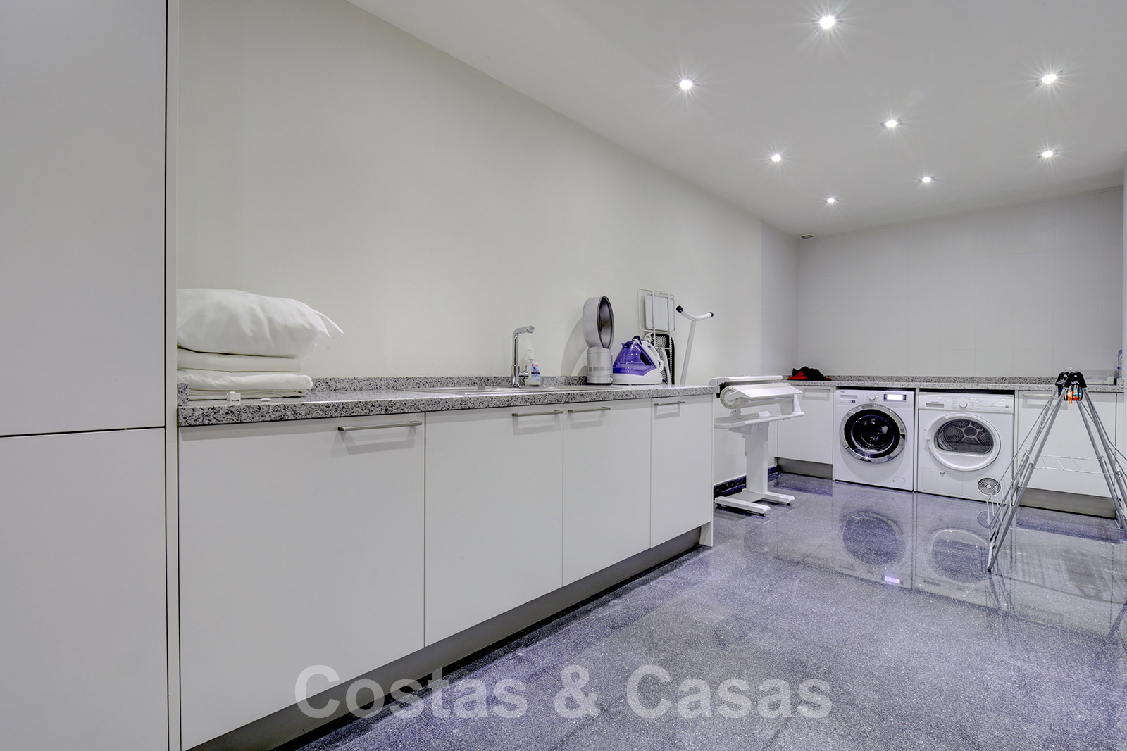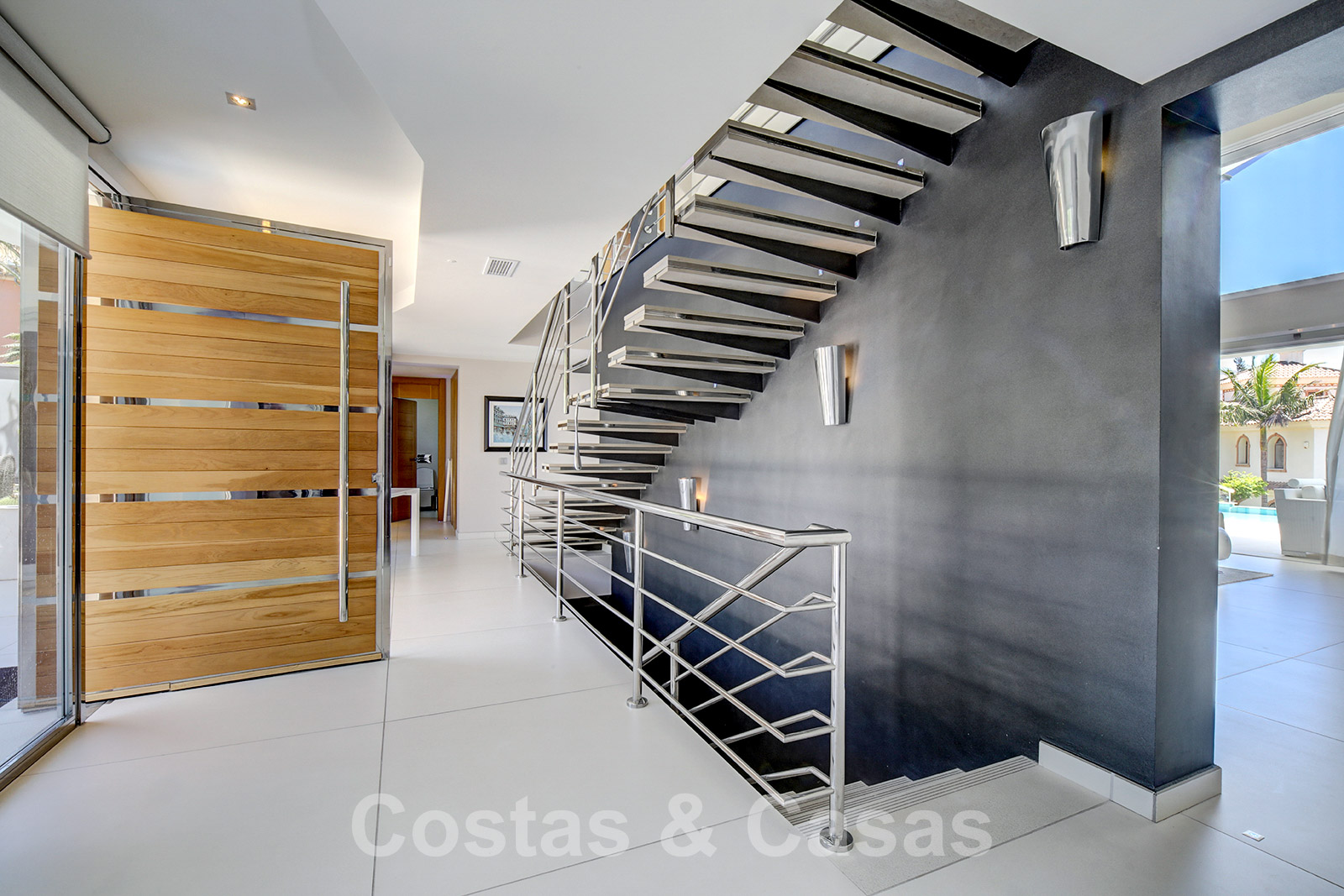 Balustrades en verre autour de la terrasse. Climatisation pour le refroidissement et le chauffage. Carrelage de qualité grand format. Armoires encastrées. Auvents motorisés sur la terrasse. Lumière d'extérieure. Système d'alarme.