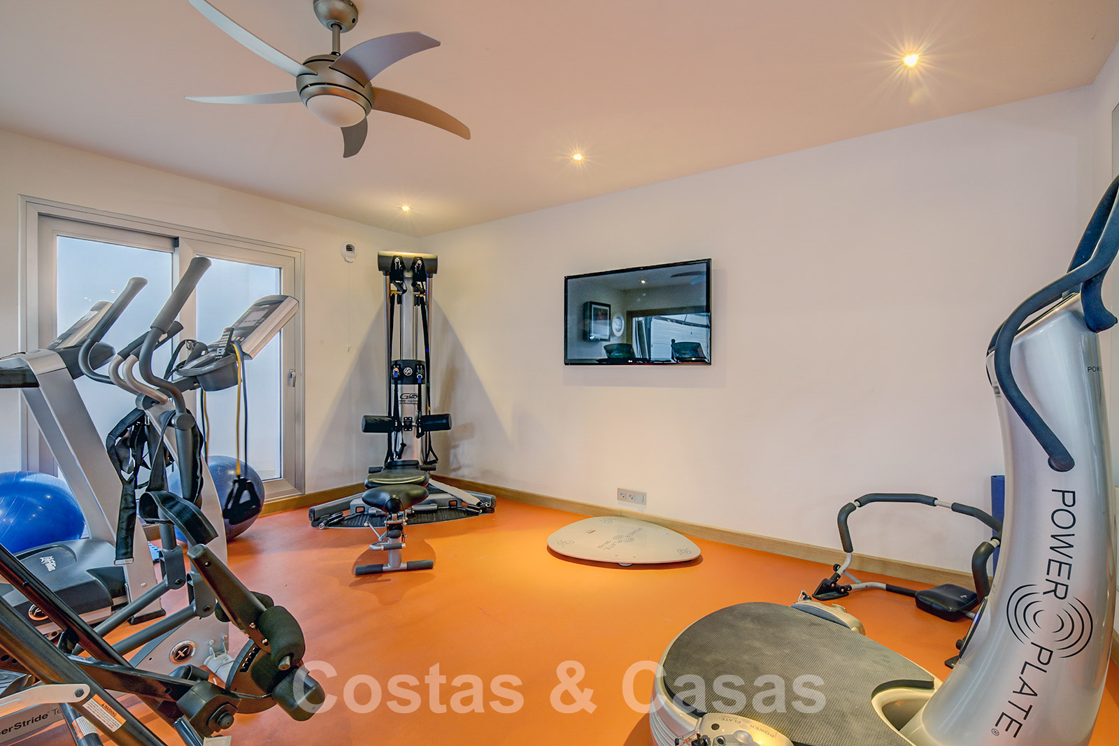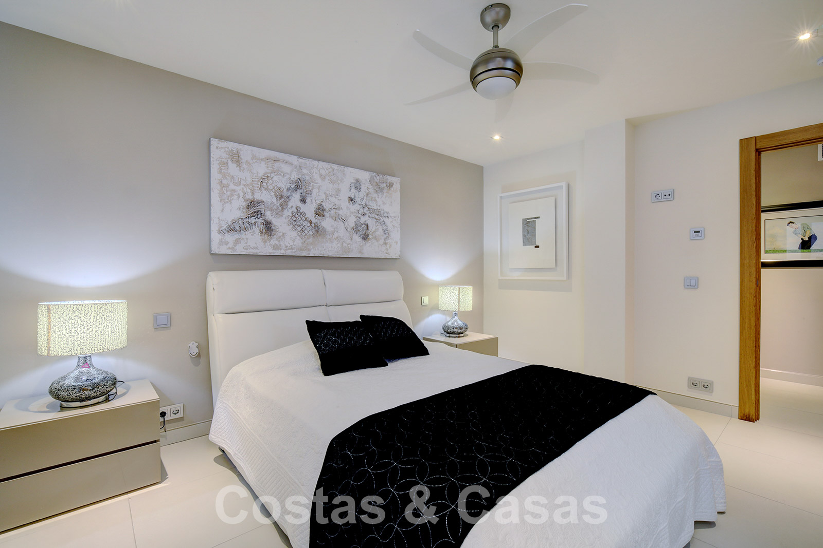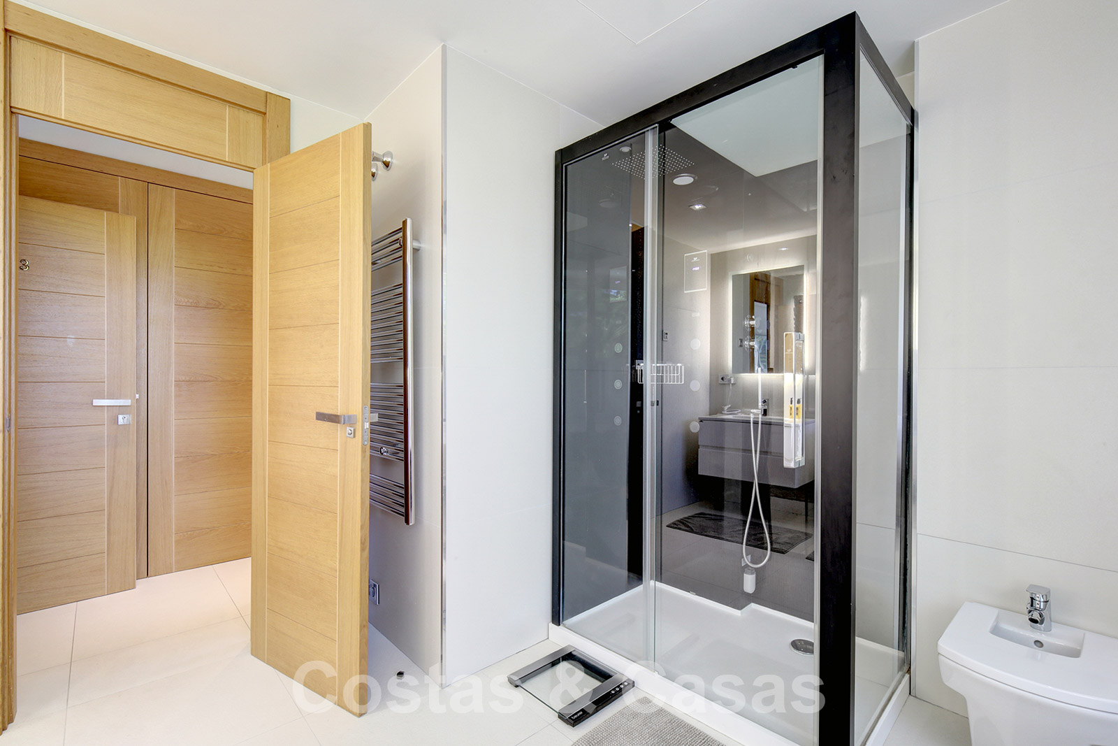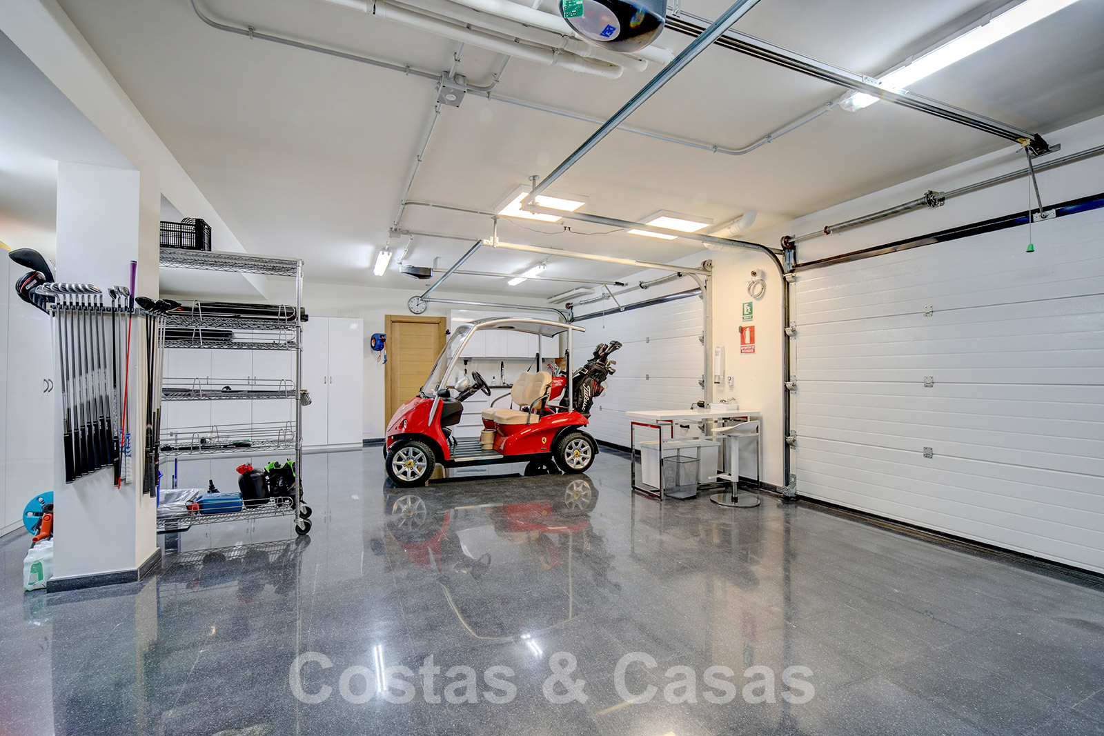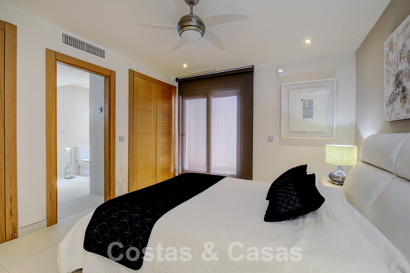 Balustrades en verre autour de la terrasse. Climatisation pour le refroidissement et le chauffage. Carrelage de qualité grand format. Armoires encastrées. Auvents motorisés sur la terrasse. Lumière d'extérieure. Système d'alarme.