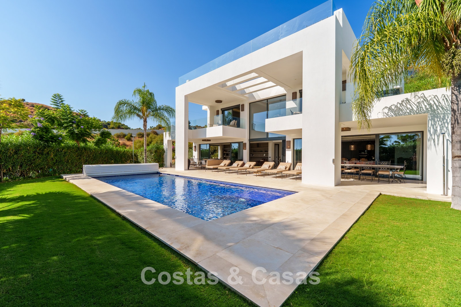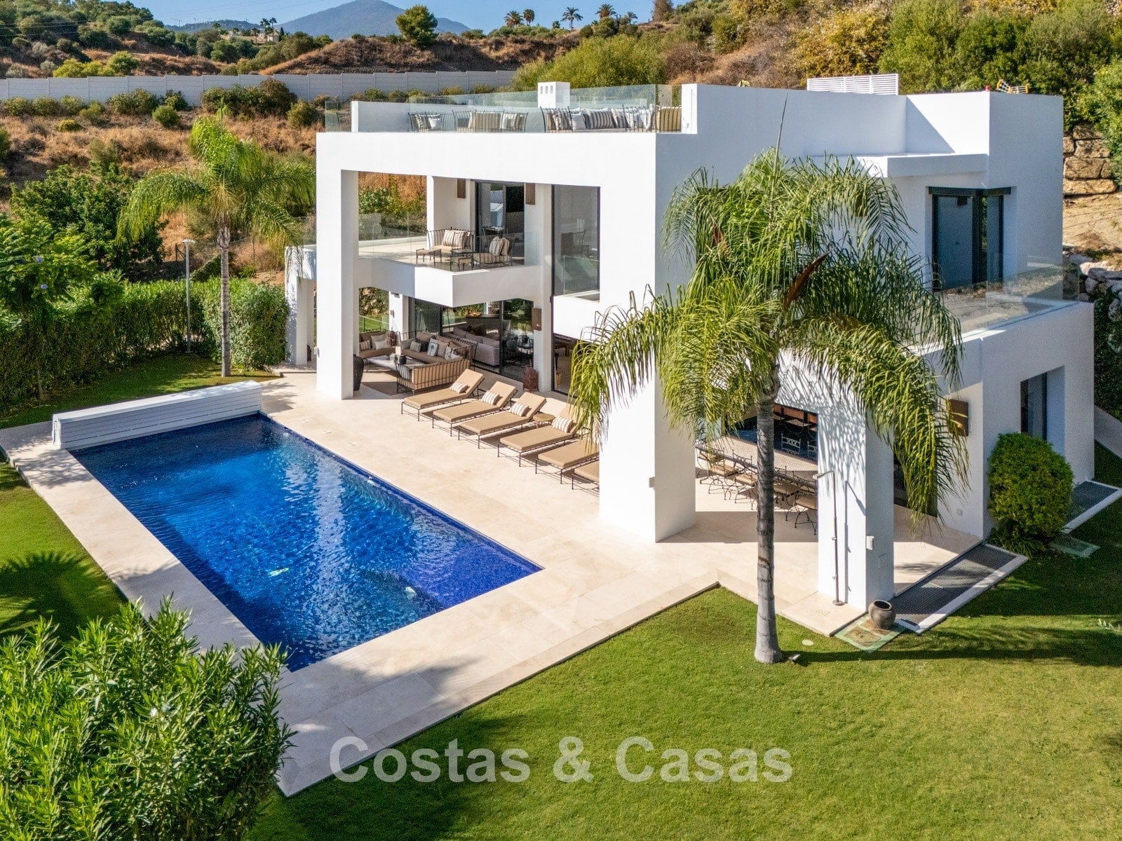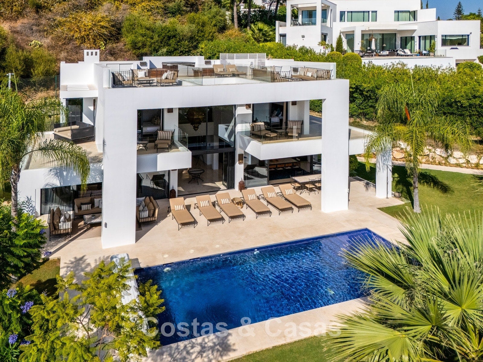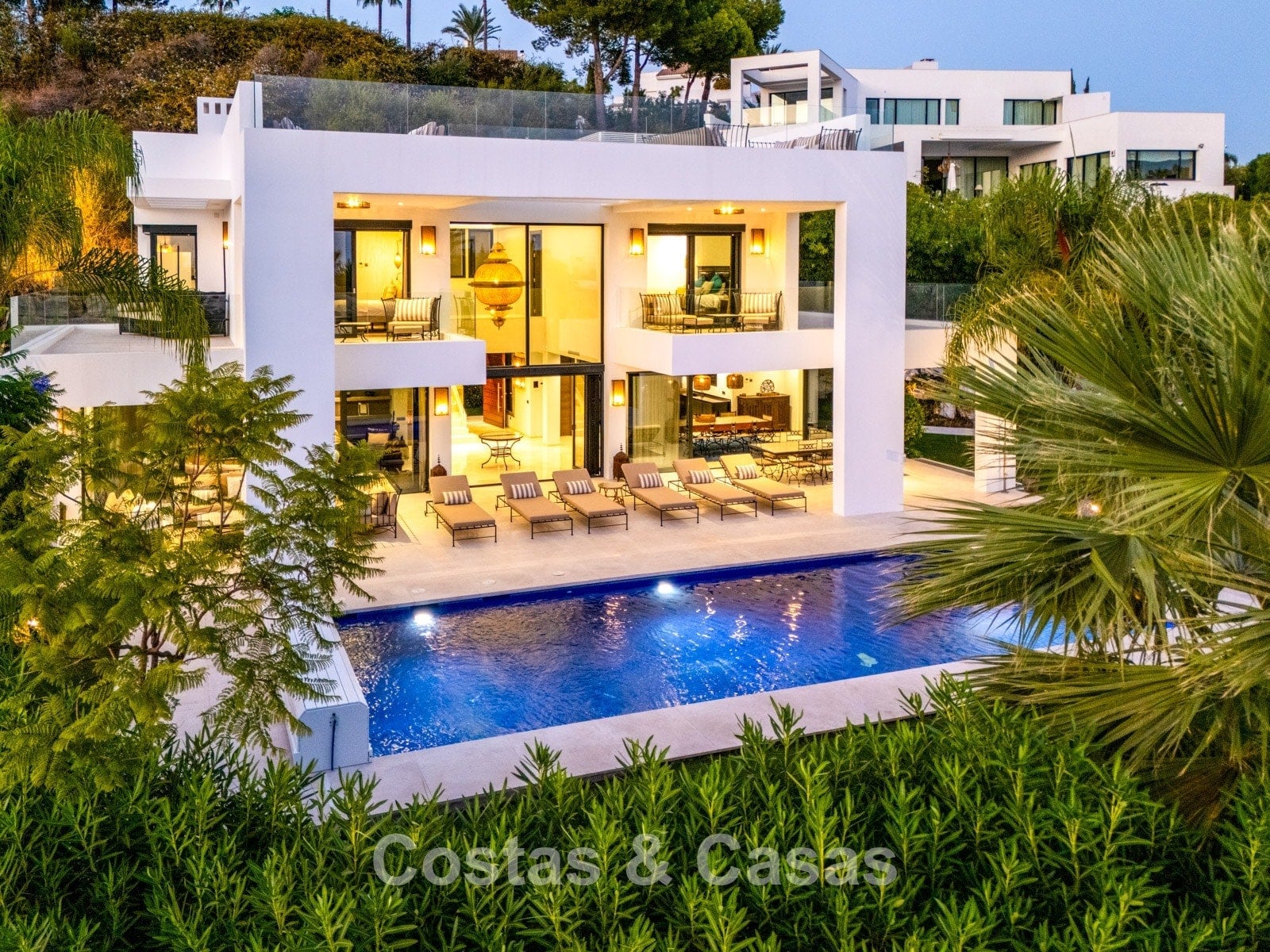Autres caractéristiques: Climatisation réversible Chauffage au sol dans les salles de bains Cheminée moderne Placards intégrés Double vitrage Sols en marbre Garde-corps en verre Système d’alarme avancé Éclairage LED intérieur et extérieur Douche extérieure