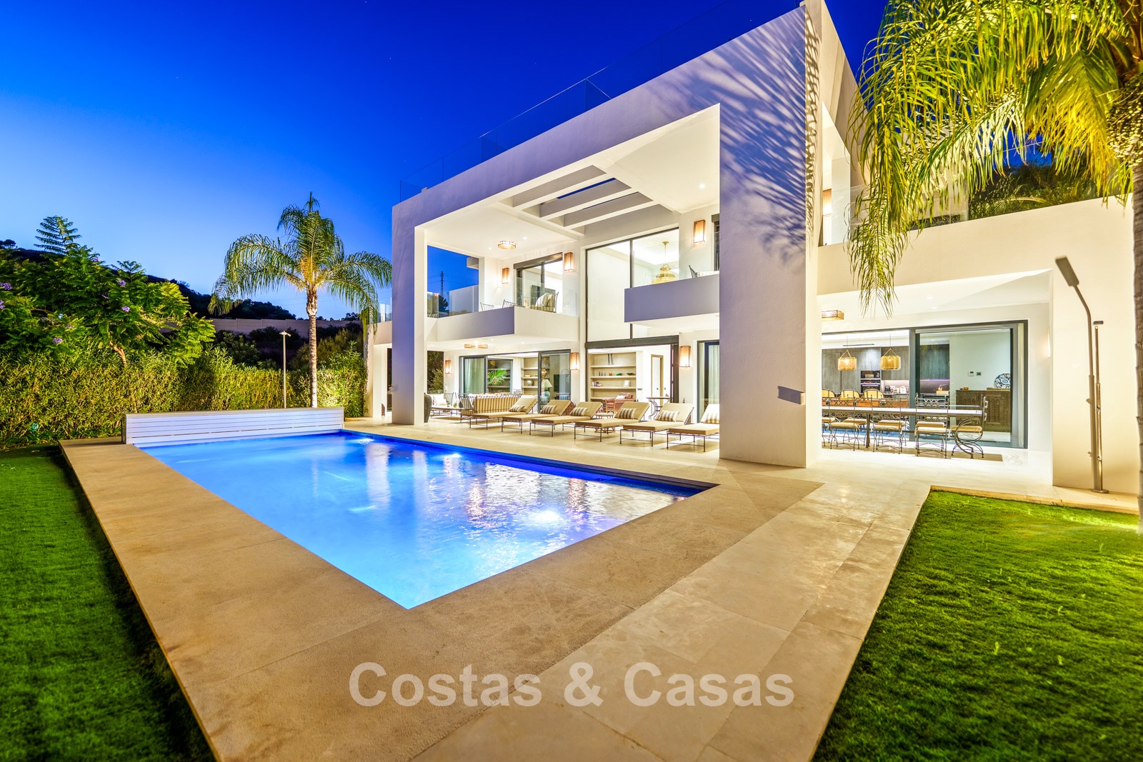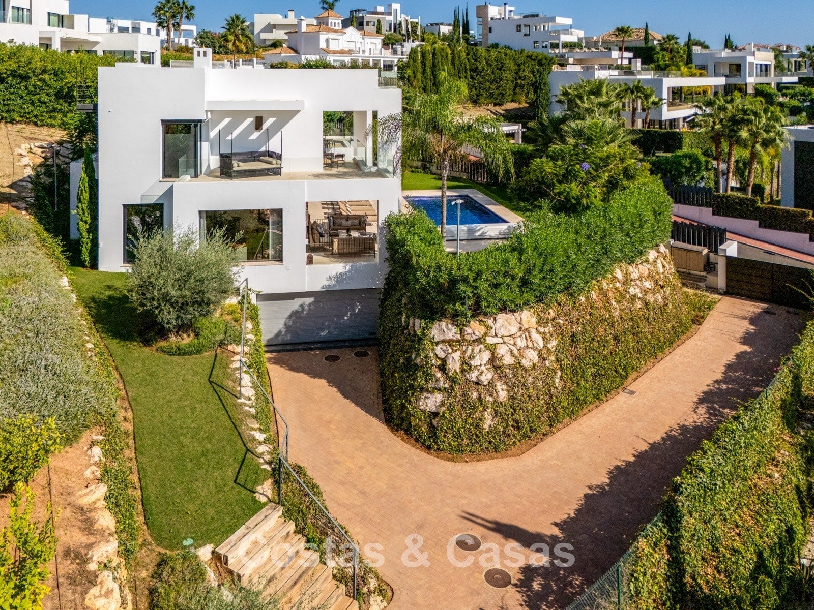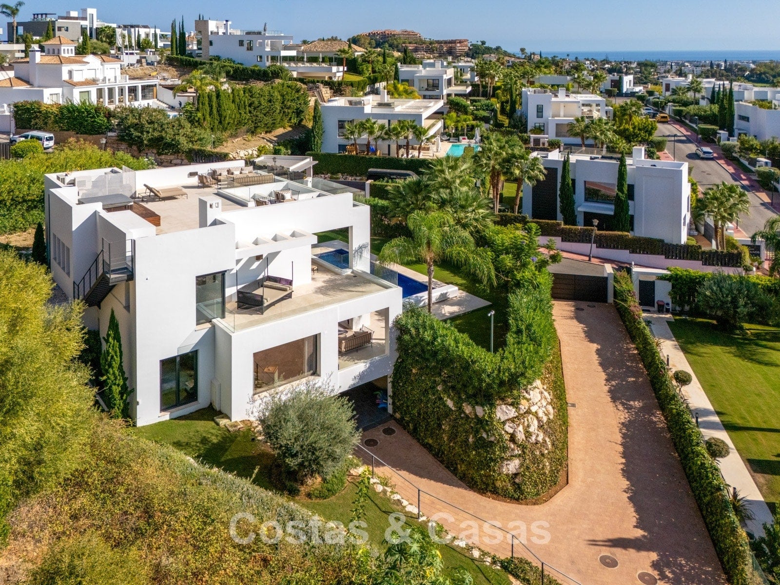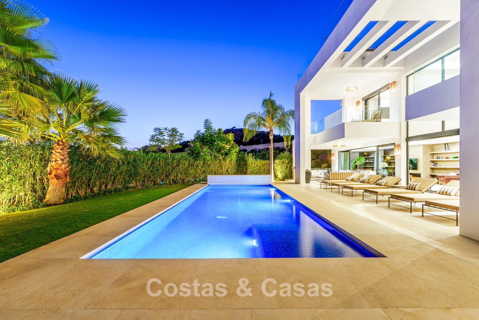Autres caractéristiques: Climatisation réversible Chauffage au sol dans les salles de bains Cheminée moderne Placards intégrés Double vitrage Sols en marbre Garde-corps en verre Système d’alarme avancé Éclairage LED intérieur et extérieur Douche extérieure