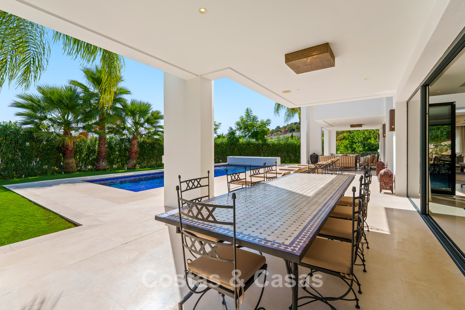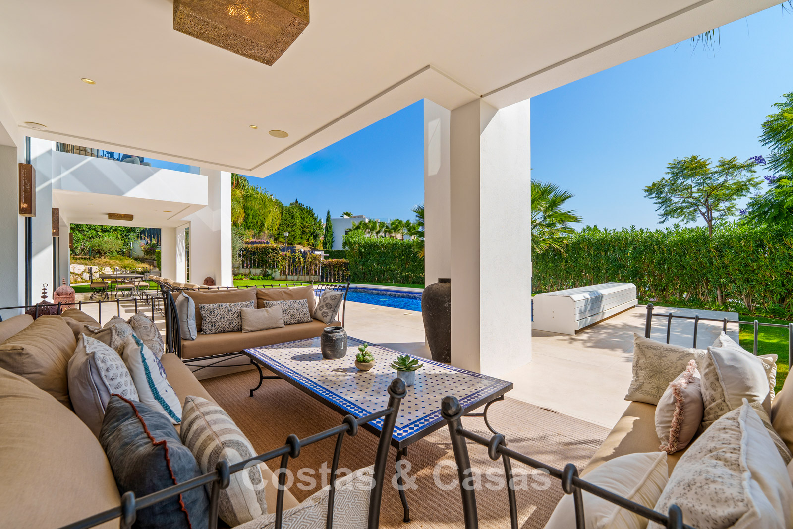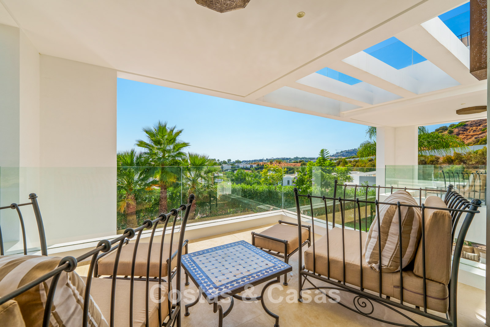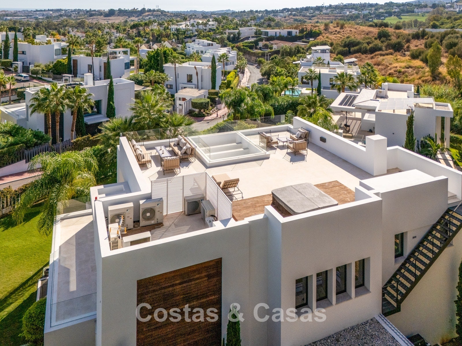 Spacieux terrain parfaitement entretenu offrant une intimité totale. Jardins paysagers avec espace barbecue et terrasses ombragées pour les repas en plein air. Grand toit-terrasse aménagé avec espace lounge et jacuzzi. Piscine privée entourée d’élégantes terrasses solarium. Orientation sud-ouest garantissant une luminosité optimale et de magnifiques couchers de soleil. Vues panoramiques sur la Vallée du Golf et la nature environnante depuis le toit-terrasse.