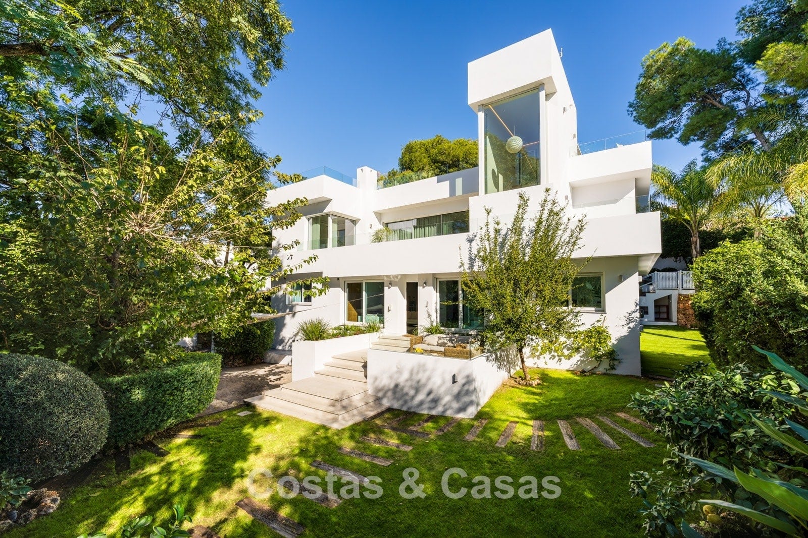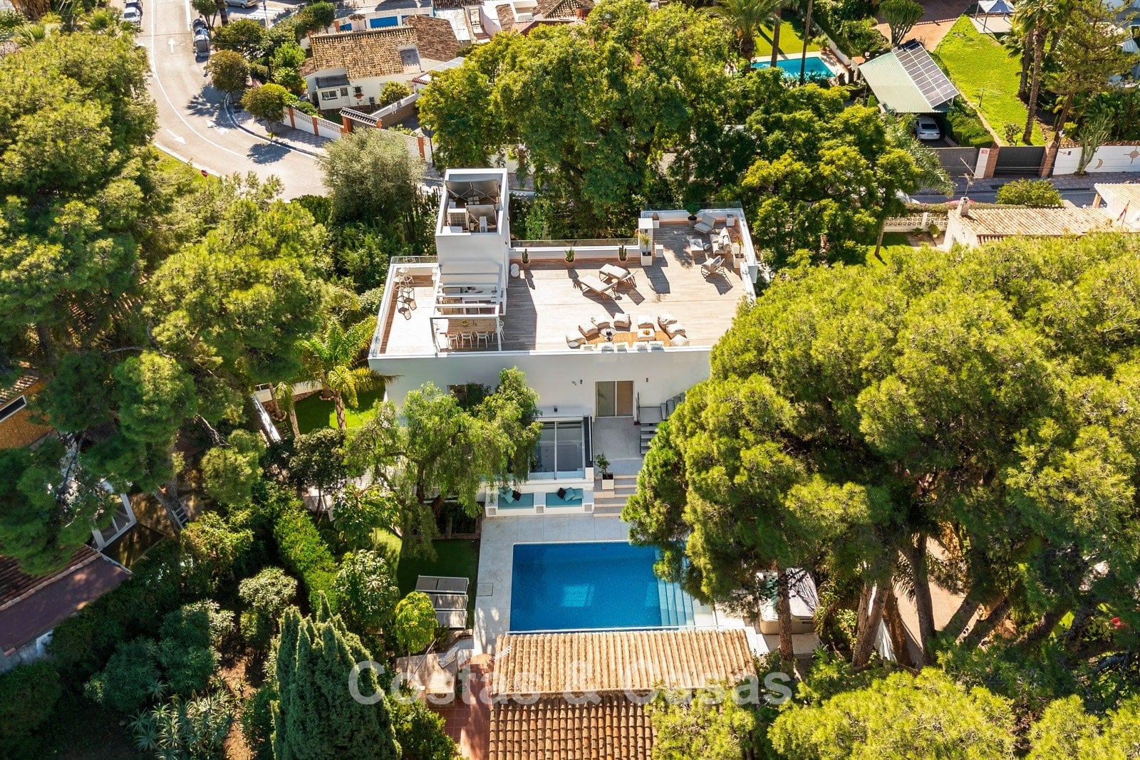 Terrain : 1 036 m² Superficie construite : 310m² Superficie des terrasses : 95m² Chambres : 6 Salles de bain : 6 2 étages + solarium