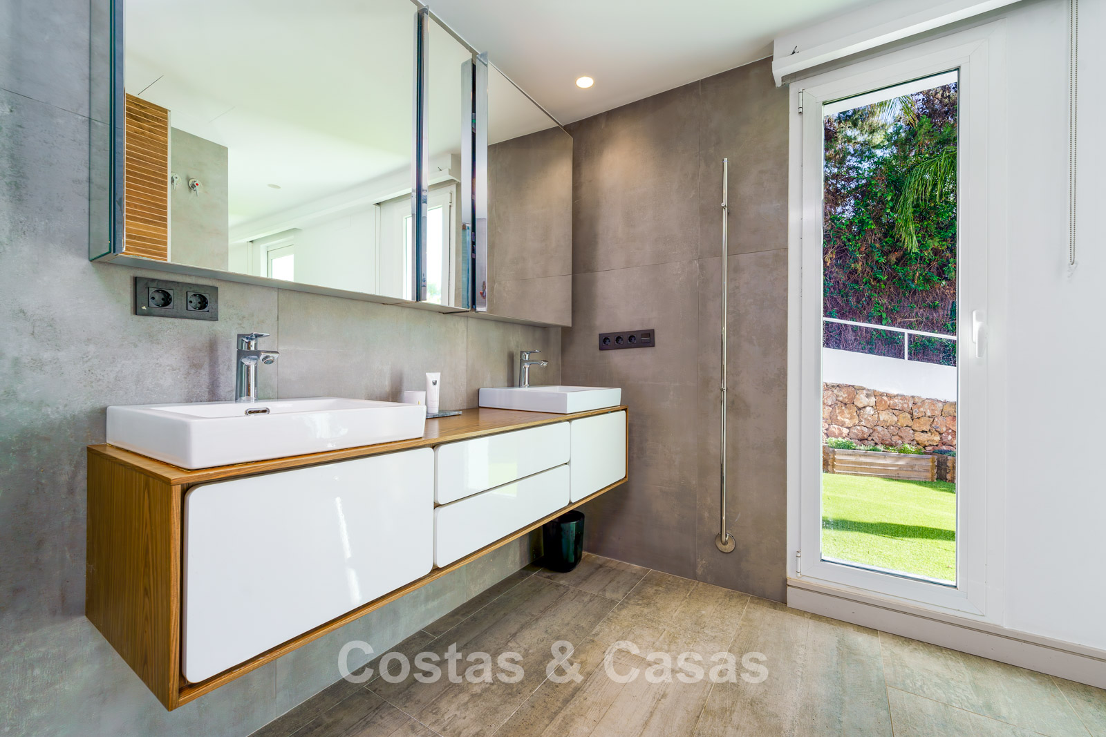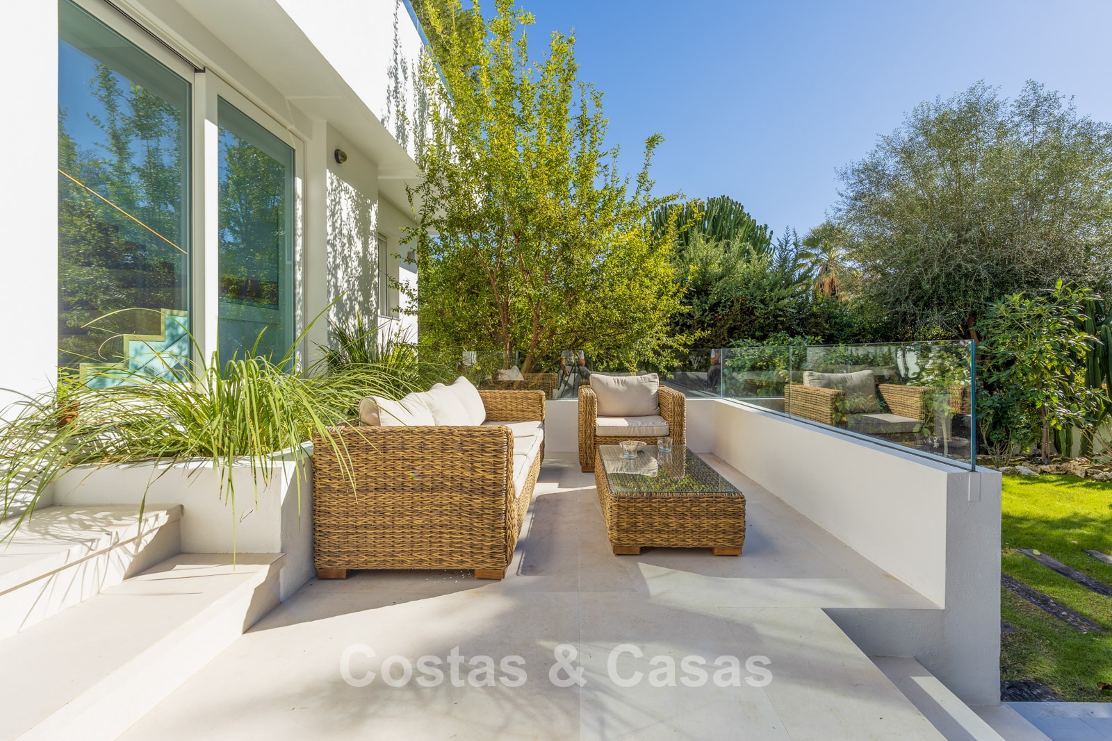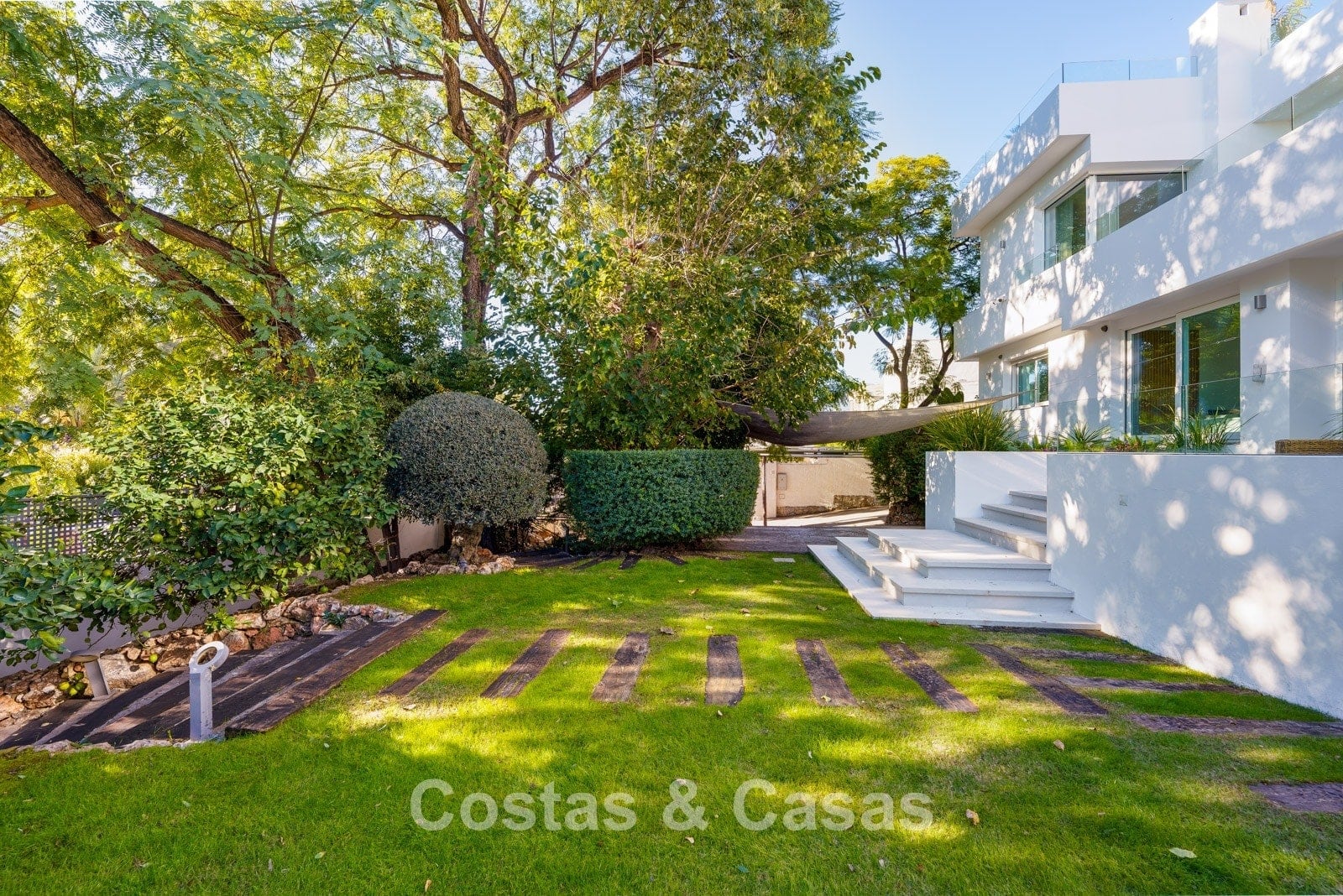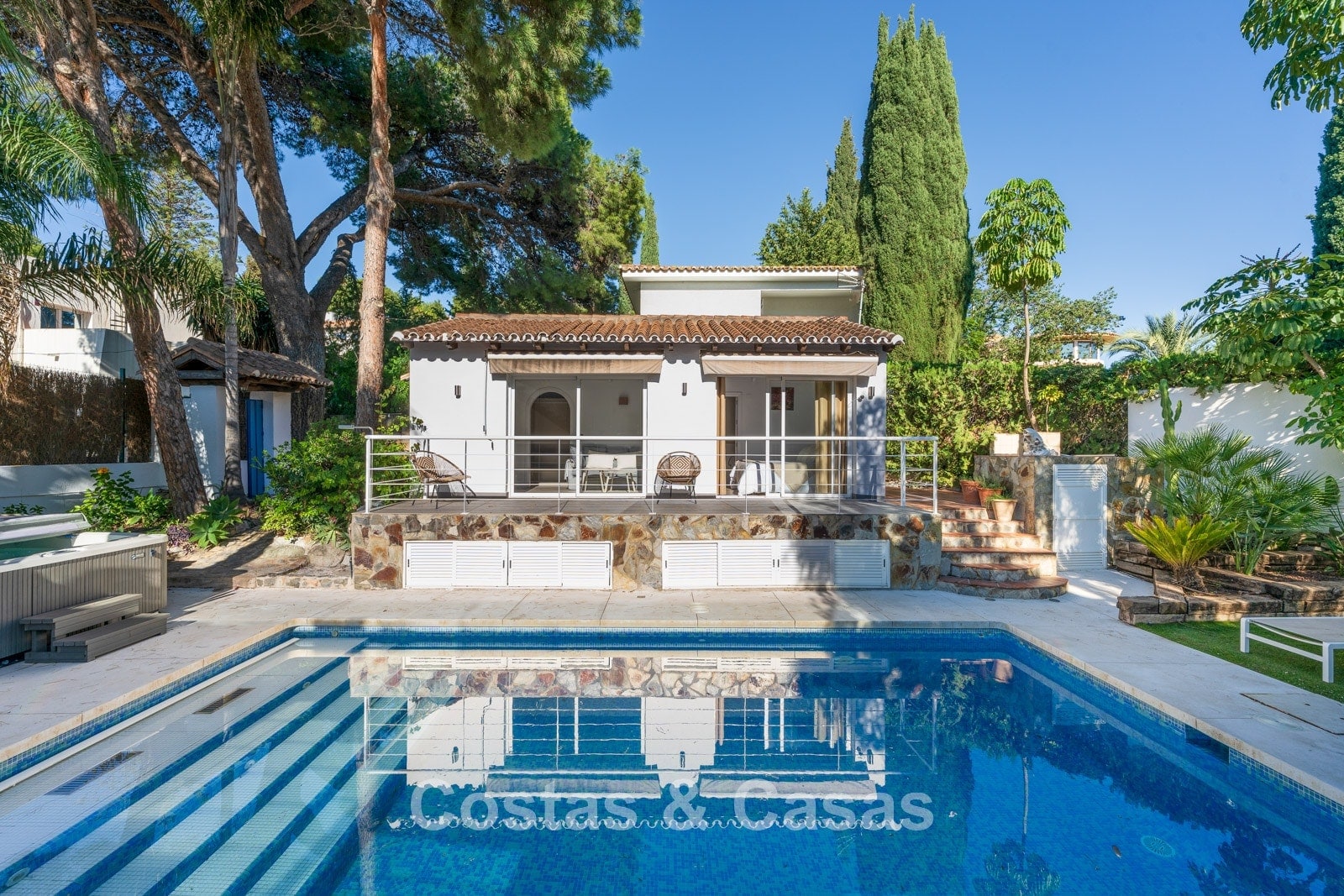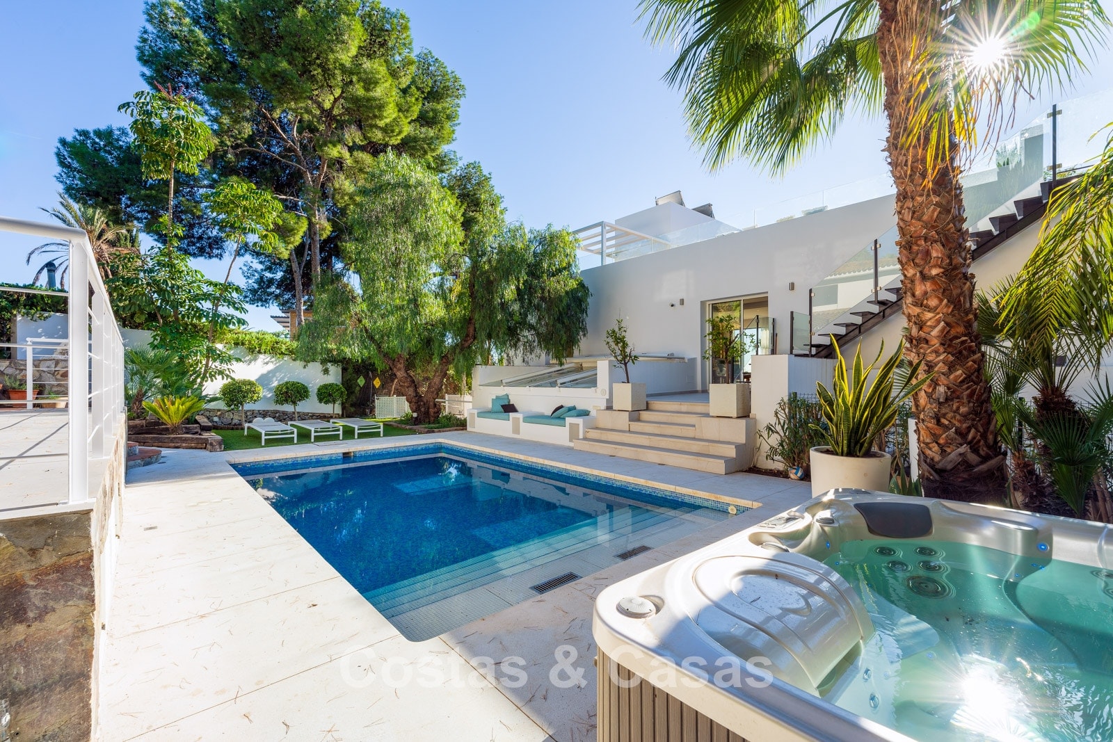 Terrain spacieux, entièrement entouré de hautes plantations, qui offre l'intimité nécessaire. Jardin paysagé bien entretenu avec arbres matures, plantes et pelouse. Piscine privée avec terrasse ensoleillée et jacuzzi adjacents. Vaste solarium avec lounge et cuisine extérieure avec coin barbecue. Plusieurs terrasses ensoleillées offrent un espace pour installer des équipements de salon. Exposition sud. Vue sur la mer Méditerranée depuis le solarium.