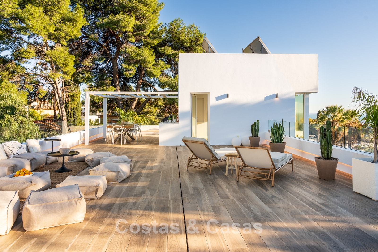 Solarium avec chillout et cuisine extérieure.