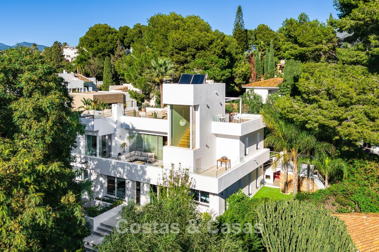 Autres fonctionnalités : Climatisation pour le refroidissement et le chauffage. Cheminée. Armoires intégrées. Balustrades en verre. Eclairage LED intérieur et extérieur. Panneaux solaires.
