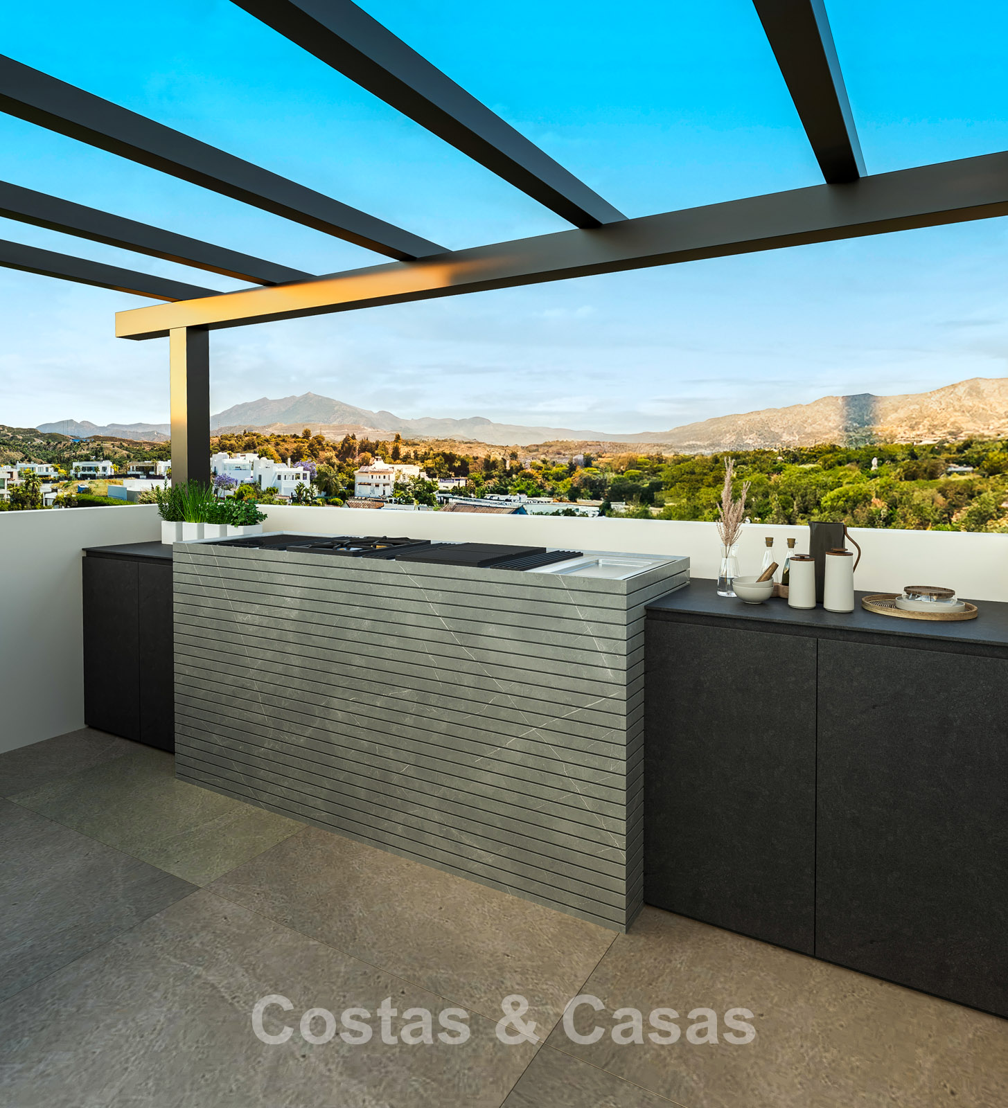 Vaste terrasse sur le toit avec cuisine extérieure.