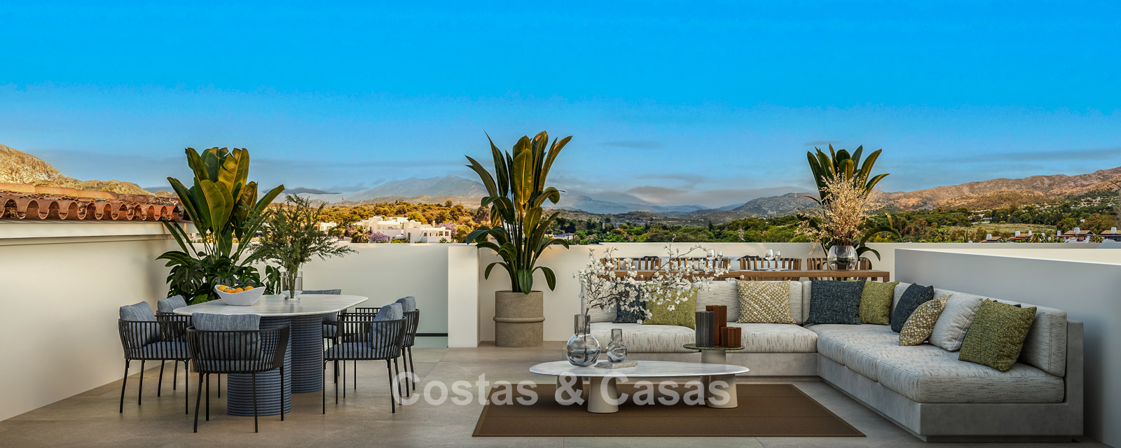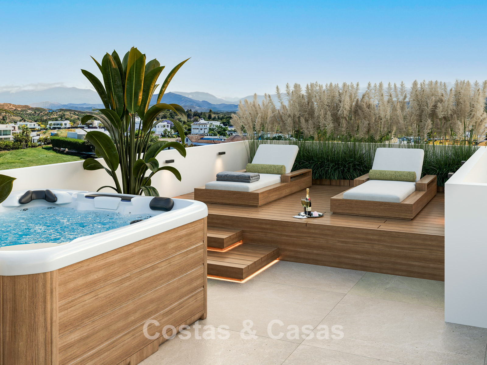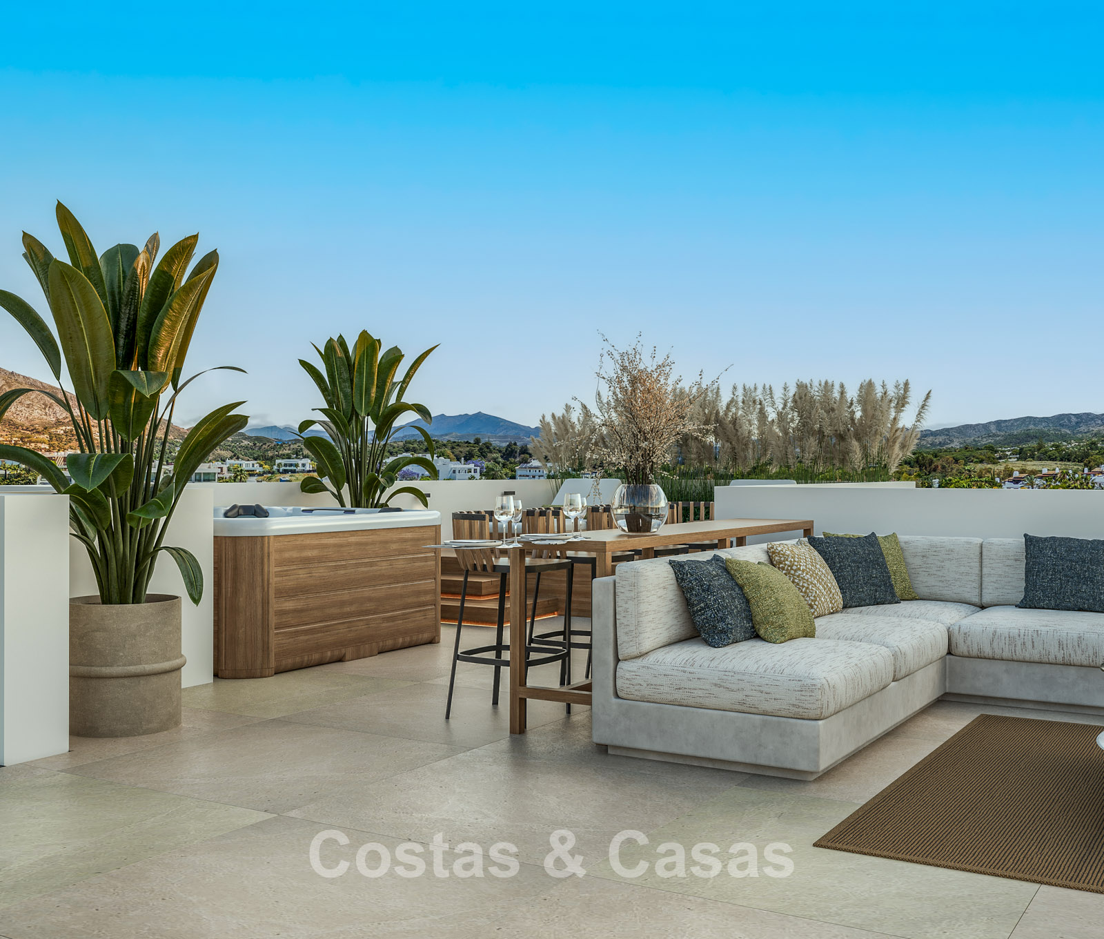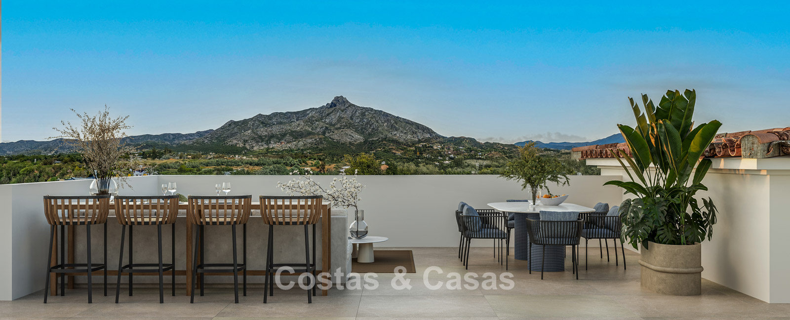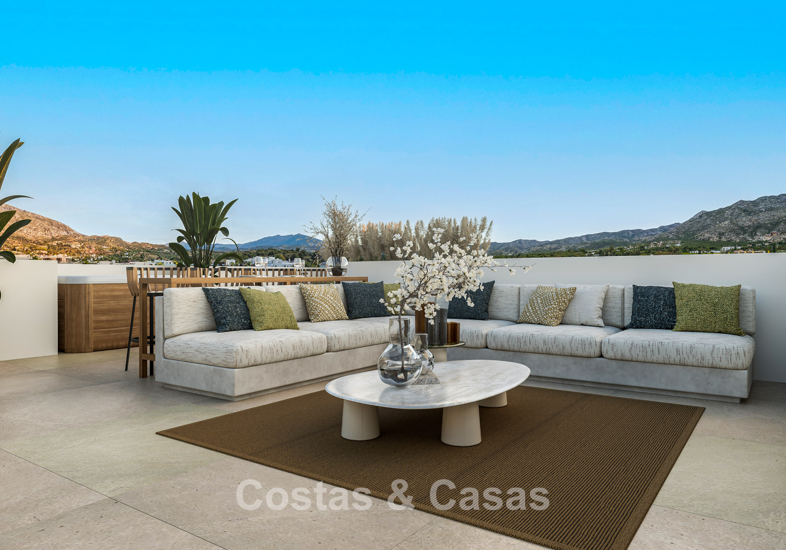 Vaste terrain de 1 000 m², entièrement entouré d'une végétation luxuriante. Aménagement paysager de grande qualité avec des conifères méditerranéens et une pelouse, en harmonie avec l'environnement. Piscine intégrée avec transats et pergola moderne. Les terrasses ensoleillées offrent un espace généreux pour se détendre confortablement. La terrasse sur le toit se transforme en un véritable havre de paix, avec jacuzzi, cuisine d'été haut de gamme et un vaste espace pour se détendre et savourer de délicieux dîners en plein air. Vue imprenable sur le mont La Concha et ses environs pittoresques.