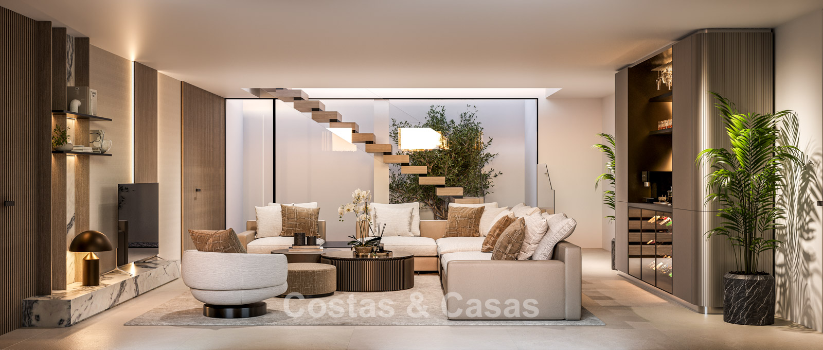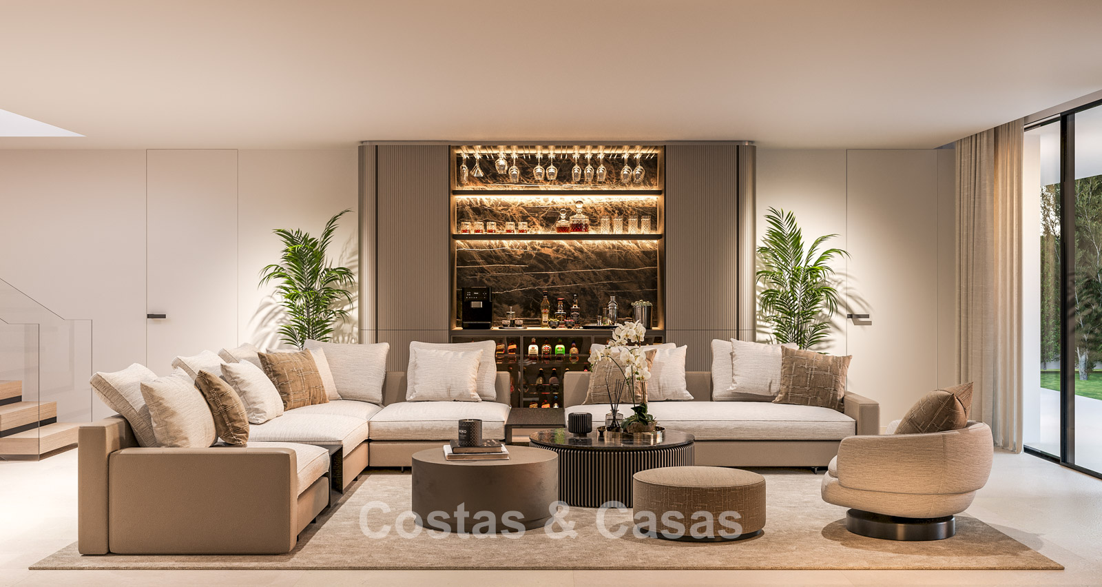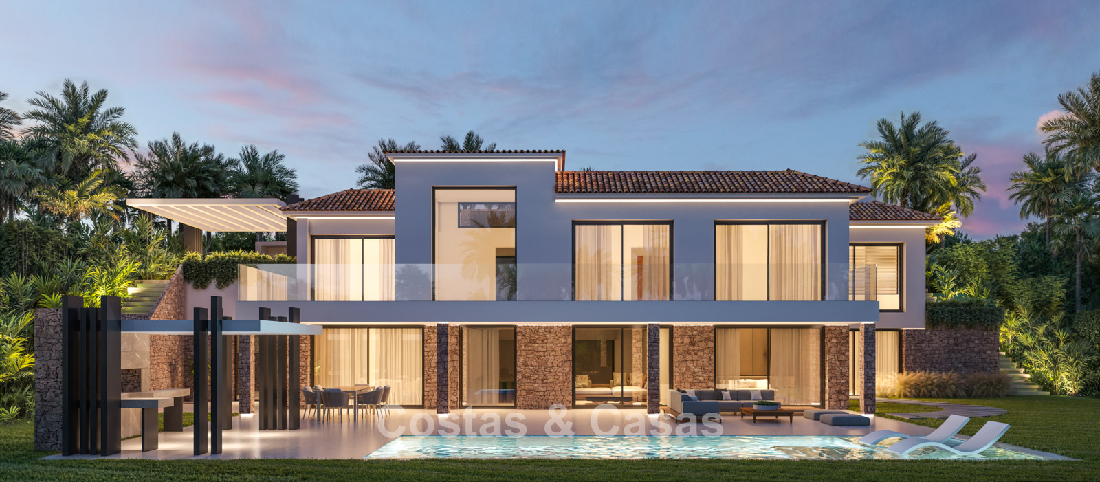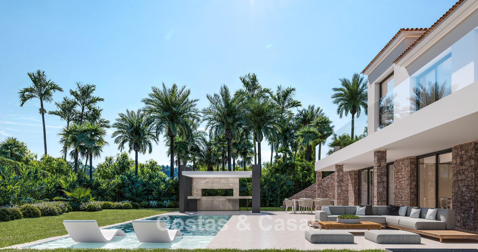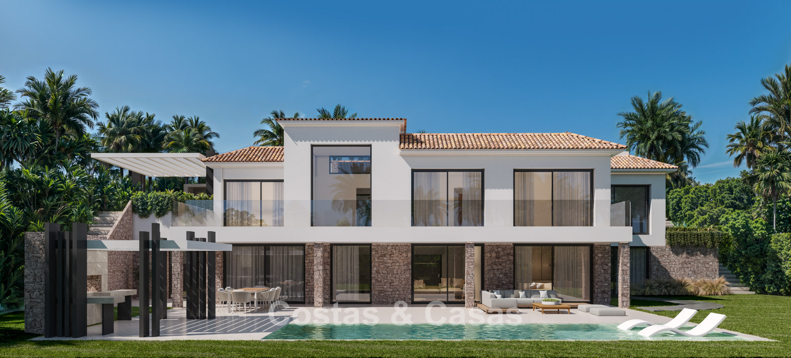Cette villa se distingue par son design contemporain, qui allie des lignes minimalistes au charme méditerranéen. Conçue avec un savoir-faire exceptionnel, des matériaux durables et un design sur mesure. L'intérieur élégant et moderne dégage une esthétique chic et luxueuse. Les pièces spacieuses sont baignées de lumière naturelle grâce à leurs baies vitrées, offrant de magnifiques vues sur les jardins luxuriants et la piscine. Salon et salle à manger ouverts. Le séjour bénéficie également d'une hauteur sous plafond exceptionnelle, assurant une ventilation optimale et une sensation d'espace incomparable, ce qui rend l'intérieur encore plus luxueux et impressionnant. La cuisine sur mesure est entièrement équipée d'appareils haut de gamme et dispose d'un îlot central idéal pour prendre le petit-déjeuner. 5 chambres, 5 salles de bains et 2 toilettes séparées offrent un confort optimal. Grands sols de qualité supérieure couleur crème. A l’étage inférieur, vous trouverez une pièce multifonctionnelle avec un salon TV et un bar intégré, ainsi qu'une salle de fitness relaxante. Buanderie/débarras. Abri voiture pour 2 véhicules.