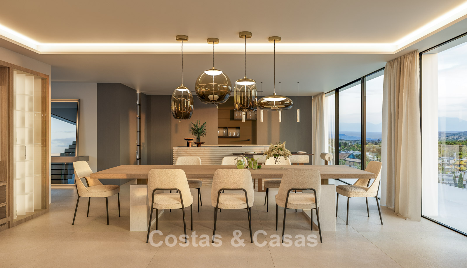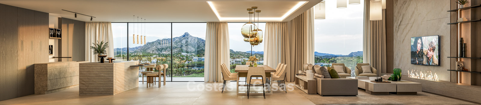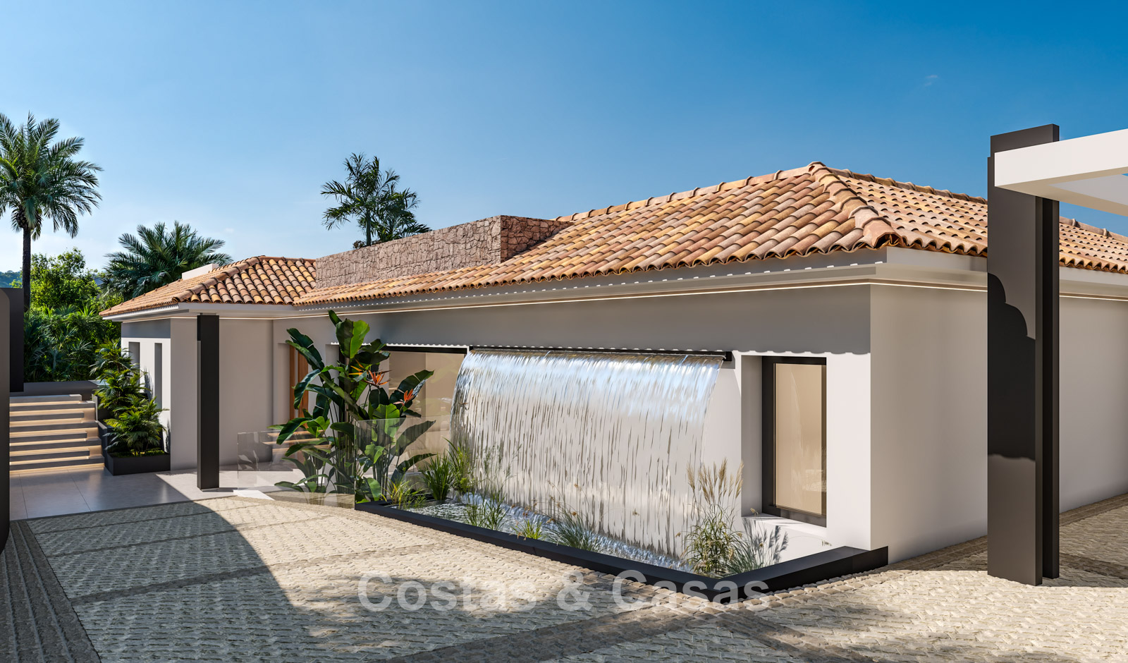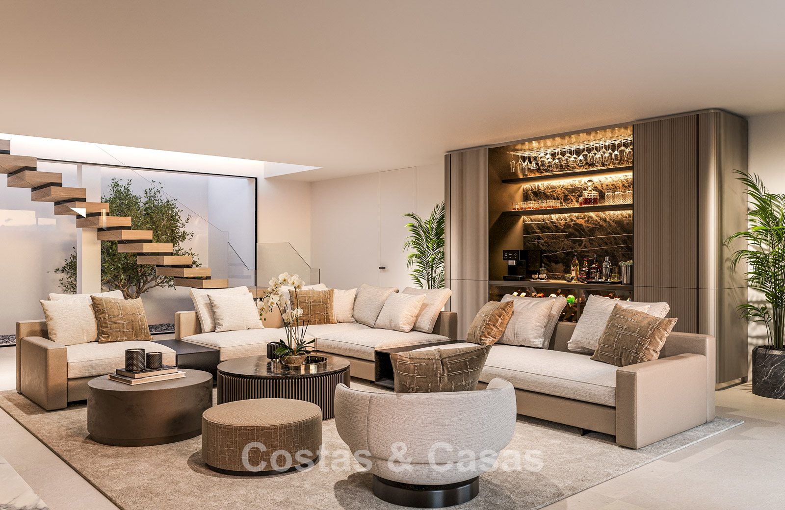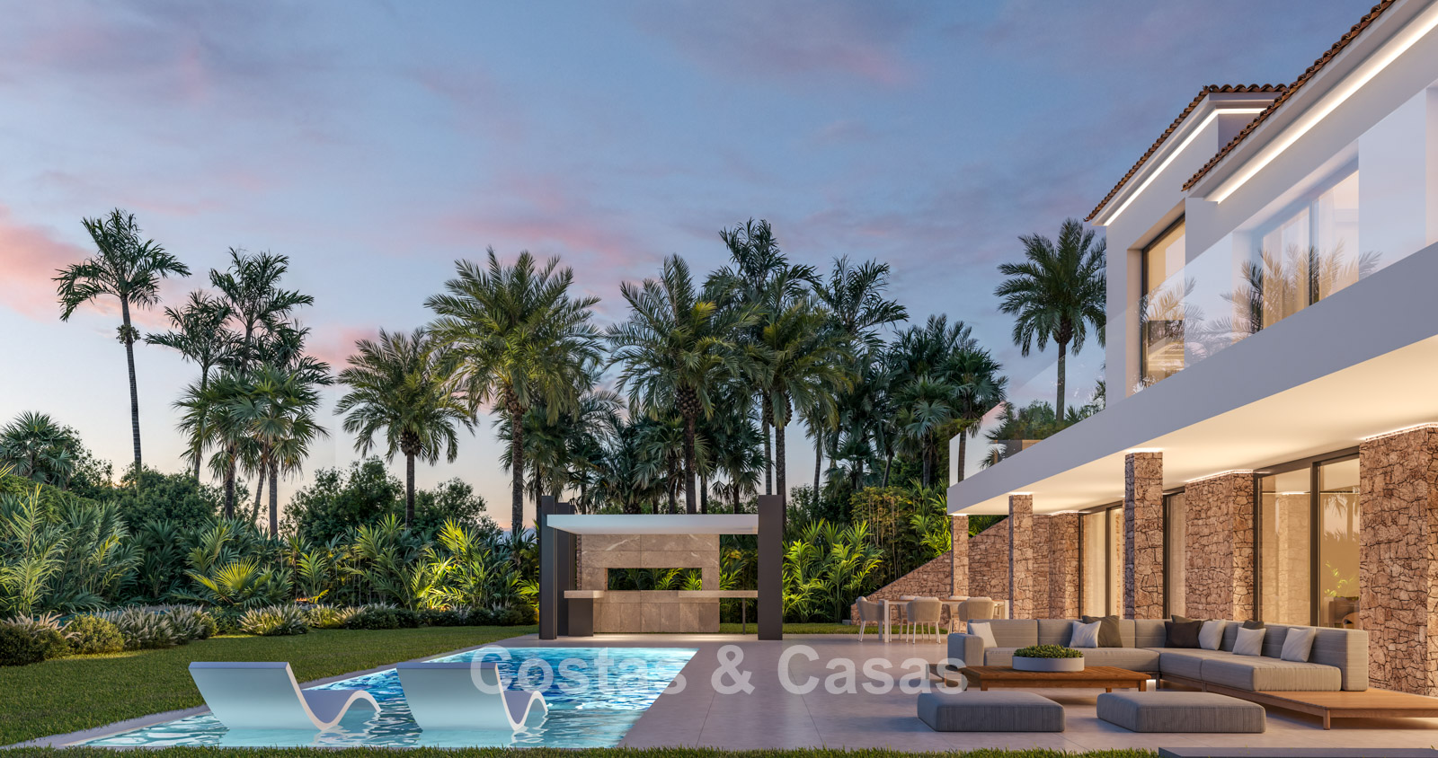 Cette villa se distingue par son design contemporain, qui allie des lignes minimalistes au charme méditerranéen. Conçue avec un savoir-faire exceptionnel, des matériaux durables et un design sur mesure. L'intérieur élégant et moderne dégage une esthétique chic et luxueuse. Les pièces spacieuses sont baignées de lumière naturelle grâce à leurs baies vitrées, offrant de magnifiques vues sur les jardins luxuriants et la piscine. Salon et salle à manger ouverts. Le séjour bénéficie également d'une hauteur sous plafond exceptionnelle, assurant une ventilation optimale et une sensation d'espace incomparable, ce qui rend l'intérieur encore plus luxueux et impressionnant. La cuisine sur mesure est entièrement équipée d'appareils haut de gamme et dispose d'un îlot central idéal pour prendre le petit-déjeuner. 5 chambres, 5 salles de bains et 2 toilettes séparées offrent un confort optimal. Grands sols de qualité supérieure couleur crème. A l’étage inférieur, vous trouverez une pièce multifonctionnelle avec un salon TV et un bar intégré, ainsi qu'une salle de fitness relaxante. Buanderie/débarras. Abri voiture pour 2 véhicules.