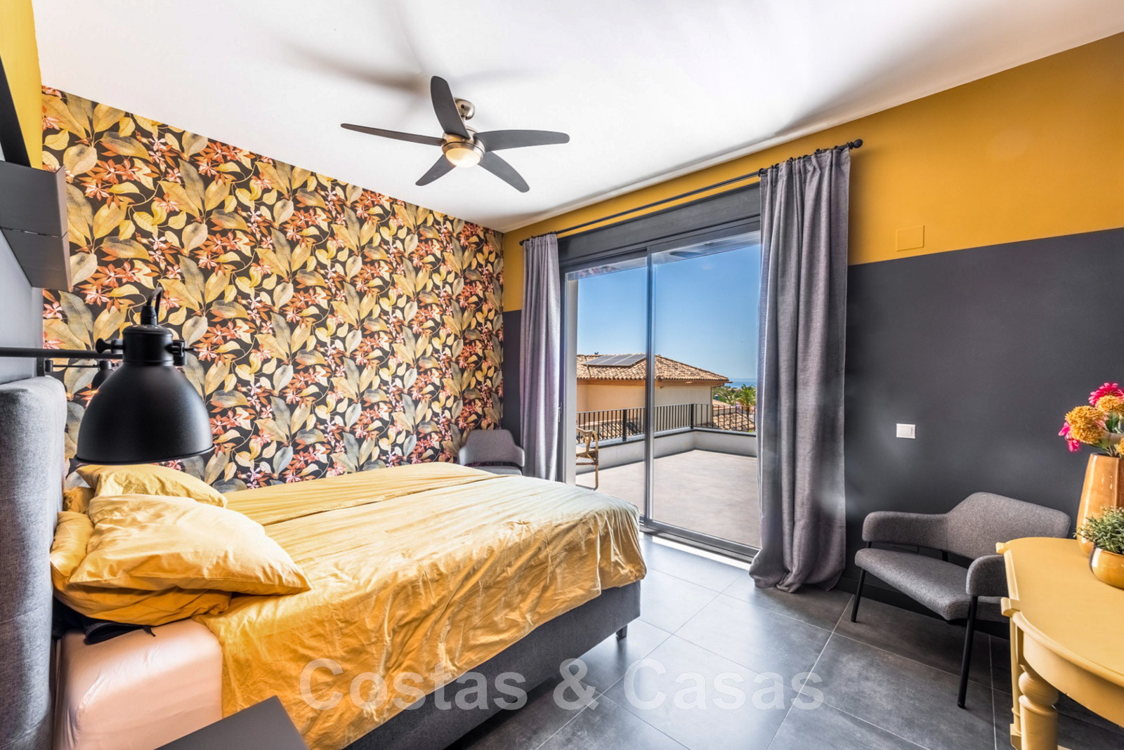 Chambre principale avec salle de bain, dressing et accès à une terrasse offrant des vues panoramiques sur la mer et la montagne La Concha.