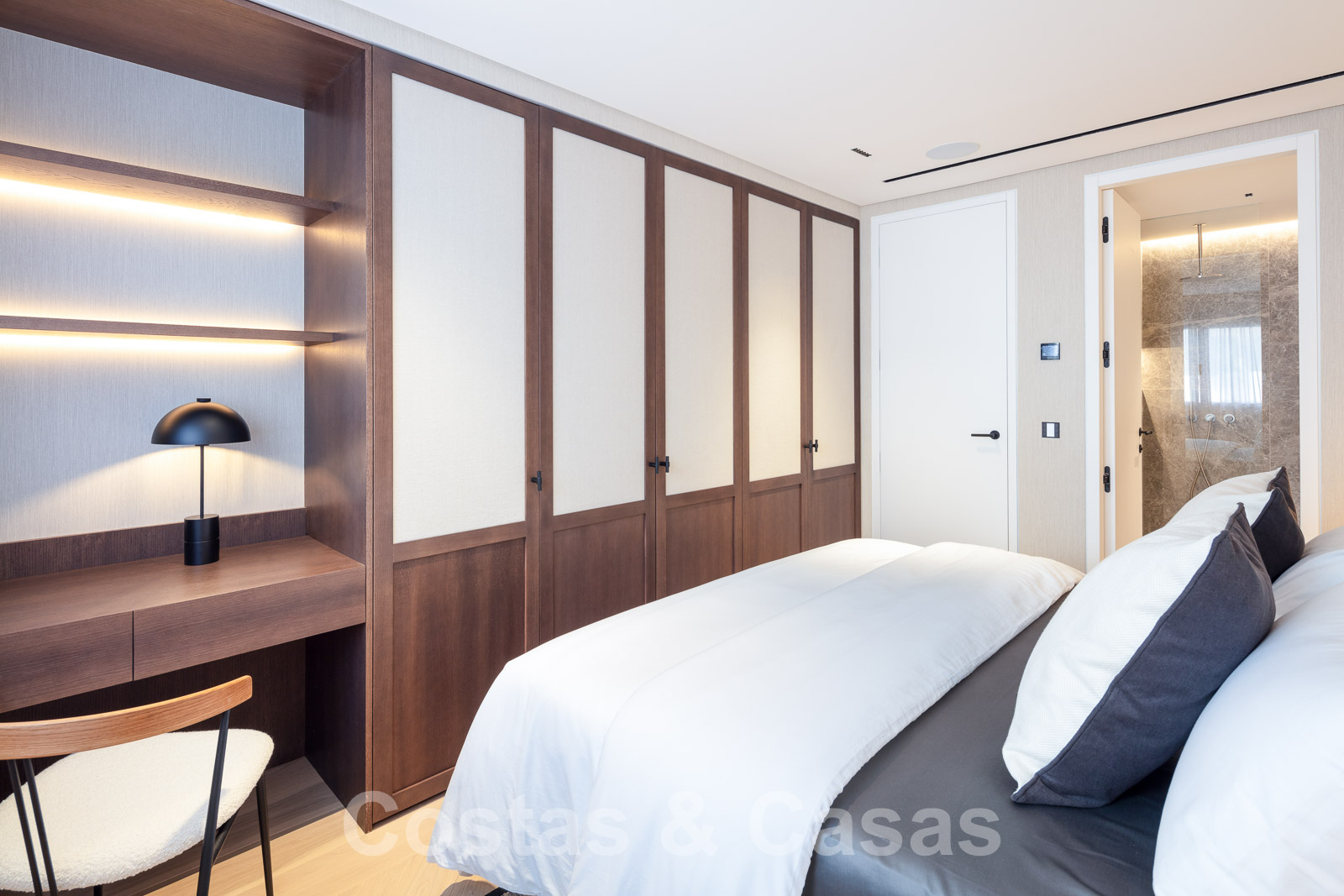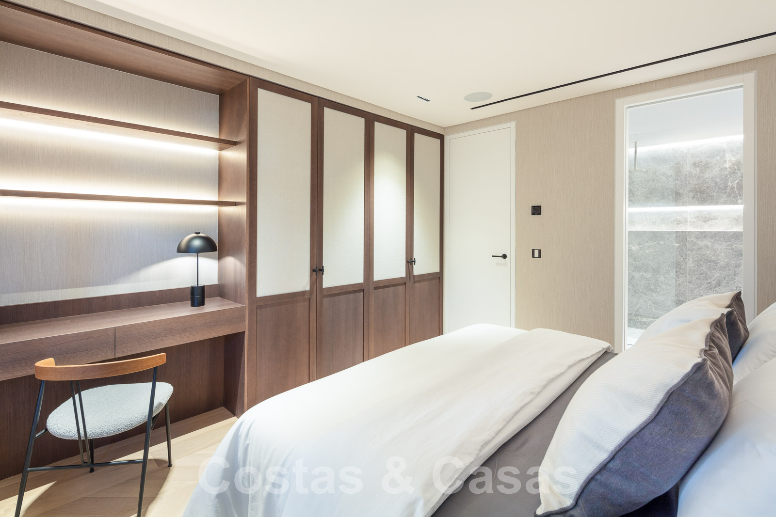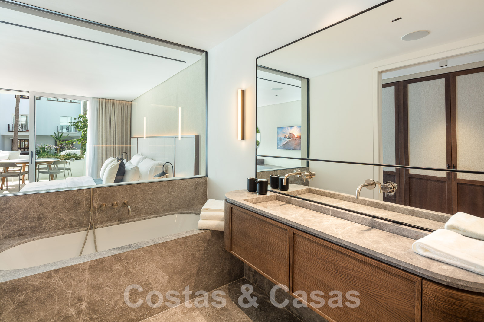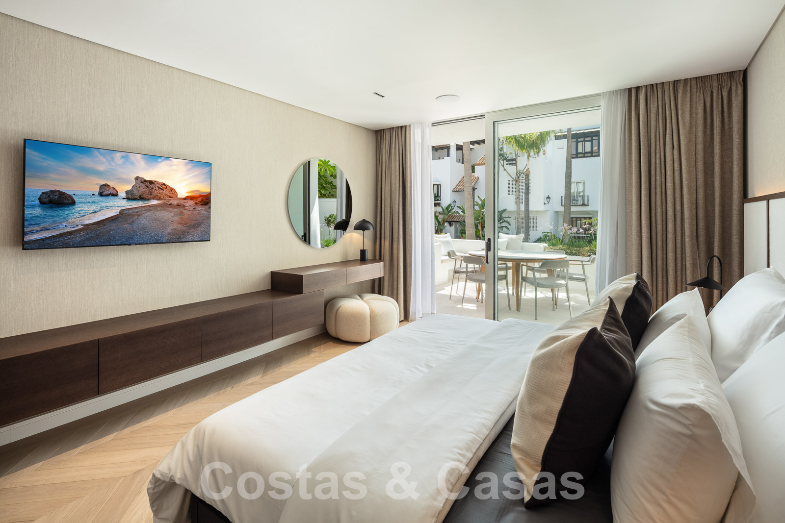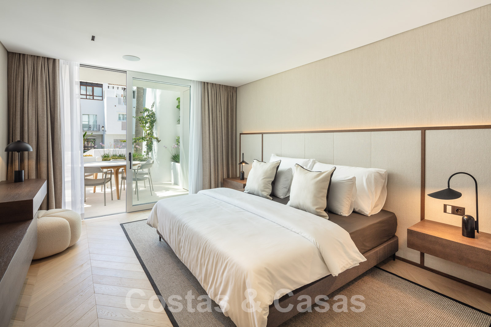 L'élégante chambre principale offre un accès à la terrasse.