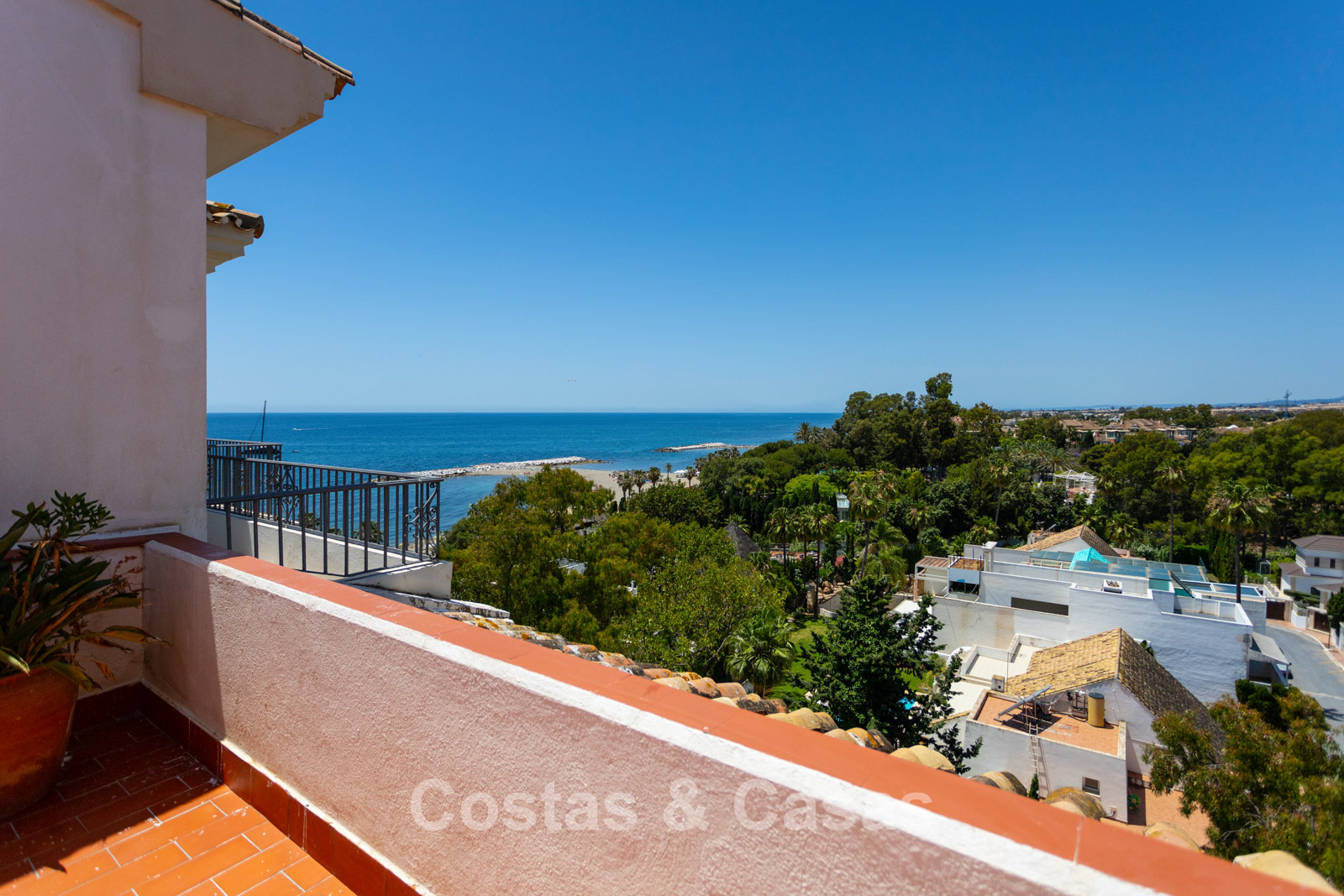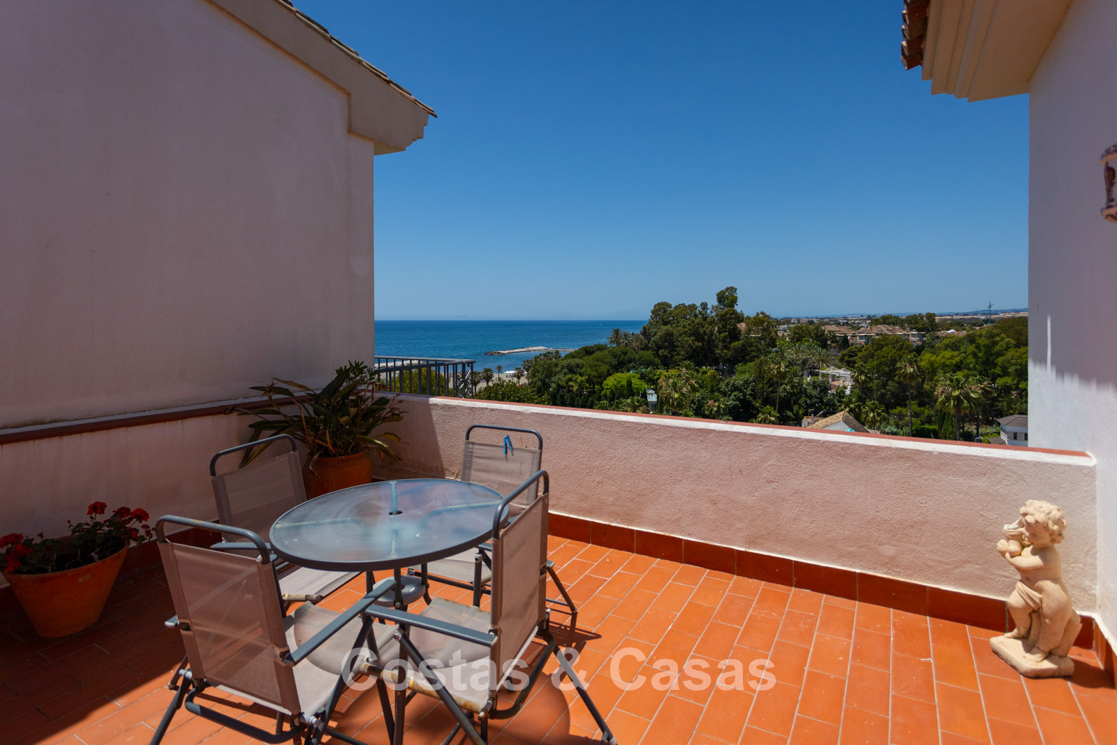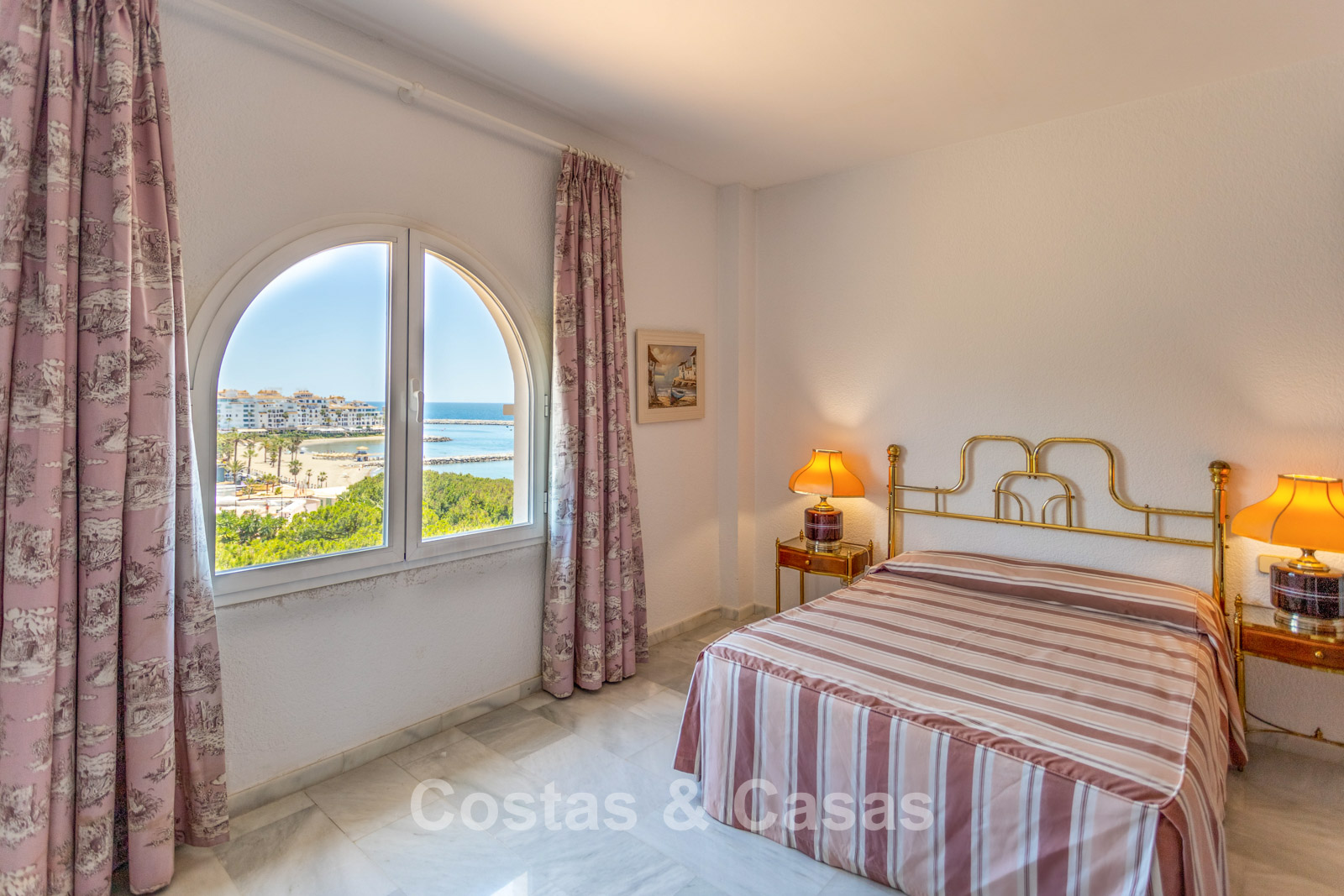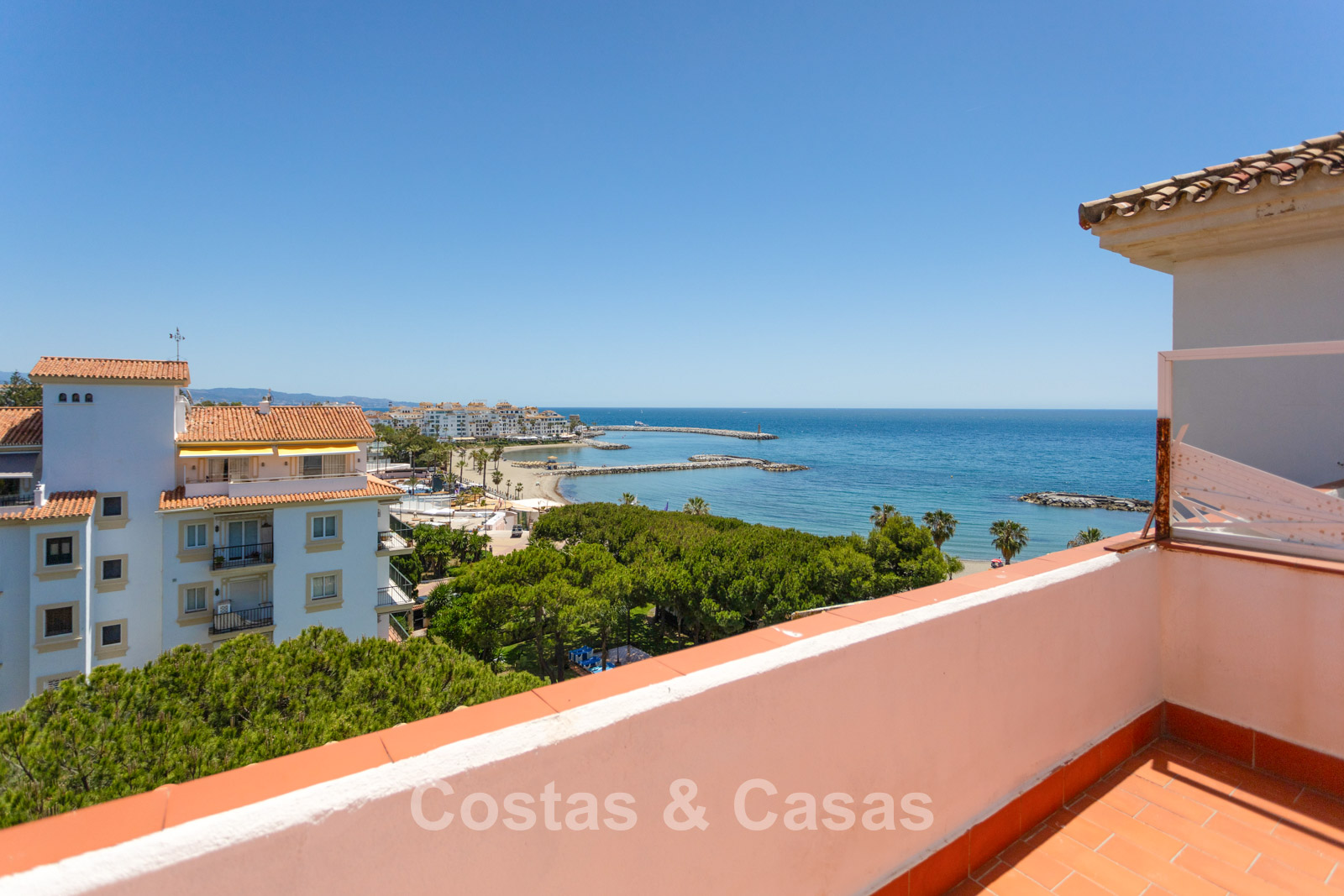 Penthouse en duplex au 5e étage. Le complexe est conçu selon une architecture andalouse typique. Orientation sud-ouest. Magnifique vue panoramique sur la plage, le port de plaisance et le littoral. Ce projet de rénovation est une opportunité idéale pour créer une maison contemporaine ou investir dans un bien locatif très prisé. Une terrasse côté ouest est idéale pour profiter du soleil de l'après-midi et admirer la mer. 3 chambres, 3 salles de bain, dont 2 attenantes. L'étage supérieur est entièrement dédié à la suite parentale, avec sa propre salle de bain, un dressing et une terrasse privée offrant une vue imprenable. Place de parking intérieure.