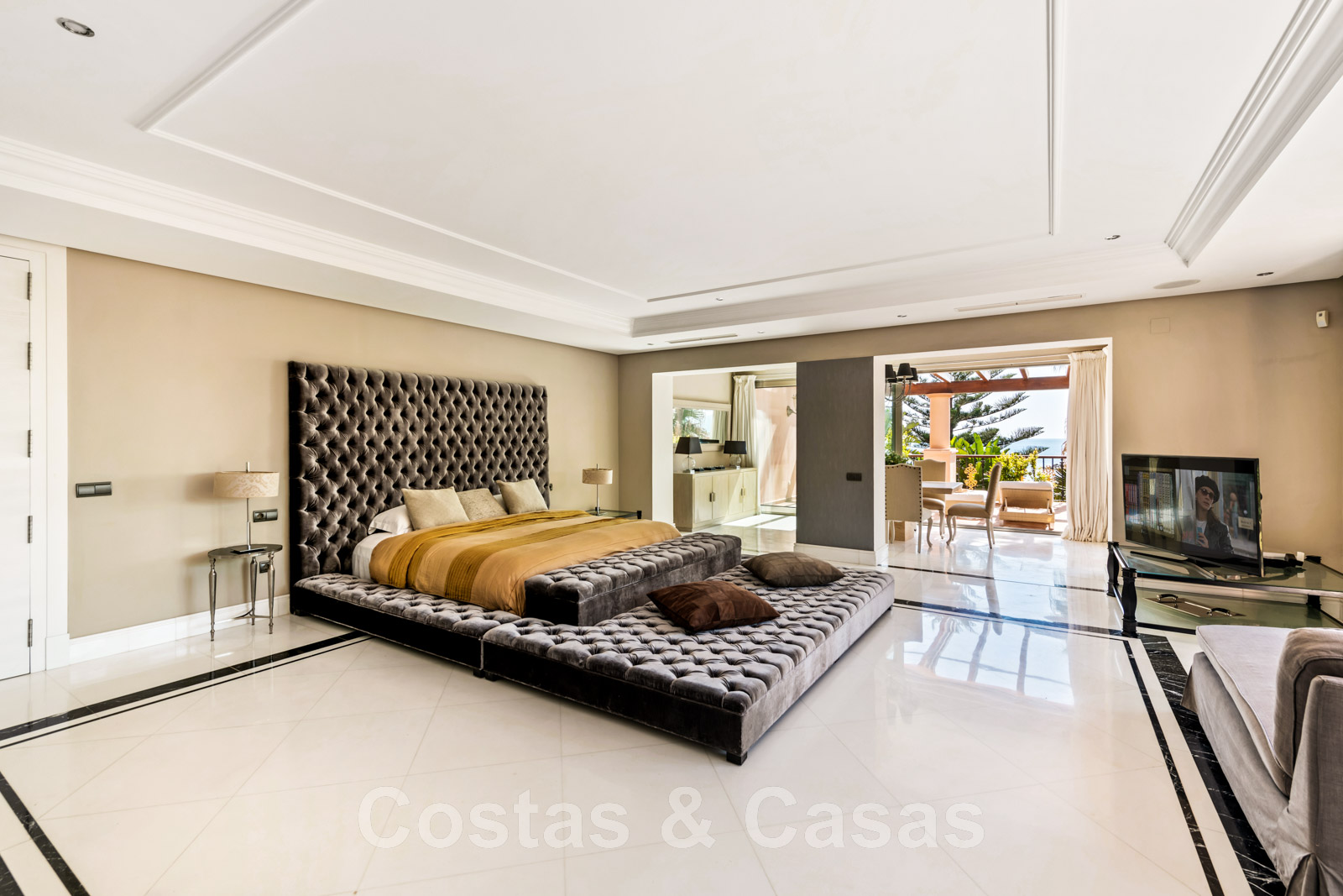 Chambre principale spacieuse avec coin salon et accès à la terrasse privée orientée au sud.