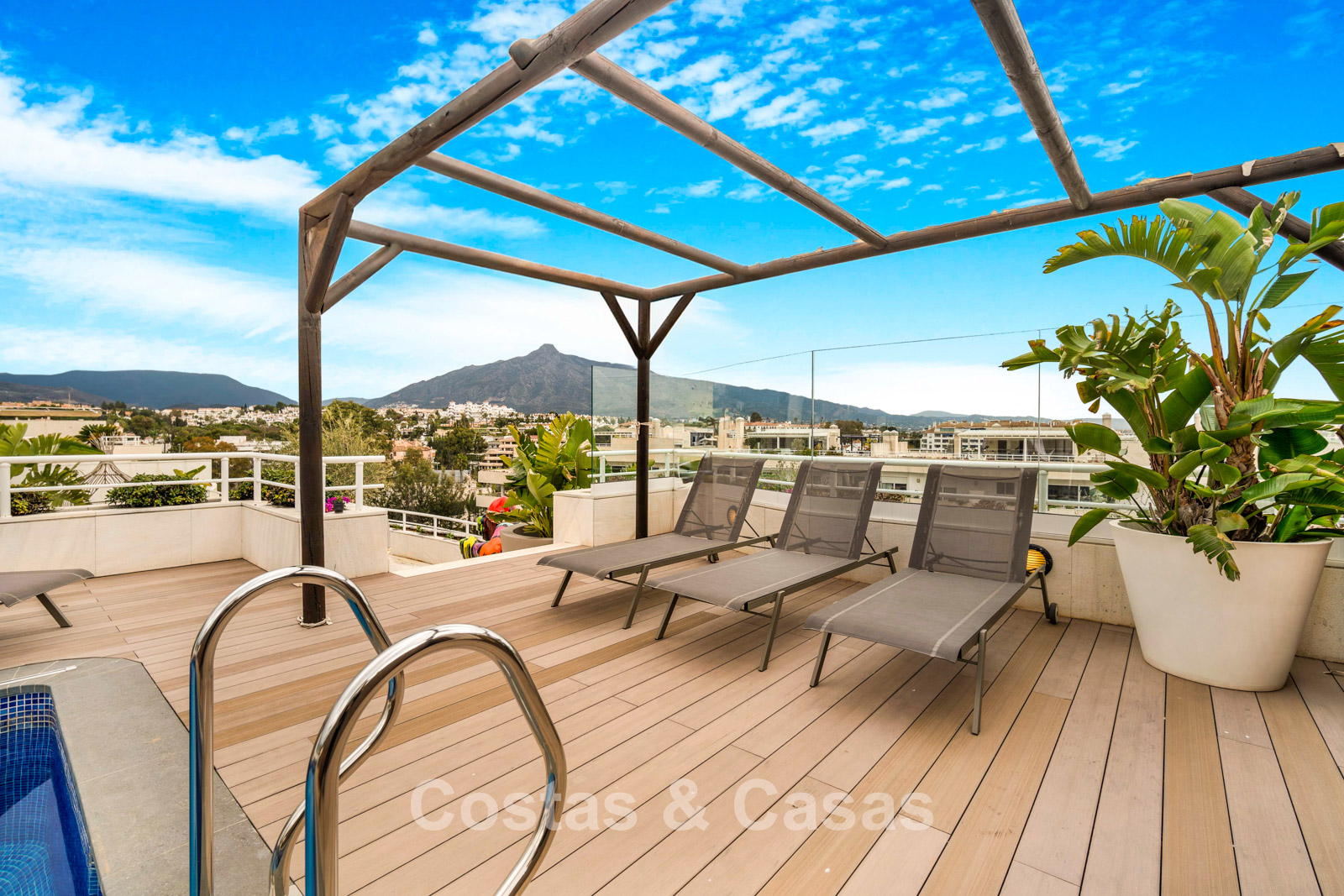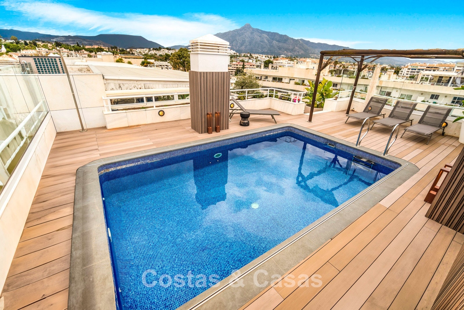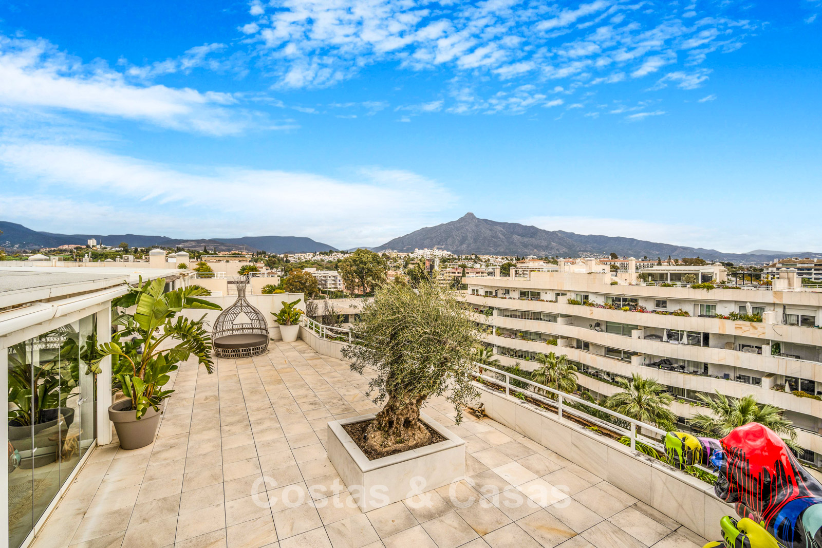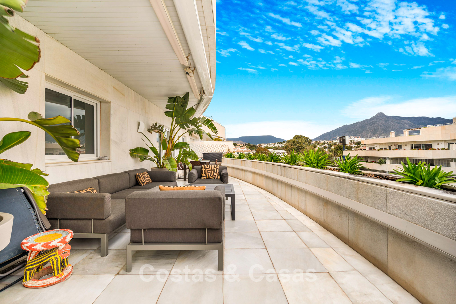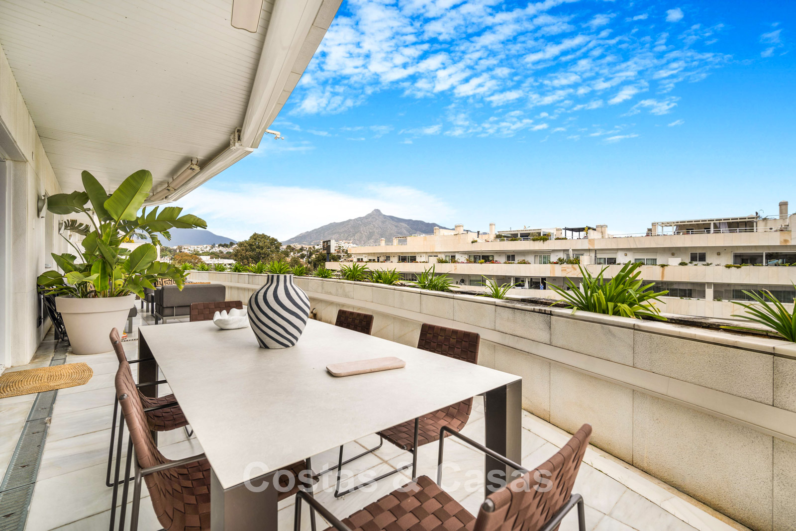 Penthouse en duplex. Entièrement rénové avec des matériaux de la meilleure qualité et des finitions luxueuses. Accessible par un ascenseur privé. Orientation sud-est. De vastes terrasses offrent beaucoup d'espace supplémentaire. Sur le solarium se trouvent une piscine chauffée et un coin lounge, avec vue panoramique sur les environs. Sur le solarium, il y a une partie qui peut être entièrement fermée par des rideaux de verre. Vous profiterez d'une vue panoramique sur les environs avec l'emblématique montagne La Concha et la mer Méditerranée en arrière-plan. L'intérieur respire une élégance intemporelle, avec des matériaux raffinés, des détails subtils et un équilibre harmonieux entre luxe et confort. De hautes fenêtres coulissantes se connectent parfaitement aux espaces extérieurs et permettent à la lumière naturelle de circuler en abondance. Espace de vie ouvert et confortable avec salon TV et cheminée. Cuisine entièrement équipée avec de nombreux rangements et un bar à petit-déjeuner. Espace repas intégré avec un mur à vin élégant. 4 chambres chacune avec sa salle de bain. Toutes les chambres s'ouvrent harmonieusement sur les vastes terrasses. La chambre principale bénéficie d'une salle de bain luxueuse avec douche à l'italienne. Sols carrelés grand format. Espace de rangement spacieux. Garage intérieur pour 2 voitures.