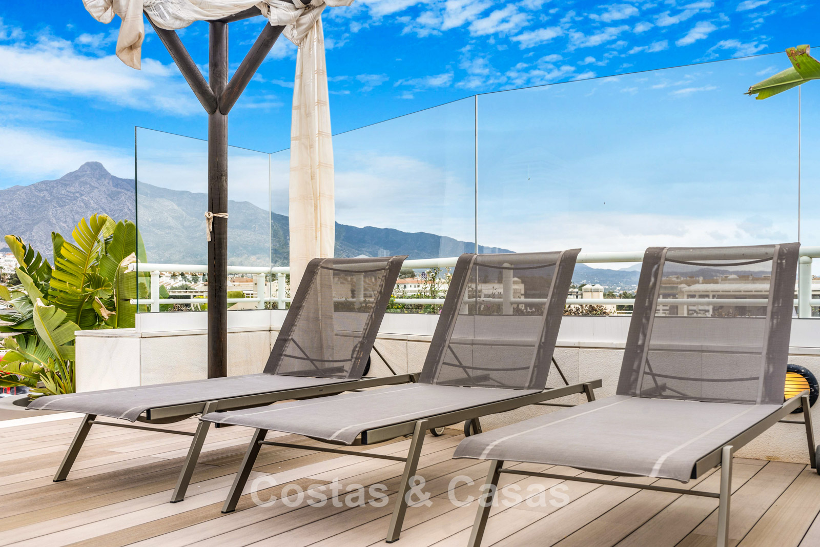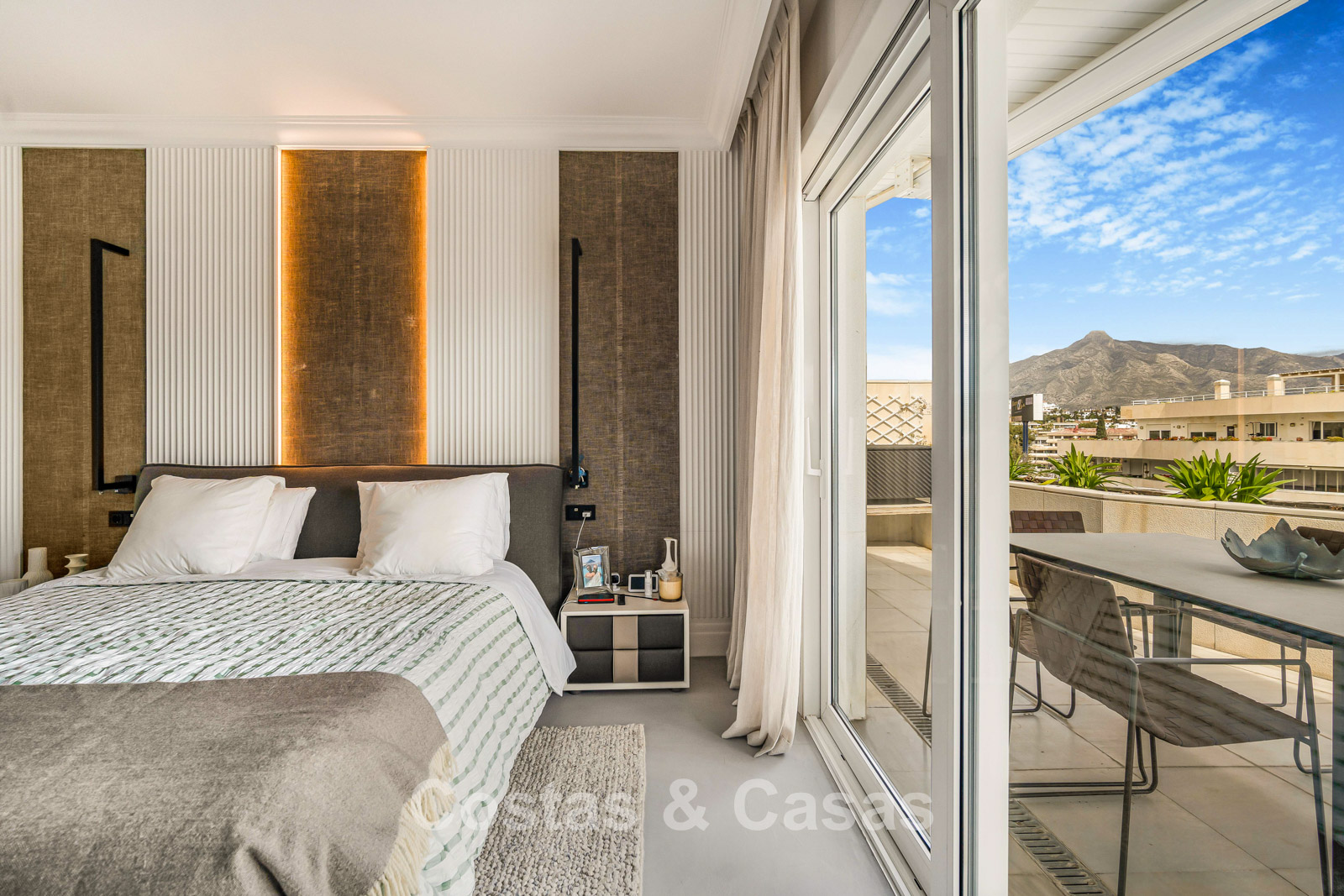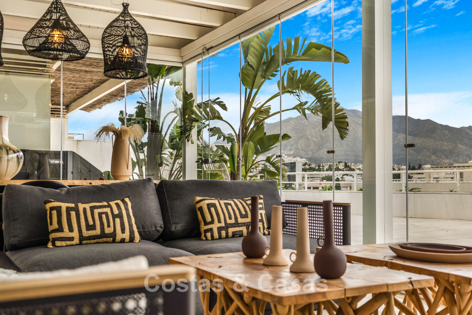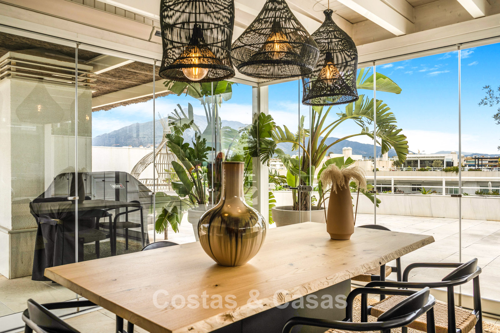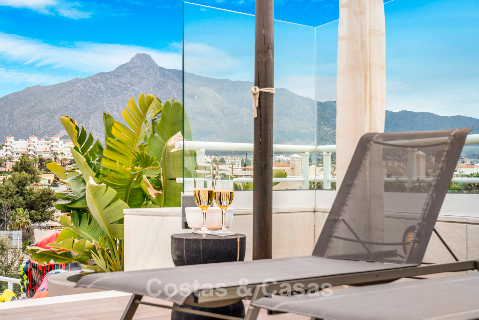 Penthouse en duplex. Entièrement rénové avec des matériaux de la meilleure qualité et des finitions luxueuses. Accessible par un ascenseur privé. Orientation sud-est. De vastes terrasses offrent beaucoup d'espace supplémentaire. Sur le solarium se trouvent une piscine chauffée et un coin lounge, avec vue panoramique sur les environs. Sur le solarium, il y a une partie qui peut être entièrement fermée par des rideaux de verre. Vous profiterez d'une vue panoramique sur les environs avec l'emblématique montagne La Concha et la mer Méditerranée en arrière-plan. L'intérieur respire une élégance intemporelle, avec des matériaux raffinés, des détails subtils et un équilibre harmonieux entre luxe et confort. De hautes fenêtres coulissantes se connectent parfaitement aux espaces extérieurs et permettent à la lumière naturelle de circuler en abondance. Espace de vie ouvert et confortable avec salon TV et cheminée. Cuisine entièrement équipée avec de nombreux rangements et un bar à petit-déjeuner. Espace repas intégré avec un mur à vin élégant. 4 chambres chacune avec sa salle de bain. Toutes les chambres s'ouvrent harmonieusement sur les vastes terrasses. La chambre principale bénéficie d'une salle de bain luxueuse avec douche à l'italienne. Sols carrelés grand format. Espace de rangement spacieux. Garage intérieur pour 2 voitures.
