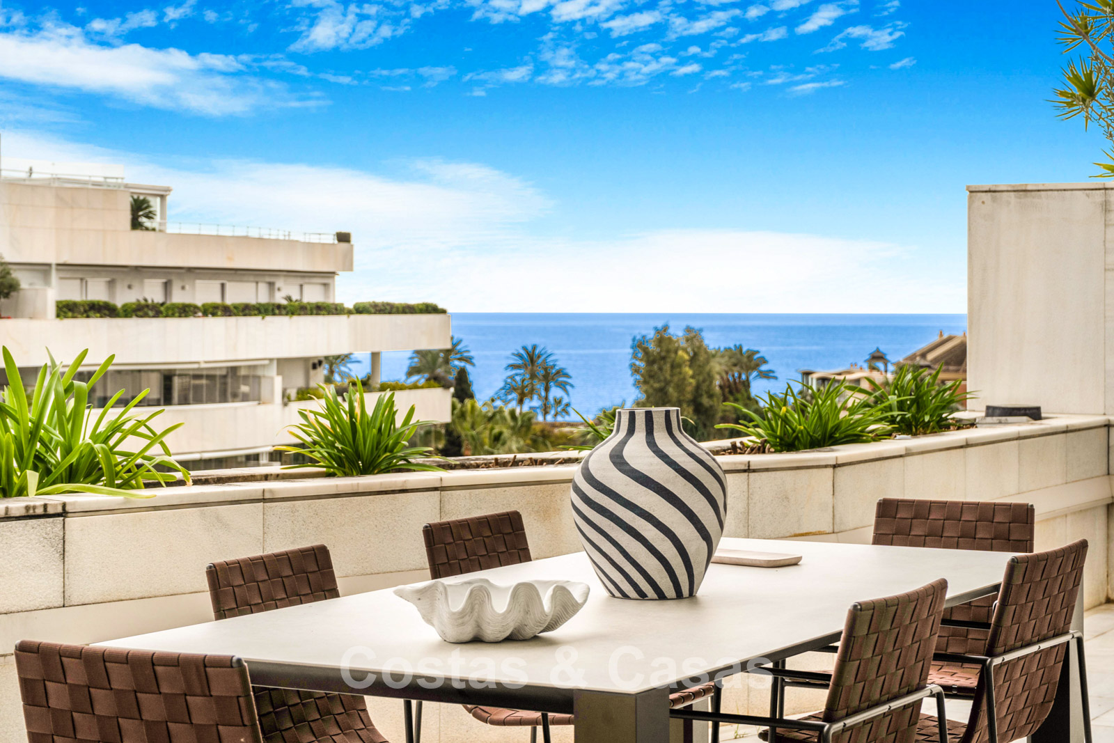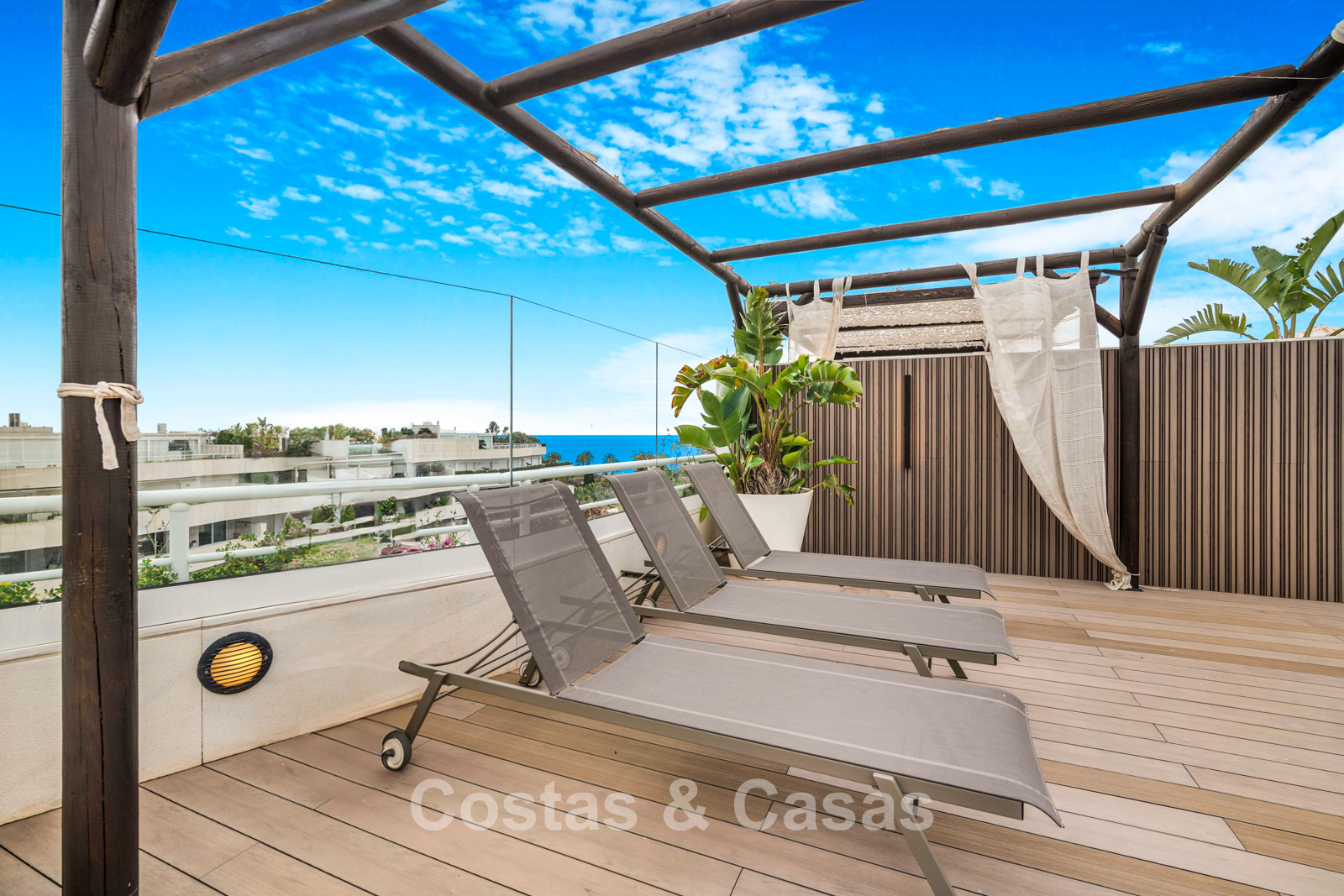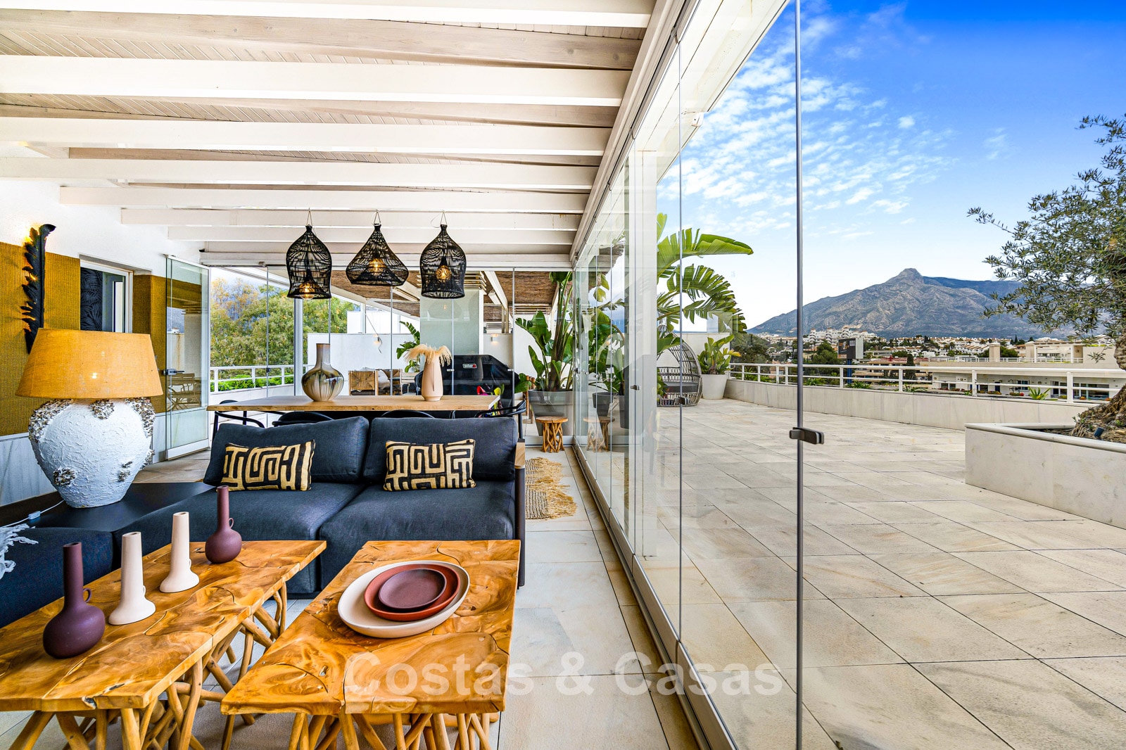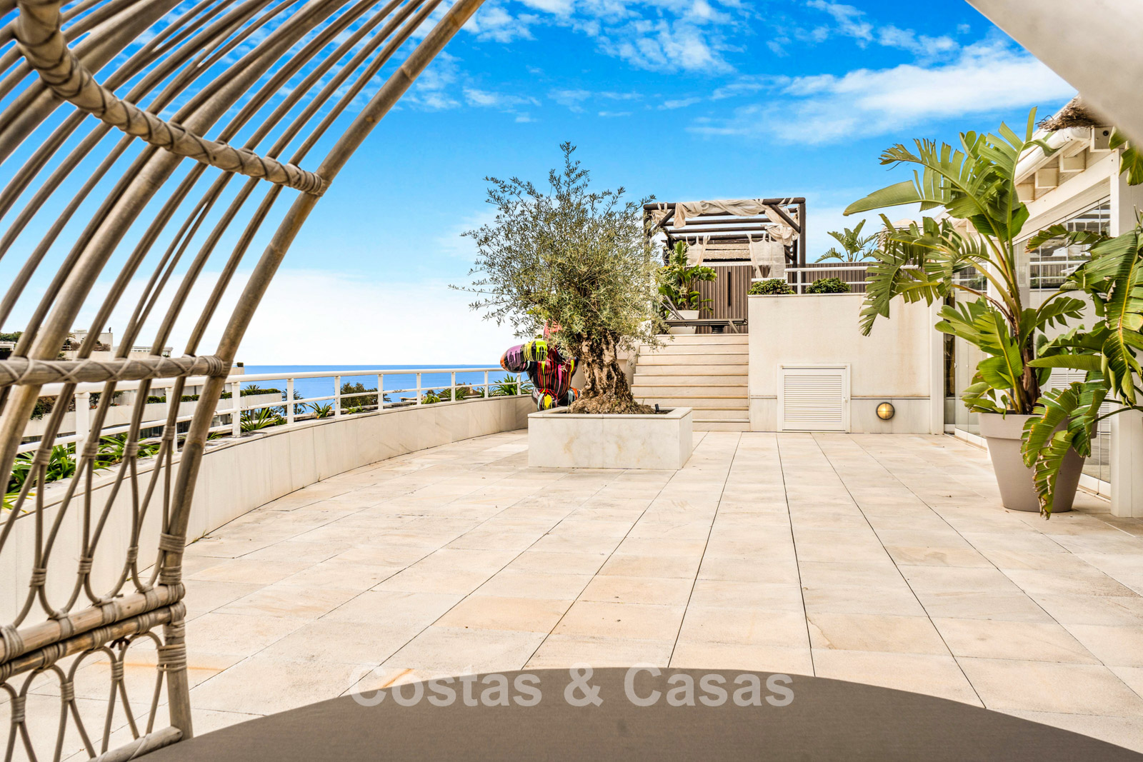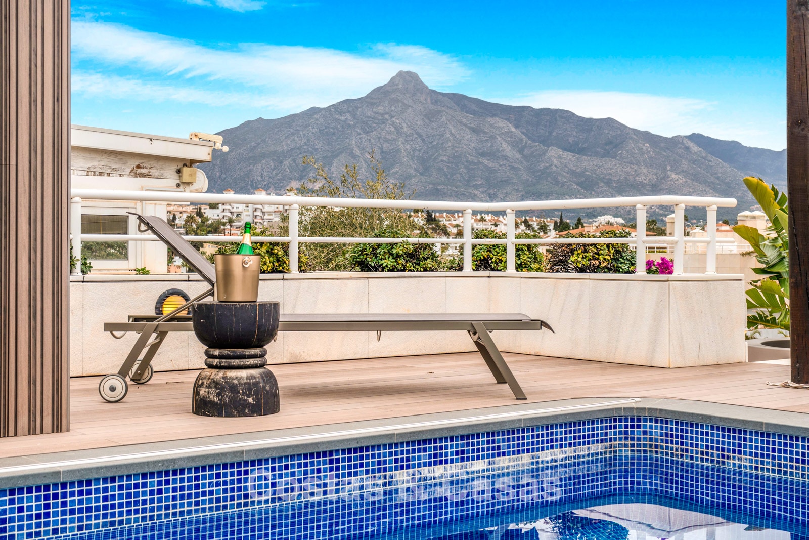 Penthouse en duplex. Entièrement rénové avec des matériaux de la meilleure qualité et des finitions luxueuses. Accessible par un ascenseur privé. Orientation sud-est. De vastes terrasses offrent beaucoup d'espace supplémentaire. Sur le solarium se trouvent une piscine chauffée et un coin lounge, avec vue panoramique sur les environs. Sur le solarium, il y a une partie qui peut être entièrement fermée par des rideaux de verre. Vous profiterez d'une vue panoramique sur les environs avec l'emblématique montagne La Concha et la mer Méditerranée en arrière-plan. L'intérieur respire une élégance intemporelle, avec des matériaux raffinés, des détails subtils et un équilibre harmonieux entre luxe et confort. De hautes fenêtres coulissantes se connectent parfaitement aux espaces extérieurs et permettent à la lumière naturelle de circuler en abondance. Espace de vie ouvert et confortable avec salon TV et cheminée. Cuisine entièrement équipée avec de nombreux rangements et un bar à petit-déjeuner. Espace repas intégré avec un mur à vin élégant. 4 chambres chacune avec sa salle de bain. Toutes les chambres s'ouvrent harmonieusement sur les vastes terrasses. La chambre principale bénéficie d'une salle de bain luxueuse avec douche à l'italienne. Sols carrelés grand format. Espace de rangement spacieux. Garage intérieur pour 2 voitures.