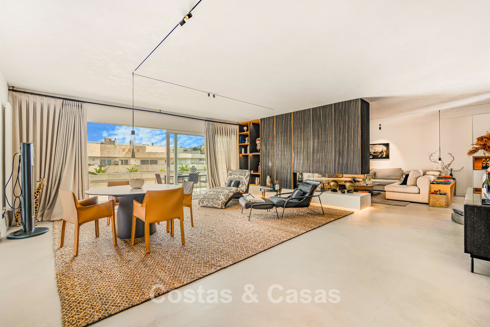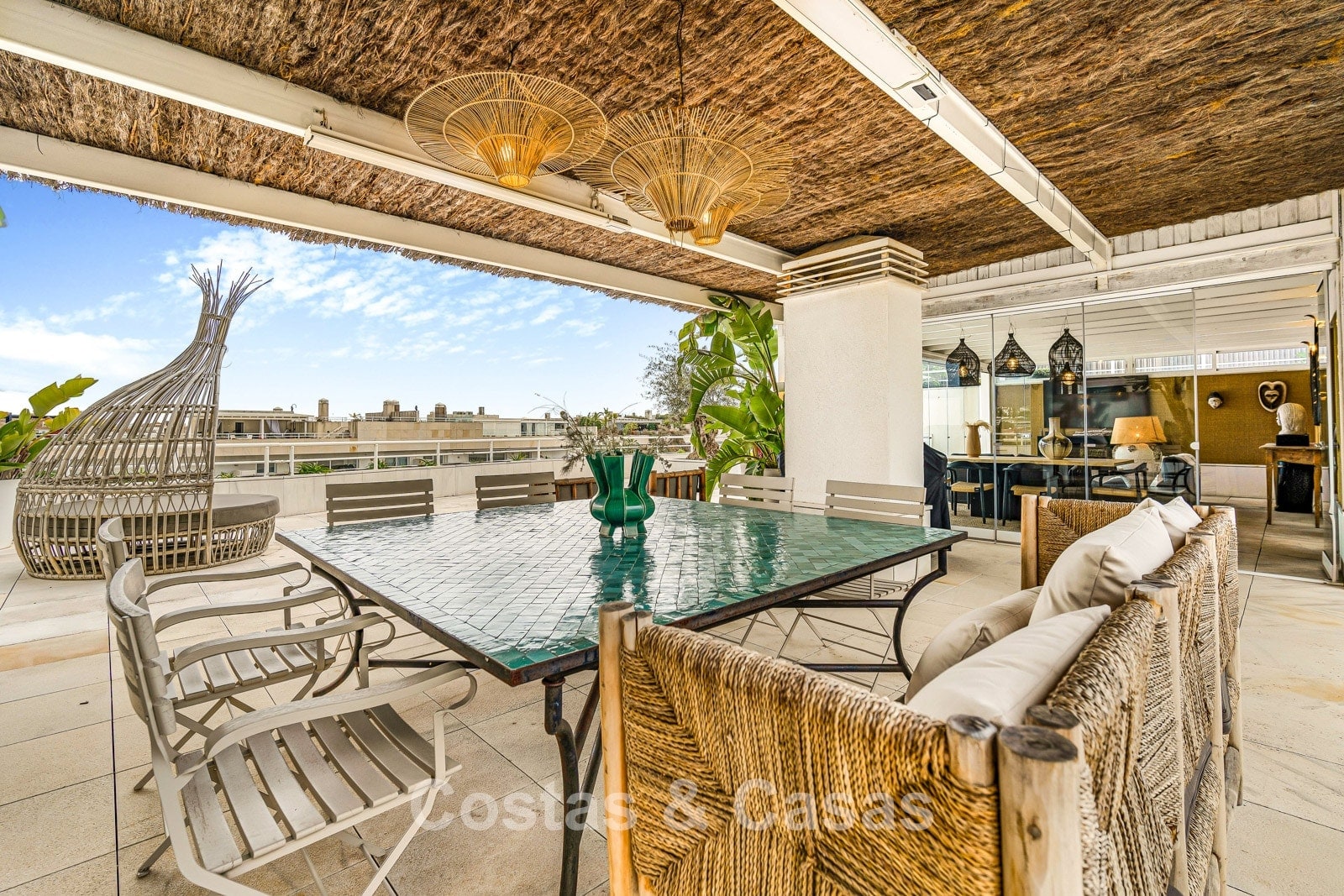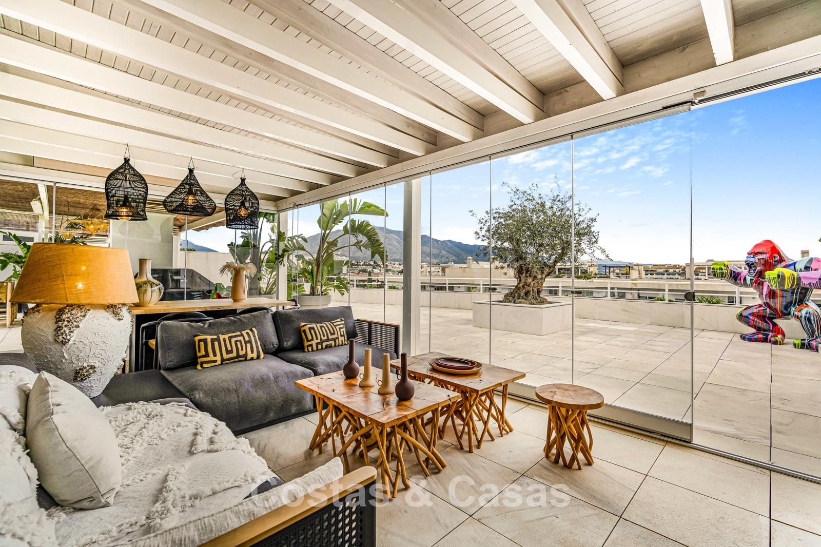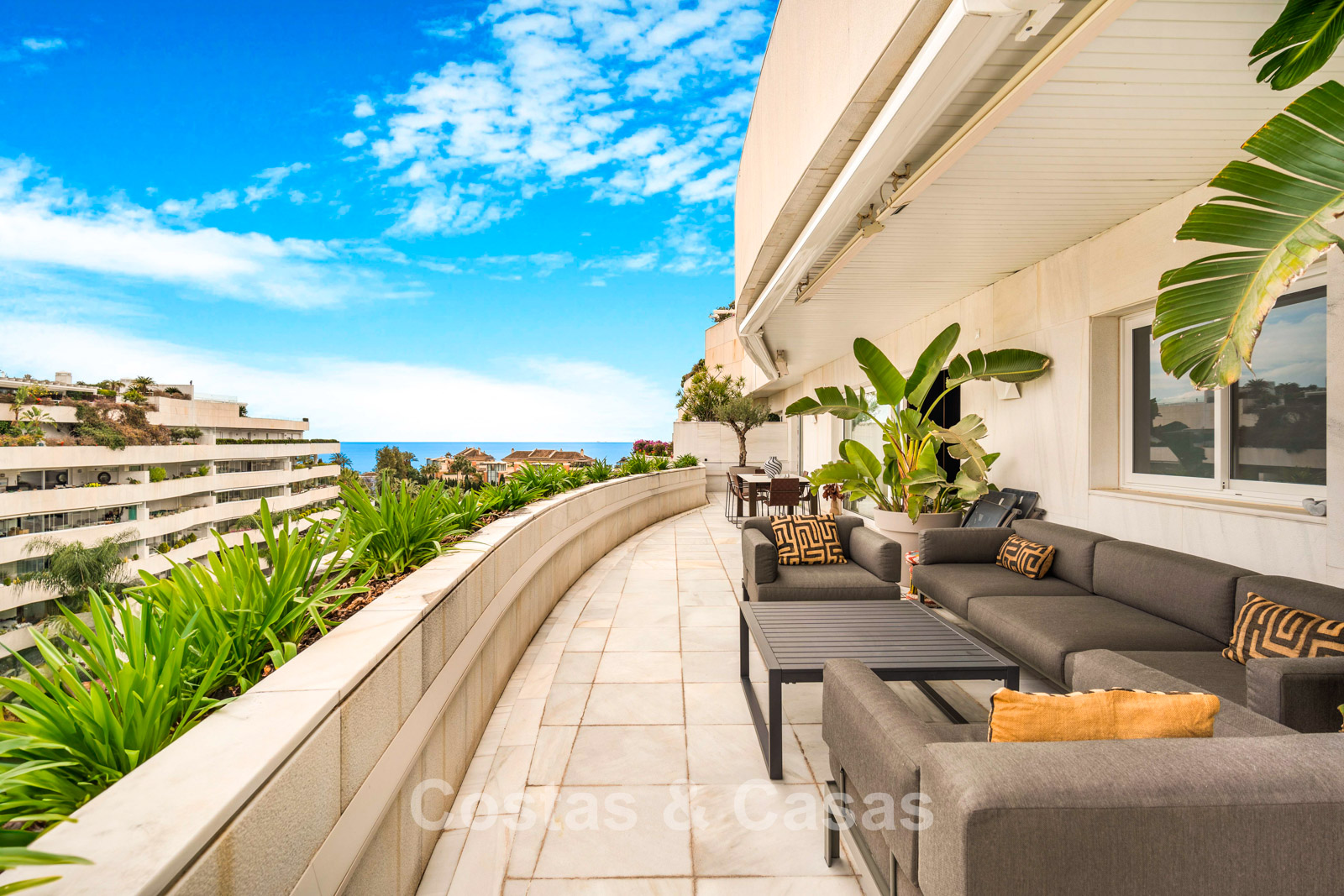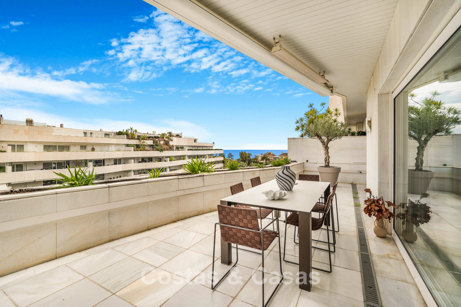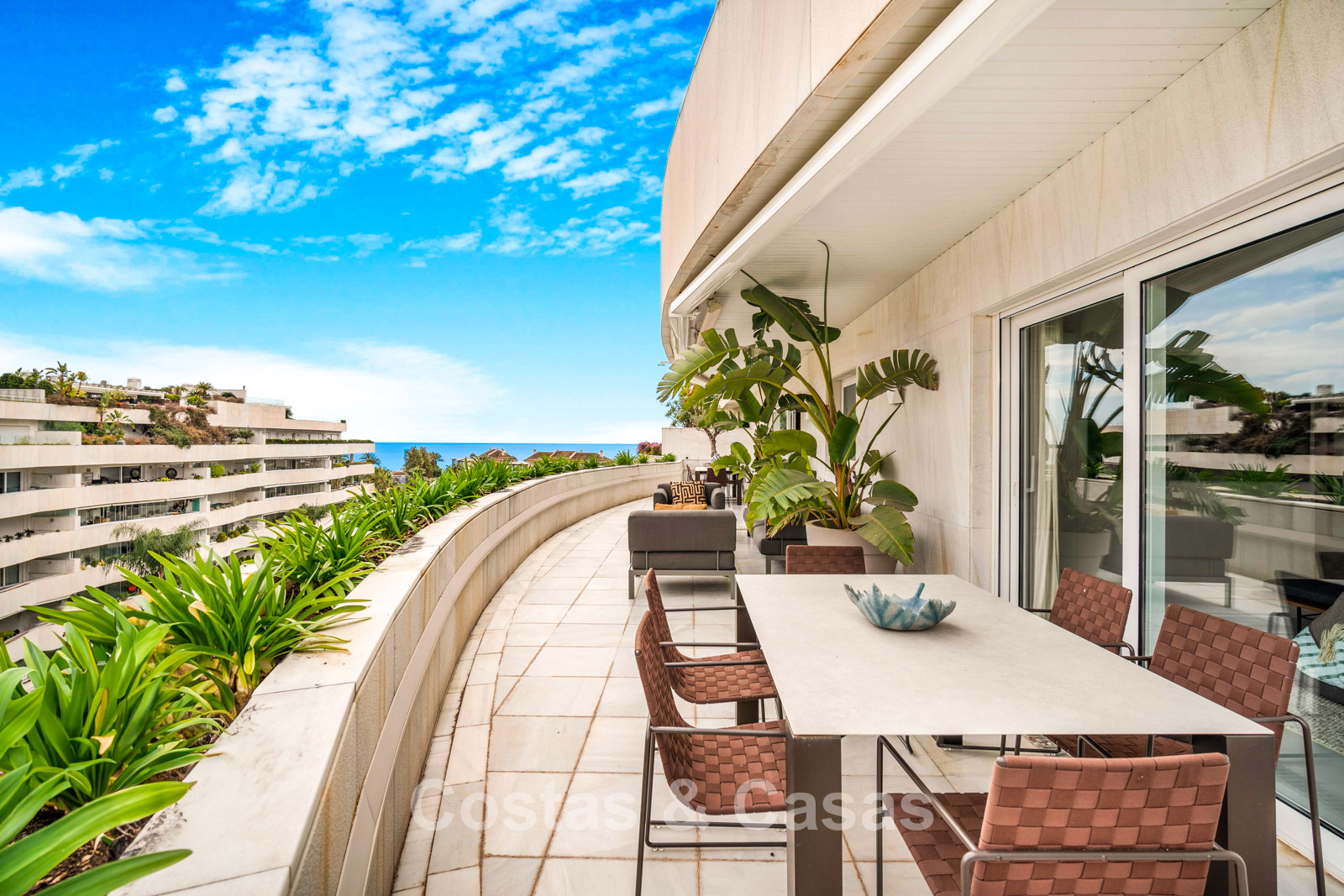 Penthouse en duplex. Entièrement rénové avec des matériaux de la meilleure qualité et des finitions luxueuses. Accessible par un ascenseur privé. Orientation sud-est. De vastes terrasses offrent beaucoup d'espace supplémentaire. Sur le solarium se trouvent une piscine chauffée et un coin lounge, avec vue panoramique sur les environs. Sur le solarium, il y a une partie qui peut être entièrement fermée par des rideaux de verre. Vous profiterez d'une vue panoramique sur les environs avec l'emblématique montagne La Concha et la mer Méditerranée en arrière-plan. L'intérieur respire une élégance intemporelle, avec des matériaux raffinés, des détails subtils et un équilibre harmonieux entre luxe et confort. De hautes fenêtres coulissantes se connectent parfaitement aux espaces extérieurs et permettent à la lumière naturelle de circuler en abondance. Espace de vie ouvert et confortable avec salon TV et cheminée. Cuisine entièrement équipée avec de nombreux rangements et un bar à petit-déjeuner. Espace repas intégré avec un mur à vin élégant. 4 chambres chacune avec sa salle de bain. Toutes les chambres s'ouvrent harmonieusement sur les vastes terrasses. La chambre principale bénéficie d'une salle de bain luxueuse avec douche à l'italienne. Sols carrelés grand format. Espace de rangement spacieux. Garage intérieur pour 2 voitures.