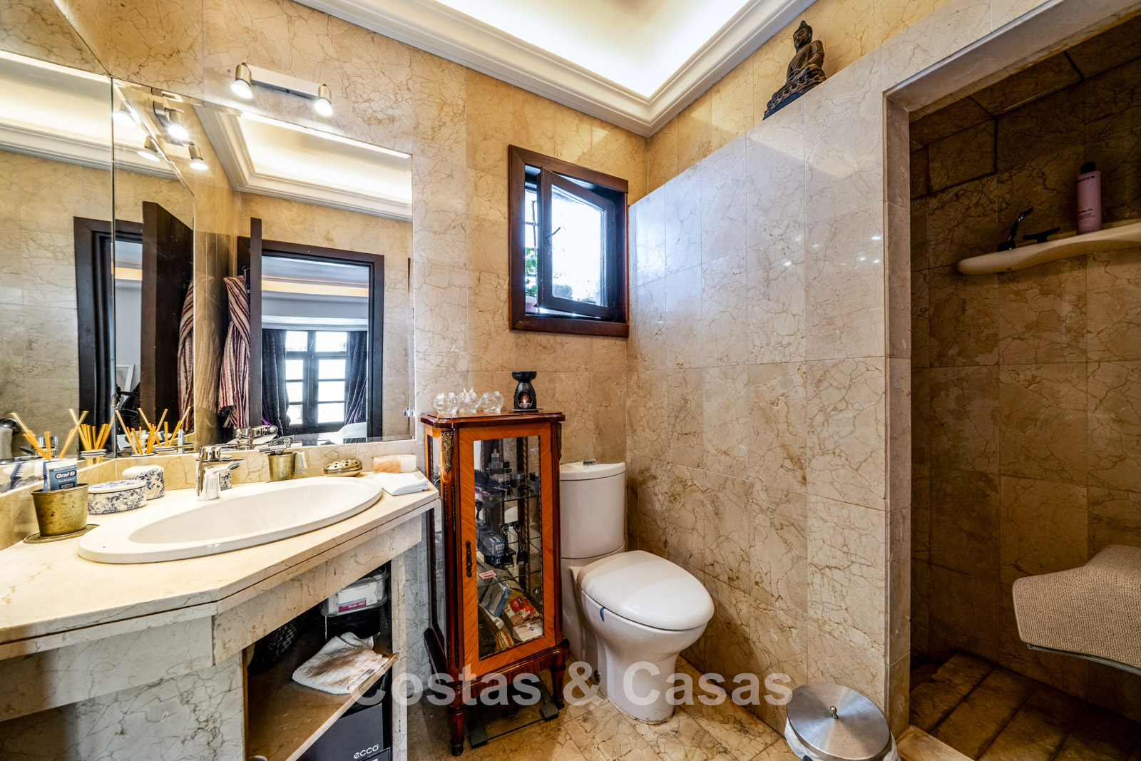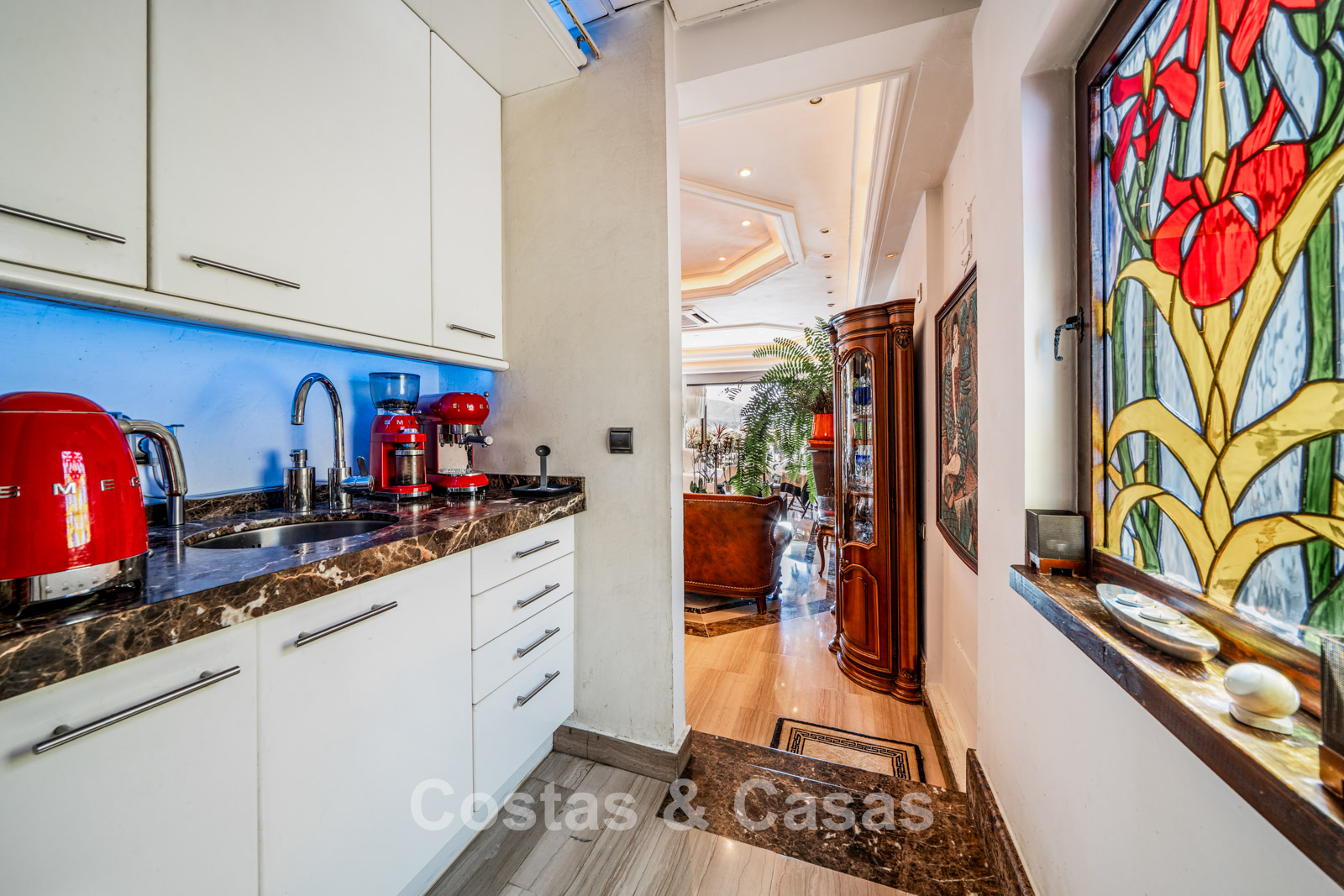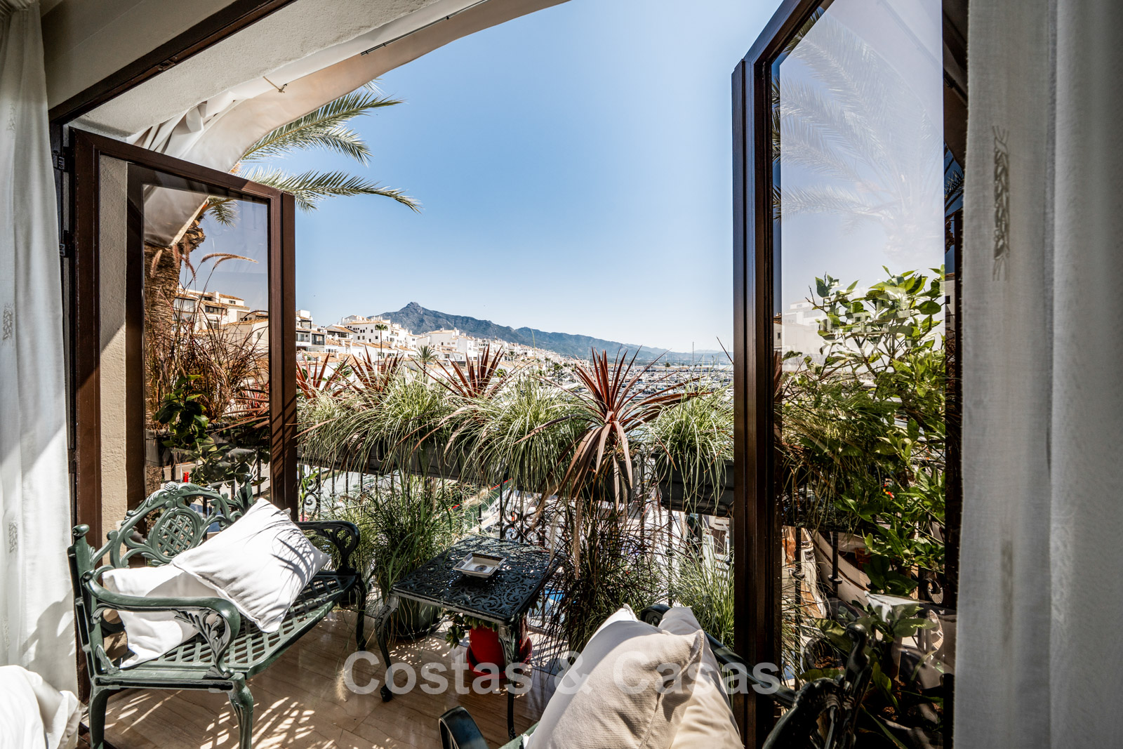 Spacieux appartement en duplex dans un complexe résidentiel pittoresque à l'architecture andalouse. Vues imprenables sur la mer, le port et la montagne de La Concha. La propriété, disposant d'une licence commerciale, offre une opportunité rare dans l'un des quartiers les plus exclusifs et recherchés de Marbella. L'espace privé est situé au dernier étage. Possibilité de créer une terrasse sur le toit de 35 m². Intérieur charmant et ouvert. Cuisine pratique et entièrement équipée avec des appareils électroménagers haut de gamme et un bar. 3 chambres, 3 salles de bains et toilette séparée. Sols en marbre.