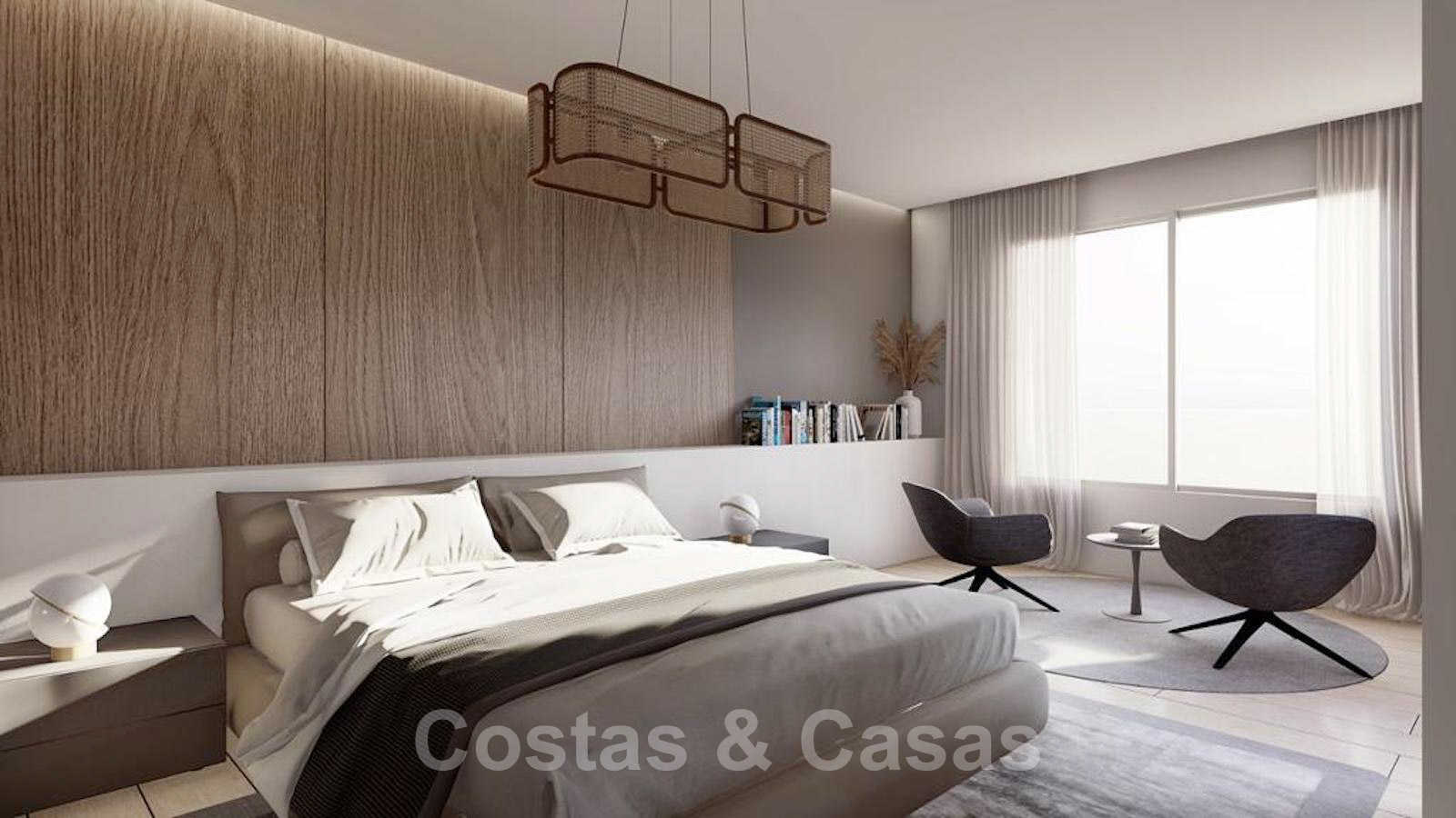 Chambre principale spacieuse avec dressing de style boutique, coin salon et terrasse privée.