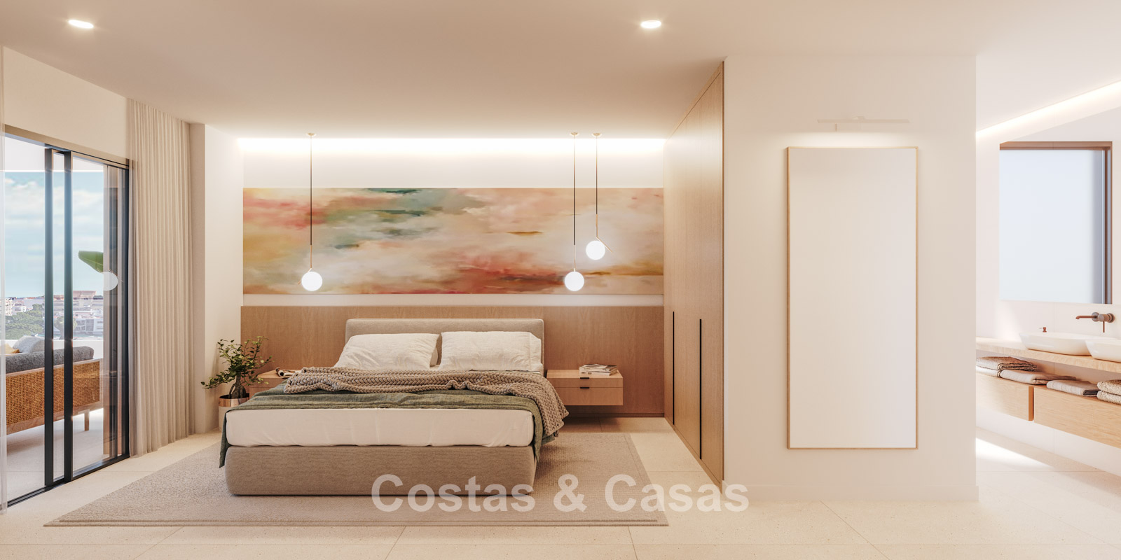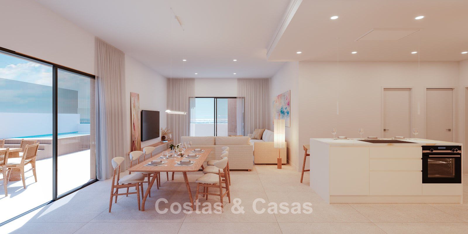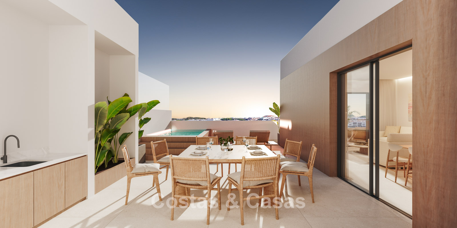 Appartements neufs à l’architecture avant-gardiste. Matériaux haut de gamme et finitions raffinées. Les penthouses bénéficient d’une spacieuse terrasse sur le toit avec piscine privée. Des terrasses accueillantes offrent un espace détente. De hautes baies vitrées coulissantes avec profilés encastrés dans le séjour laissent entrer la lumière naturelle. Mobilier contemporain et espace ouvert. Cuisines allemandes entièrement équipées avec îlot central. 2 ou 3 chambres, 2 salles de bain. Débarras. Garage privé intérieur.